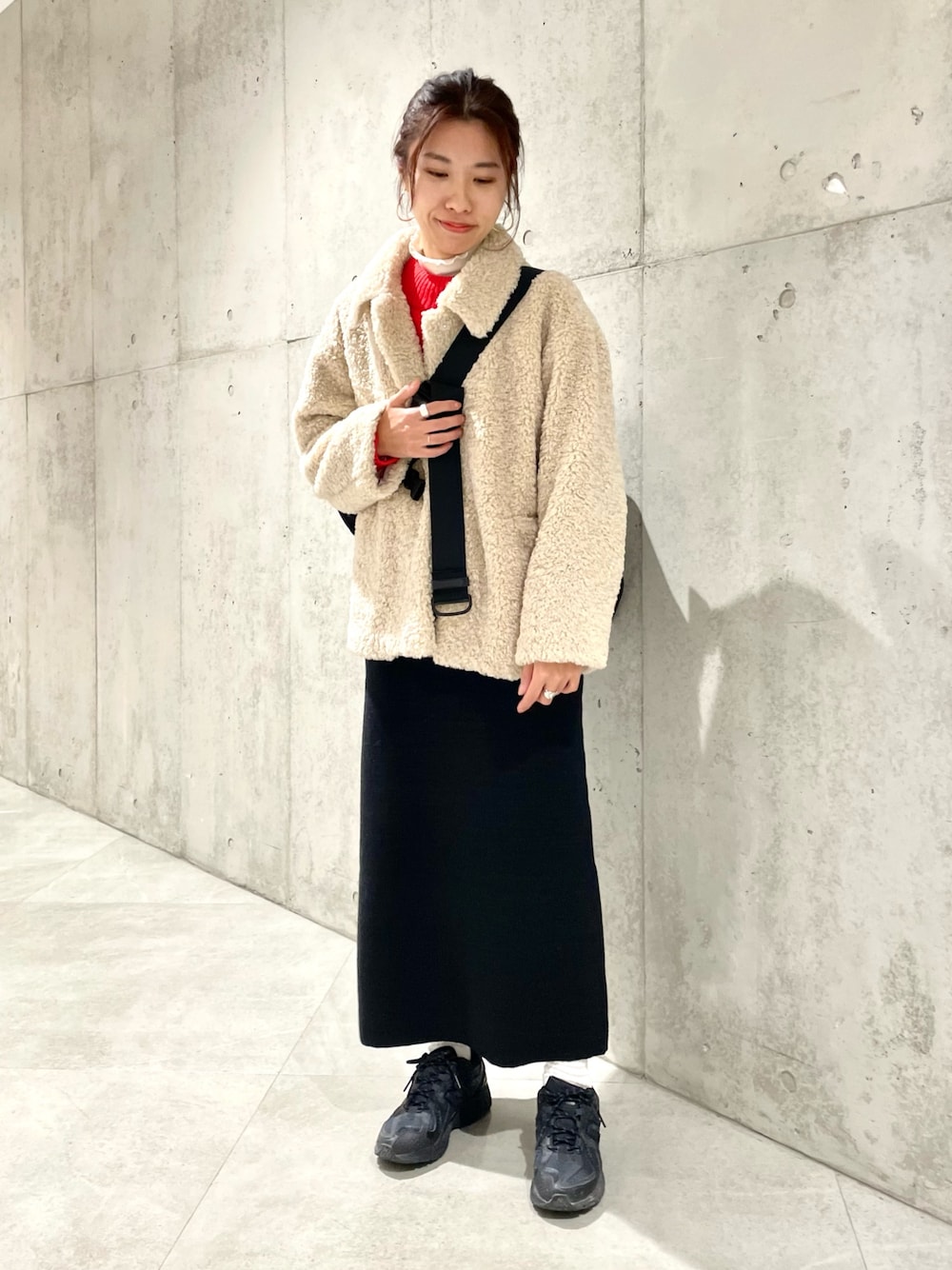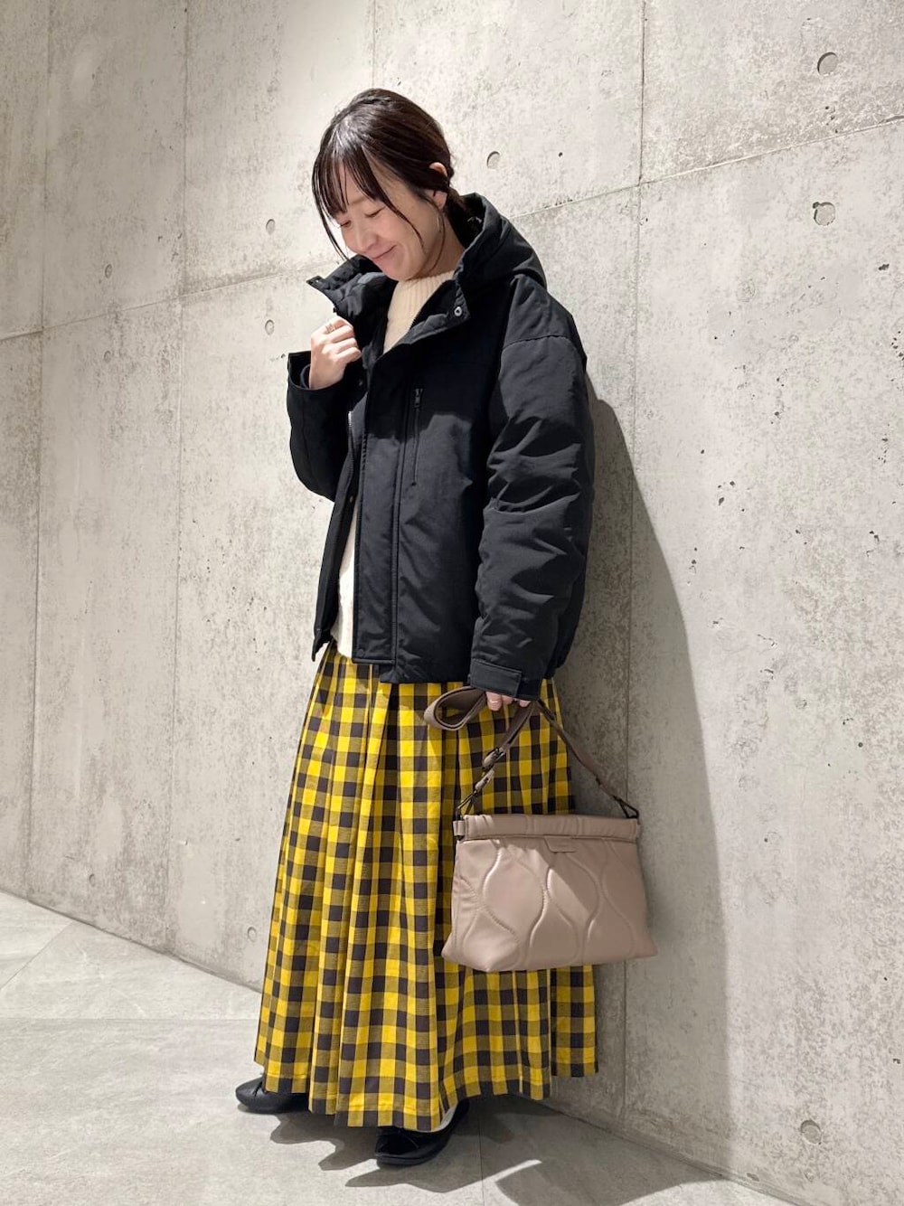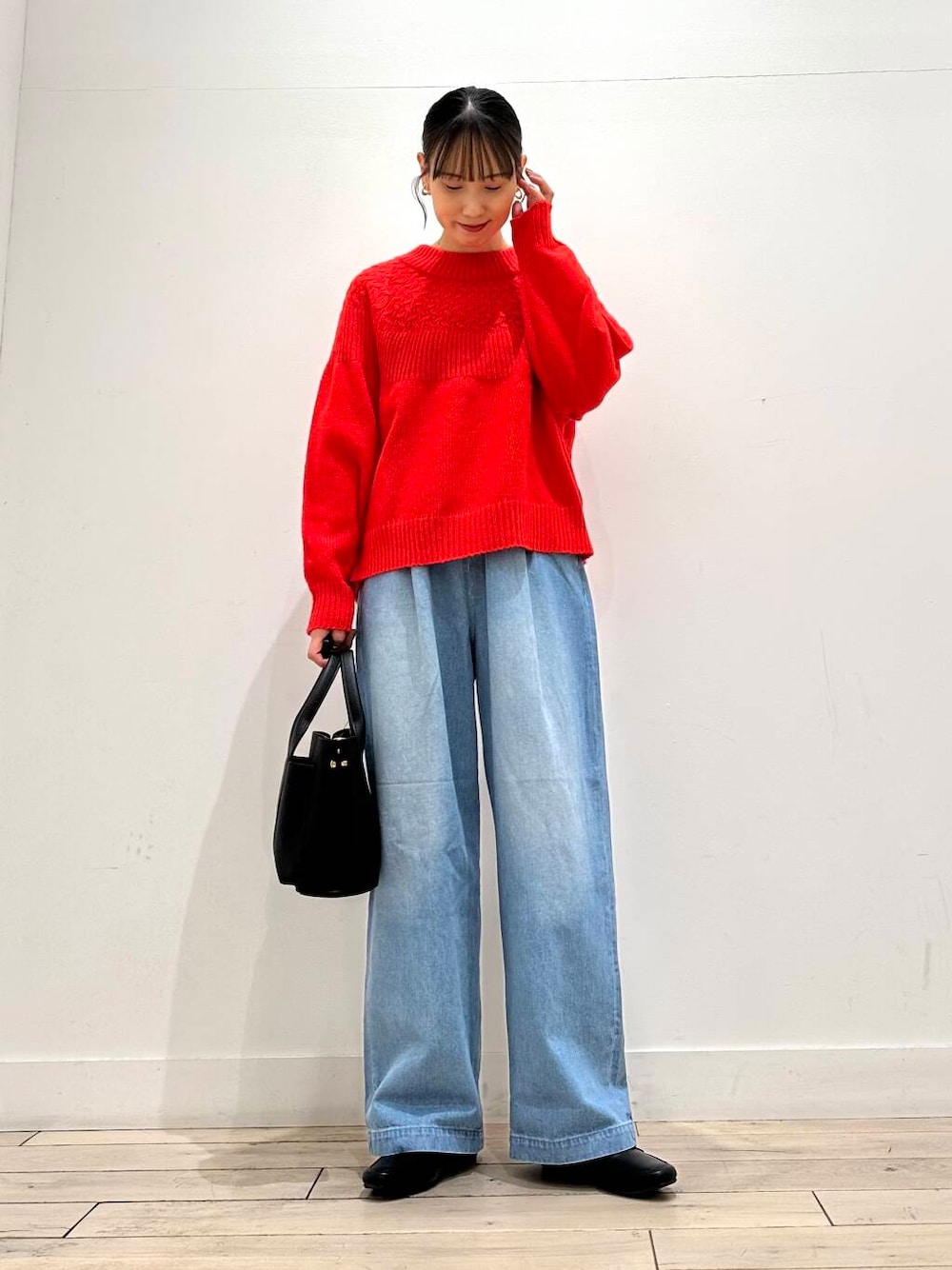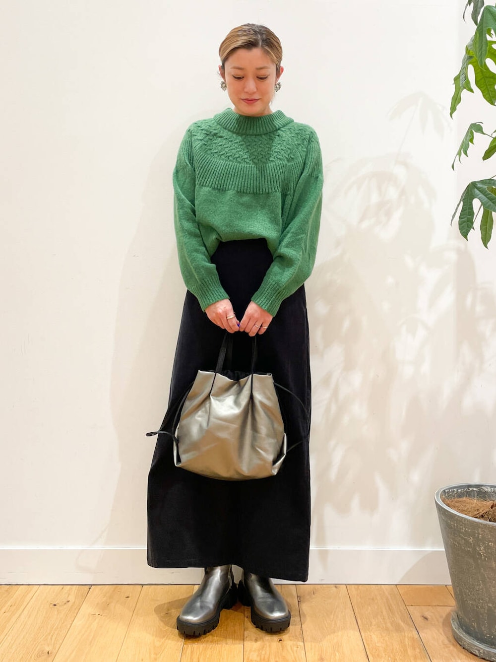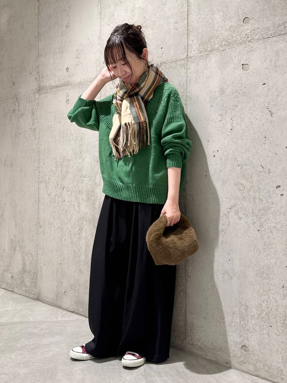 ニットにデザインがあるのでボトムはシンプルでも決まりますが、チェックスカートなど柄物との合わせもおすすめです。