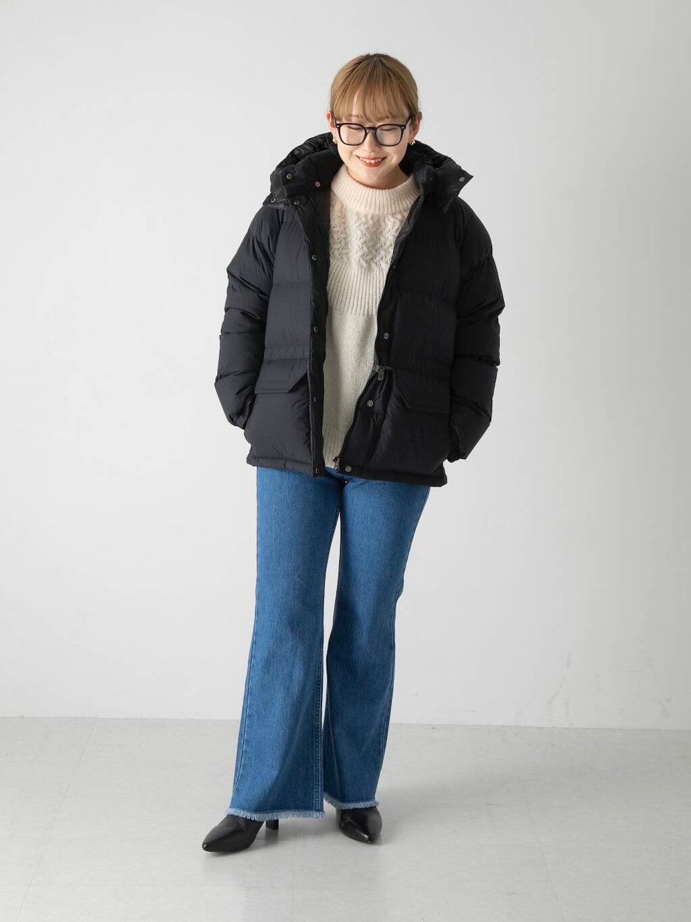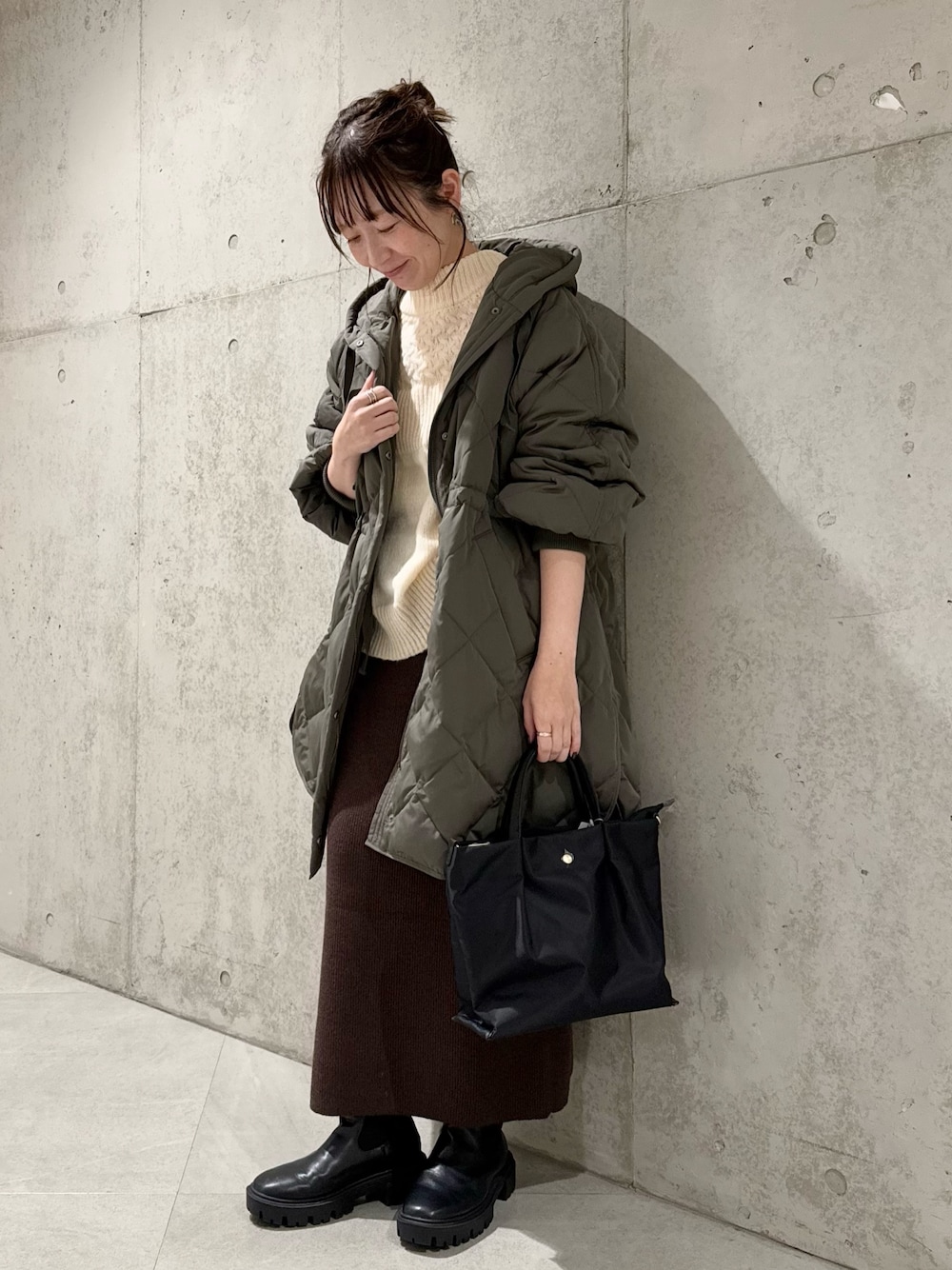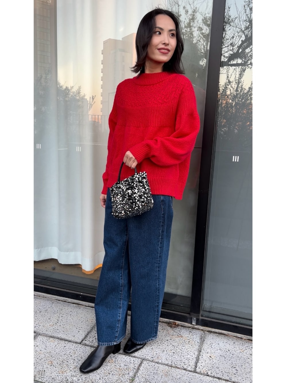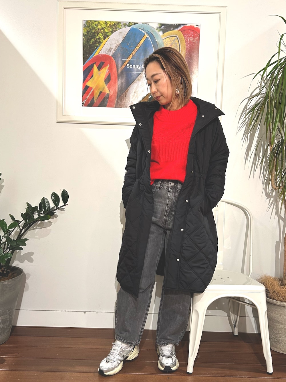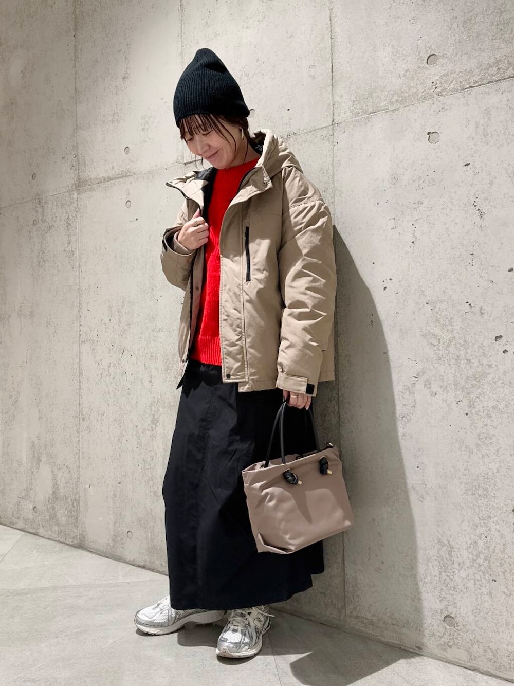 ニットにデザインがあるのでボトムはシンプルでも決まりますが、チェックスカートなど柄物との合わせもおすすめです。