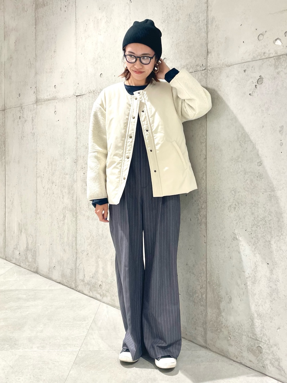 タートルネックと好相性。パンツはすとんと落ちる生地感なので、袖に特徴のあるトップスと合わせてもバランスよく着ていただけます。