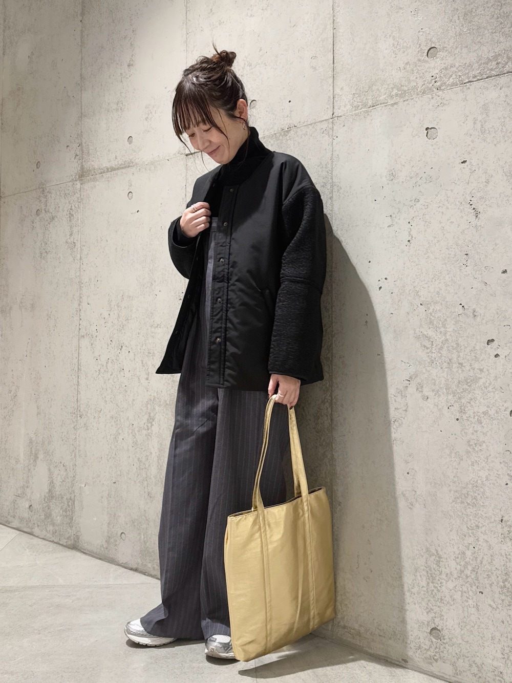 タートルネックと好相性。パンツはすとんと落ちる生地感なので、袖に特徴のあるトップスと合わせてもバランスよく着ていただけます。
