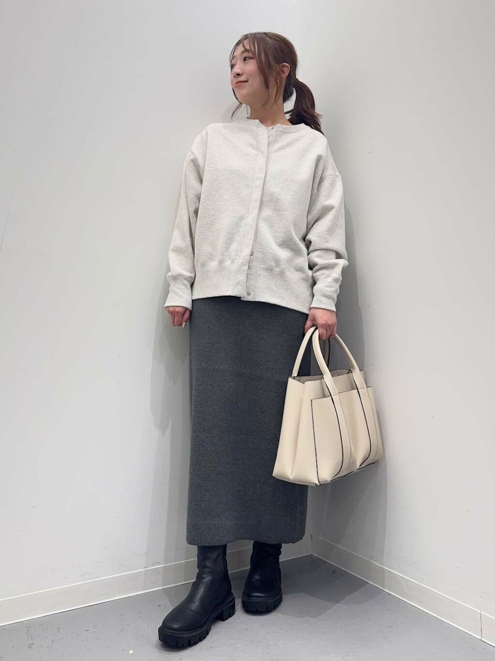 タイトなシルエットはオーバーサイズのトップスと好相性◎スウェットと合わせても女性らしさを演出できます。