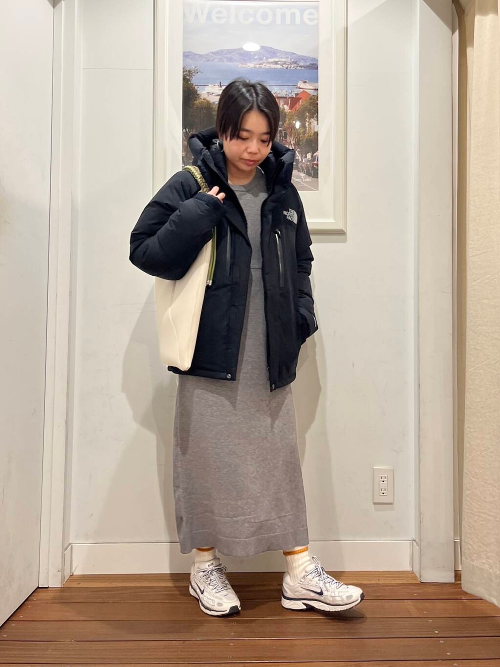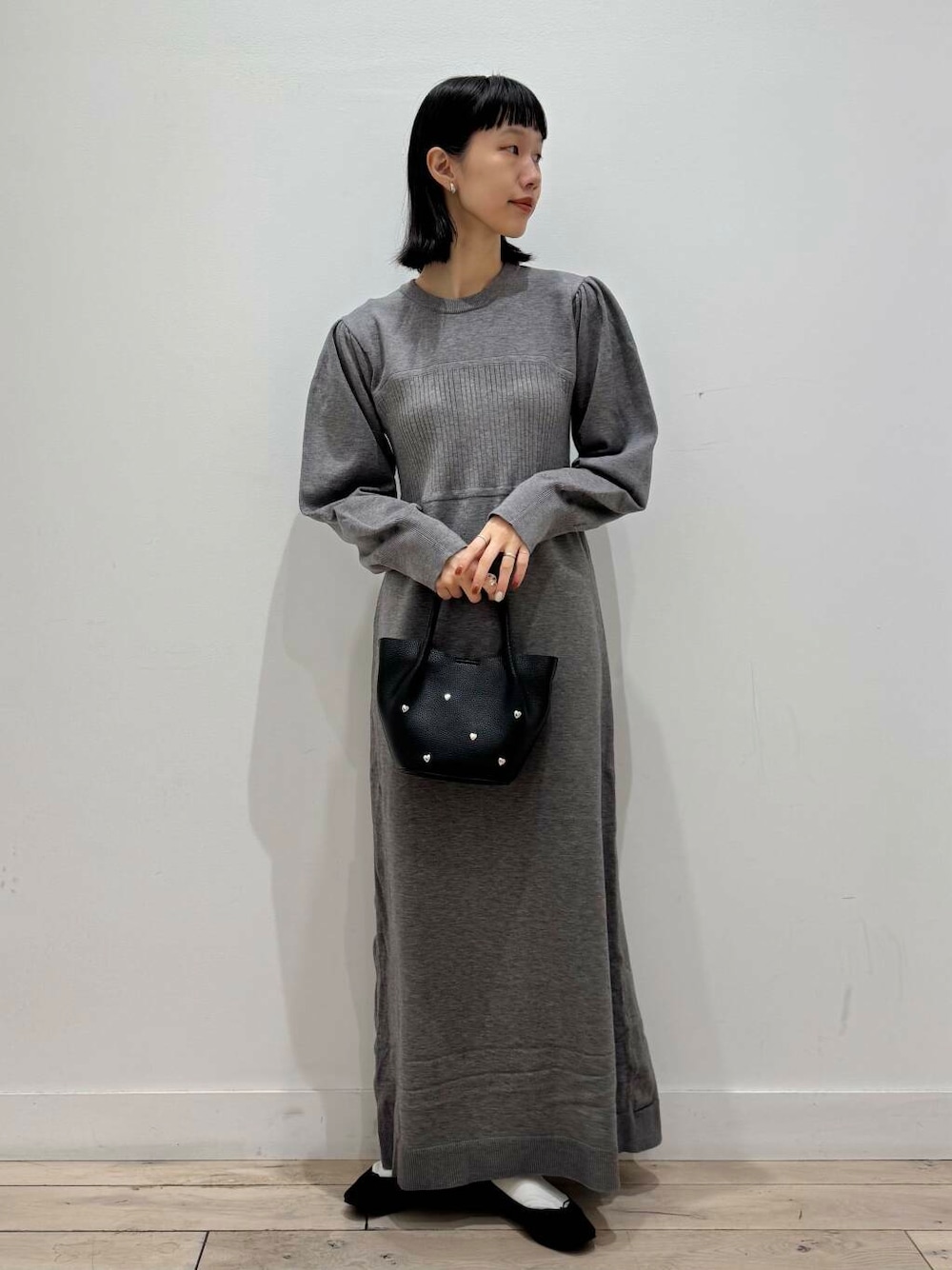 一枚でさらっと着ていただくのがおすすめ。女性らしい雰囲気のワンピースなので足元はブーツが好相性◎