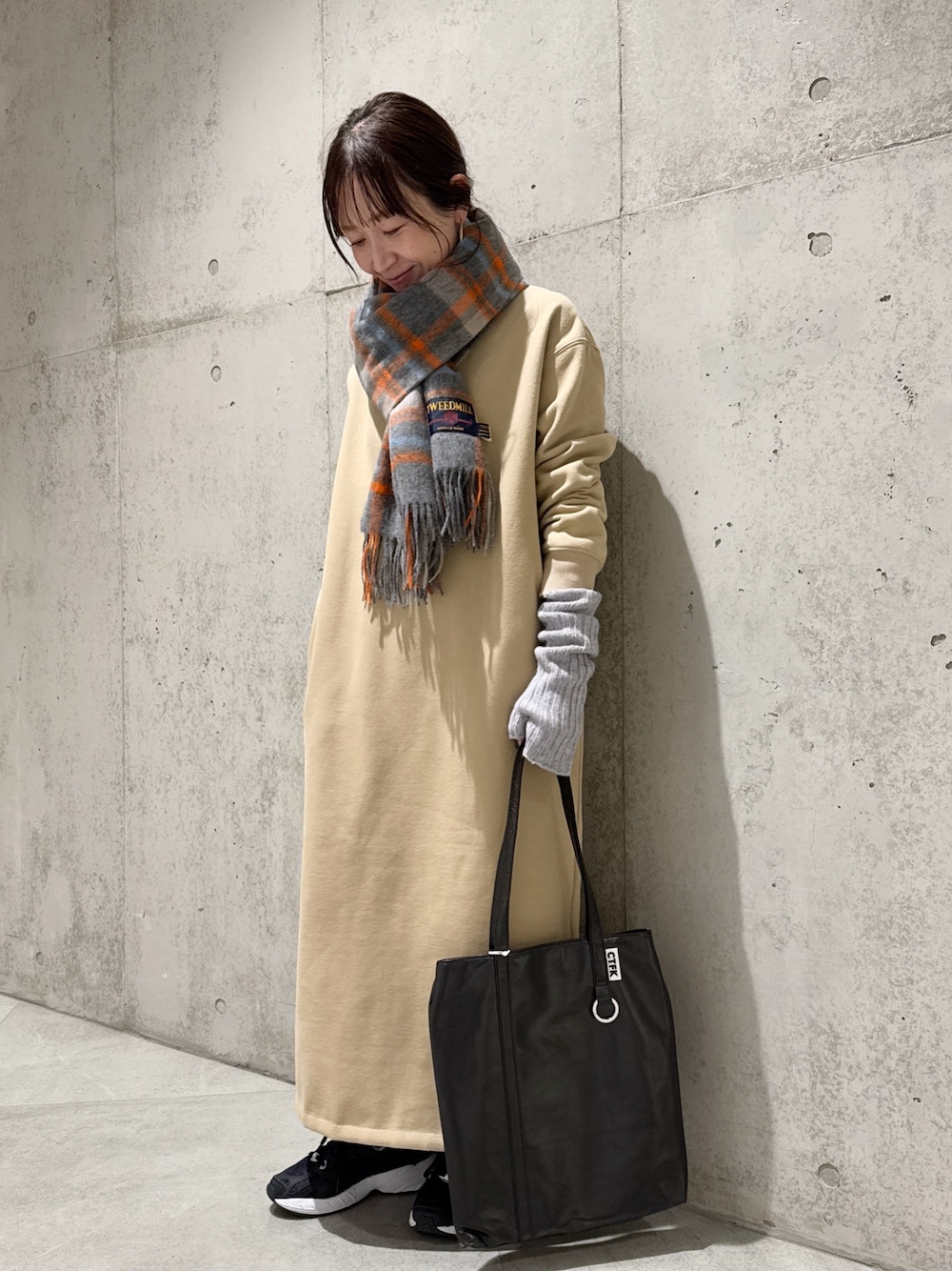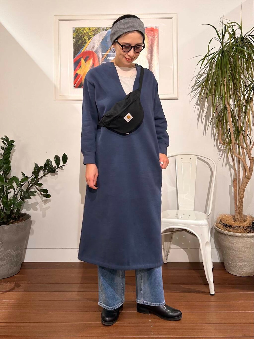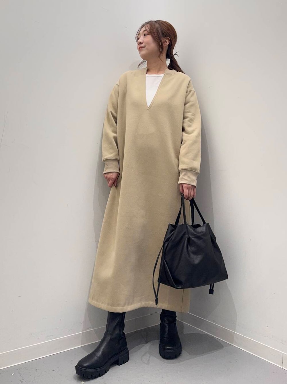 ロングブーツと合わせて一枚はもちろん、パンツとのレイヤードもおすすめ。インナーにロゴTを合わせ、ロゴのチラ見せも◎肉厚なアイテムなのでタートルネックはシアー系のものを合わせると抜け感が出ます。