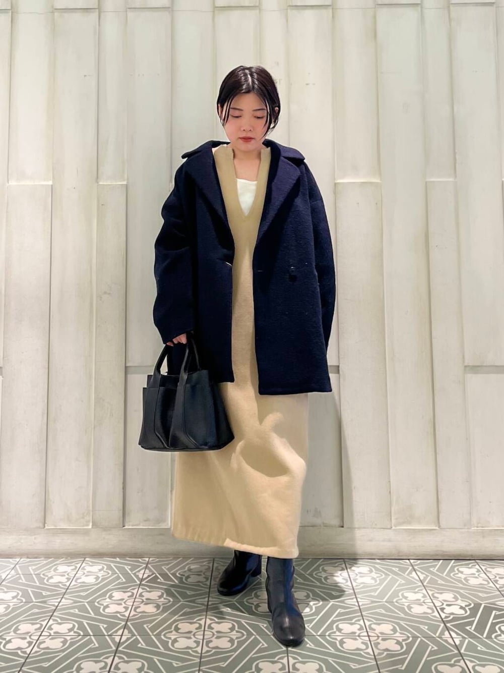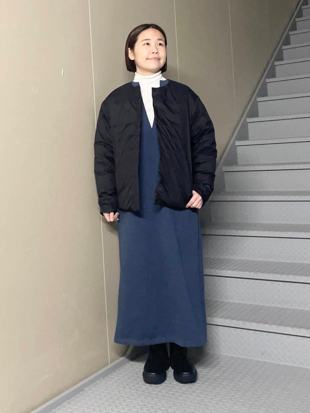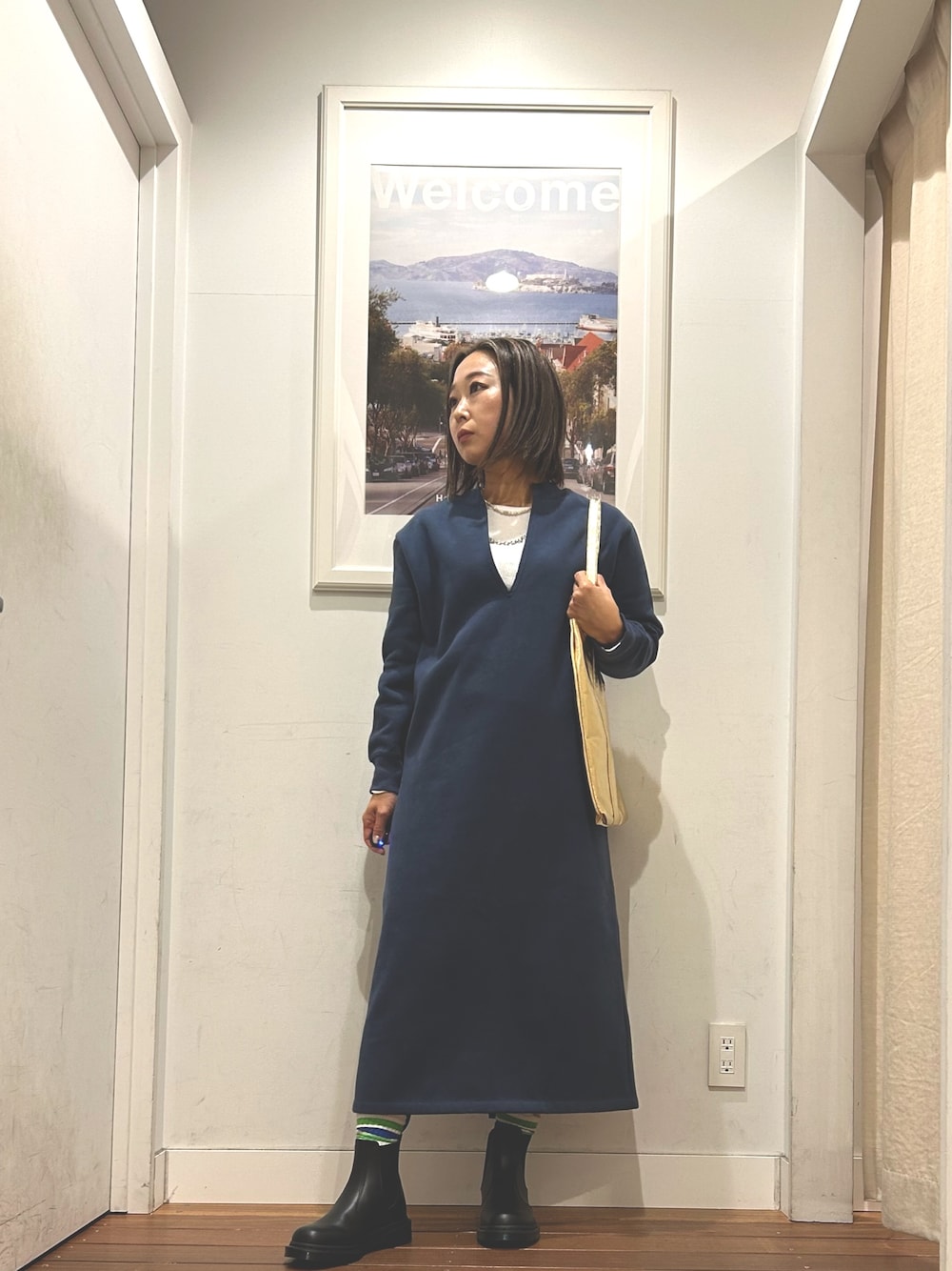 ロングブーツと合わせて一枚はもちろん、パンツとのレイヤードもおすすめ。インナーにロゴTを合わせ、ロゴのチラ見せも◎肉厚なアイテムなのでタートルネックはシアー系のものを合わせると抜け感が出ます。