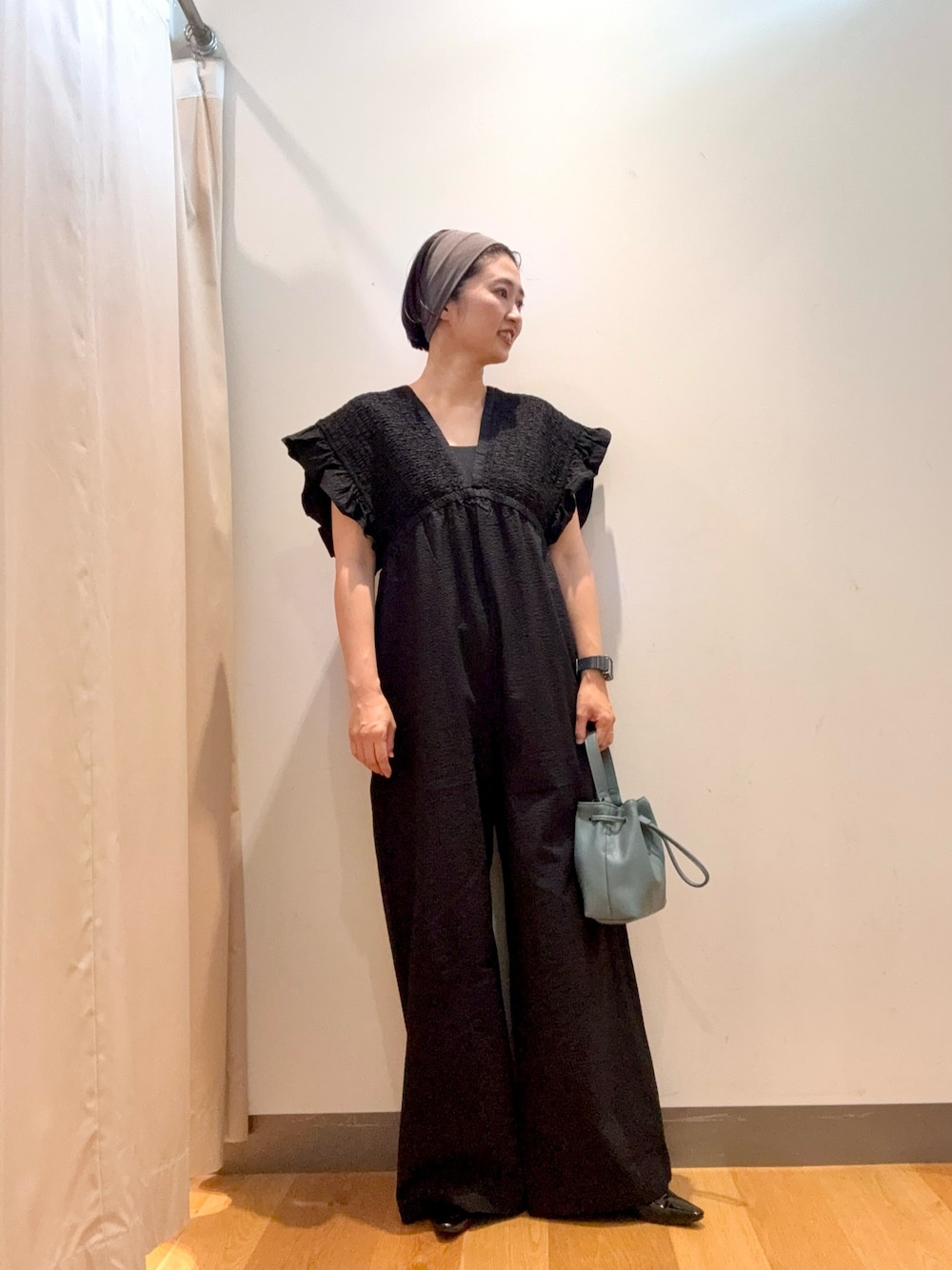 袖にボリュームがあるので、インナーはキャミソールやタンクトップと合わせて首元をすっきりとさせるのがおすすめ。