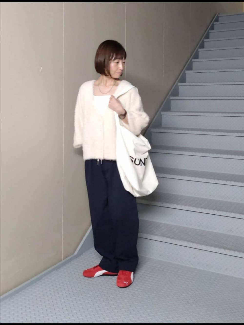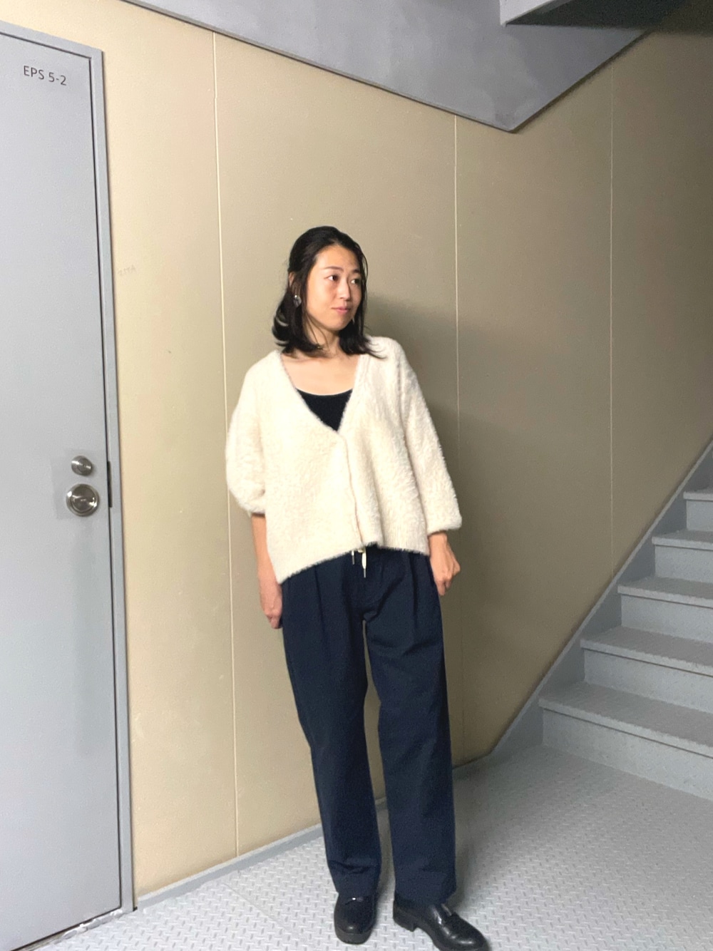 太めのワイドテーパードシルエットやウエストの紐ベルトでトレンド要素を加えました。