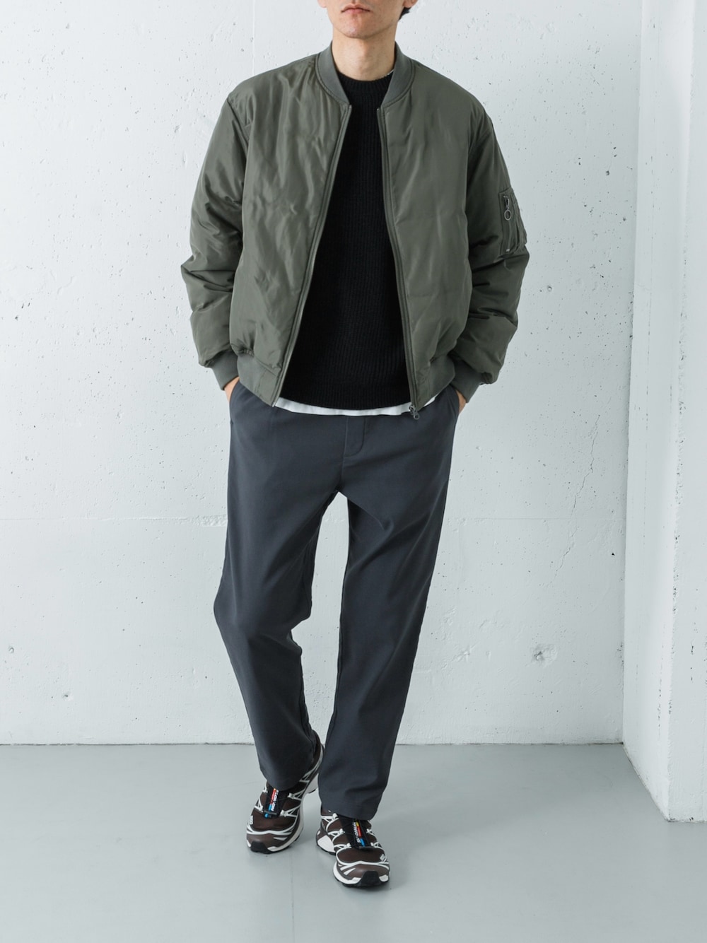 細身の裾まわりはミニマムなブーツやスニーカーとの相性が良く、足元をすっきり見せつつ冷え対策もできるため、日常使いにとても便利。