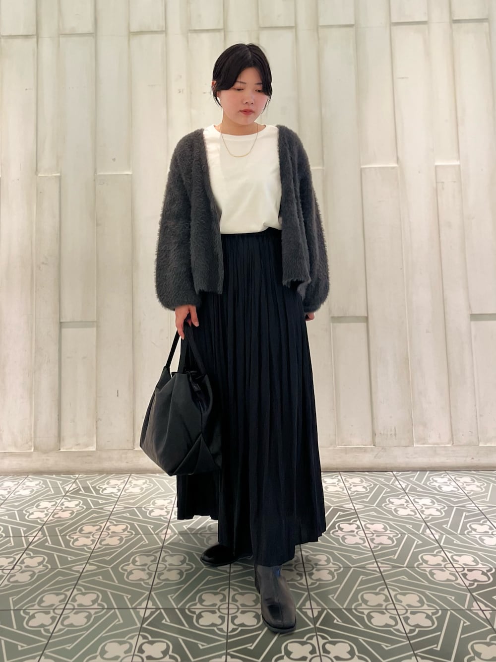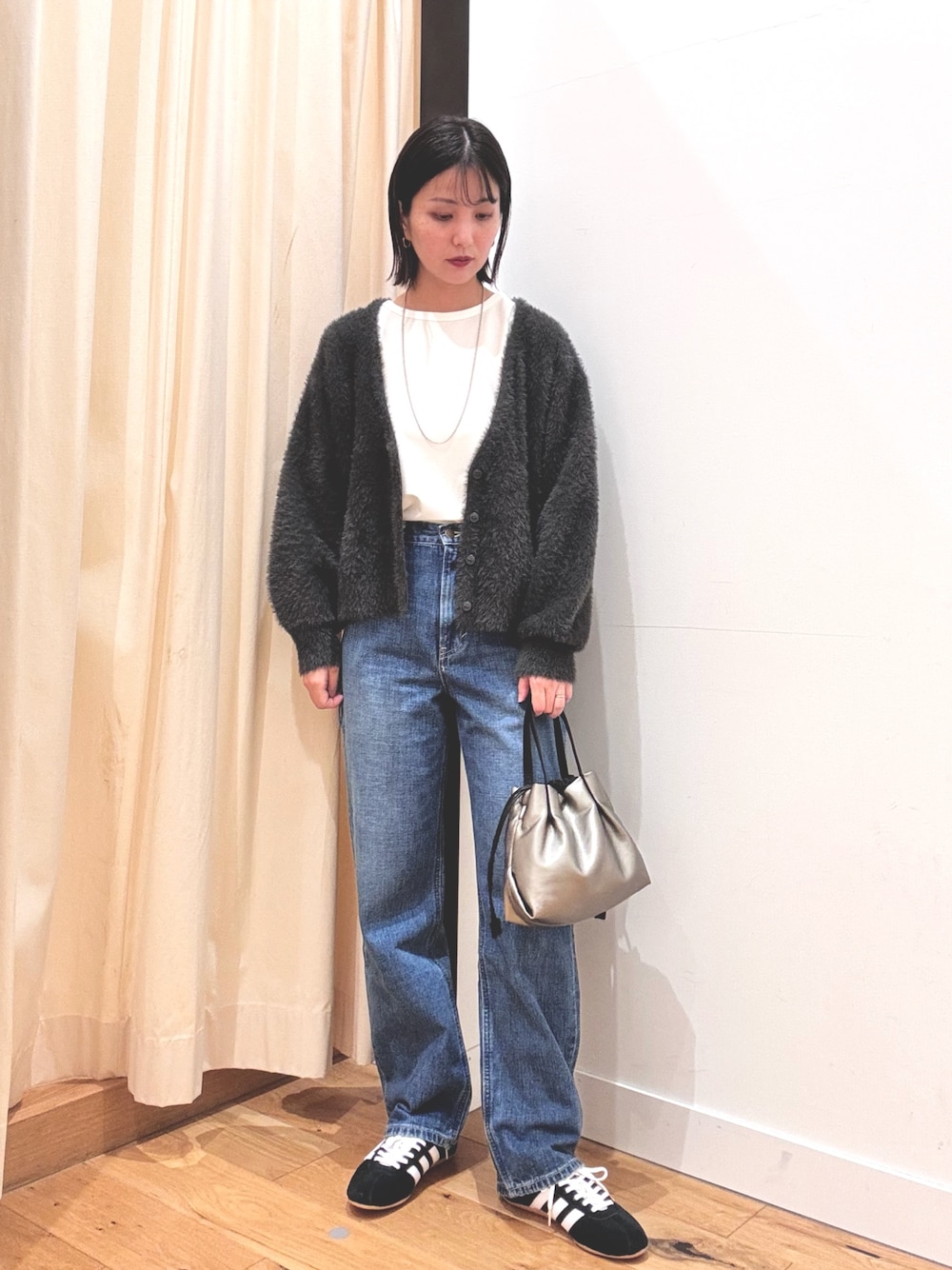 ショート丈なのでバランスがとりやすく、ワイドパンツやワンピースなどアイテムを選びません。