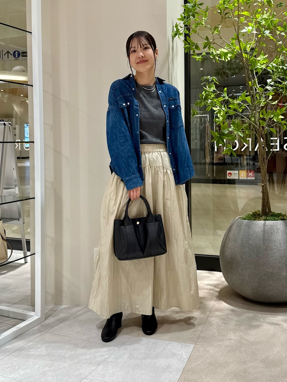程よいサイズ感とシルエットでスカートはもちろん、ワイドパンツとの相性も◎インナーはすっきりとしたデザインのものがおすすめです。
