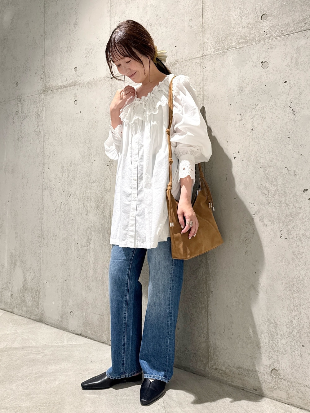 一方、リボンをゆるく垂らして着ると、ざっくりとした開きのオフショルダー風にアレンジでき、甘さを抑えた抜け感のあるスタイルにも。