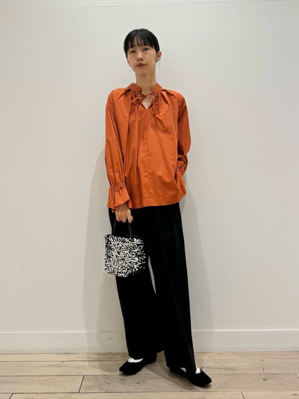 ステッチを効かせた、シャープな衿がポイントのボリュームシャツブラウス。ネックラインのリボンは、結ばず垂らしても様になるデザインです。袖口には目を惹くキャンディースリーブを採用し、ゴム仕様のため袖丈調節が可能◎着回し力の高い前後2WAY対応で、気分によって着こなしを楽しめます。ブラウス主役のパンツスタイルはもちろん、ビスチェやジャンパースカートとのレイヤードスタイルもお勧め。
