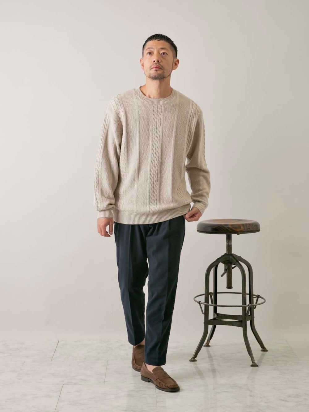 ミドルゲージのしっかりとした中肉生地をベーシックなケーブル編みに仕上げ、シンプルながらも表情豊かなデザインとなっております。