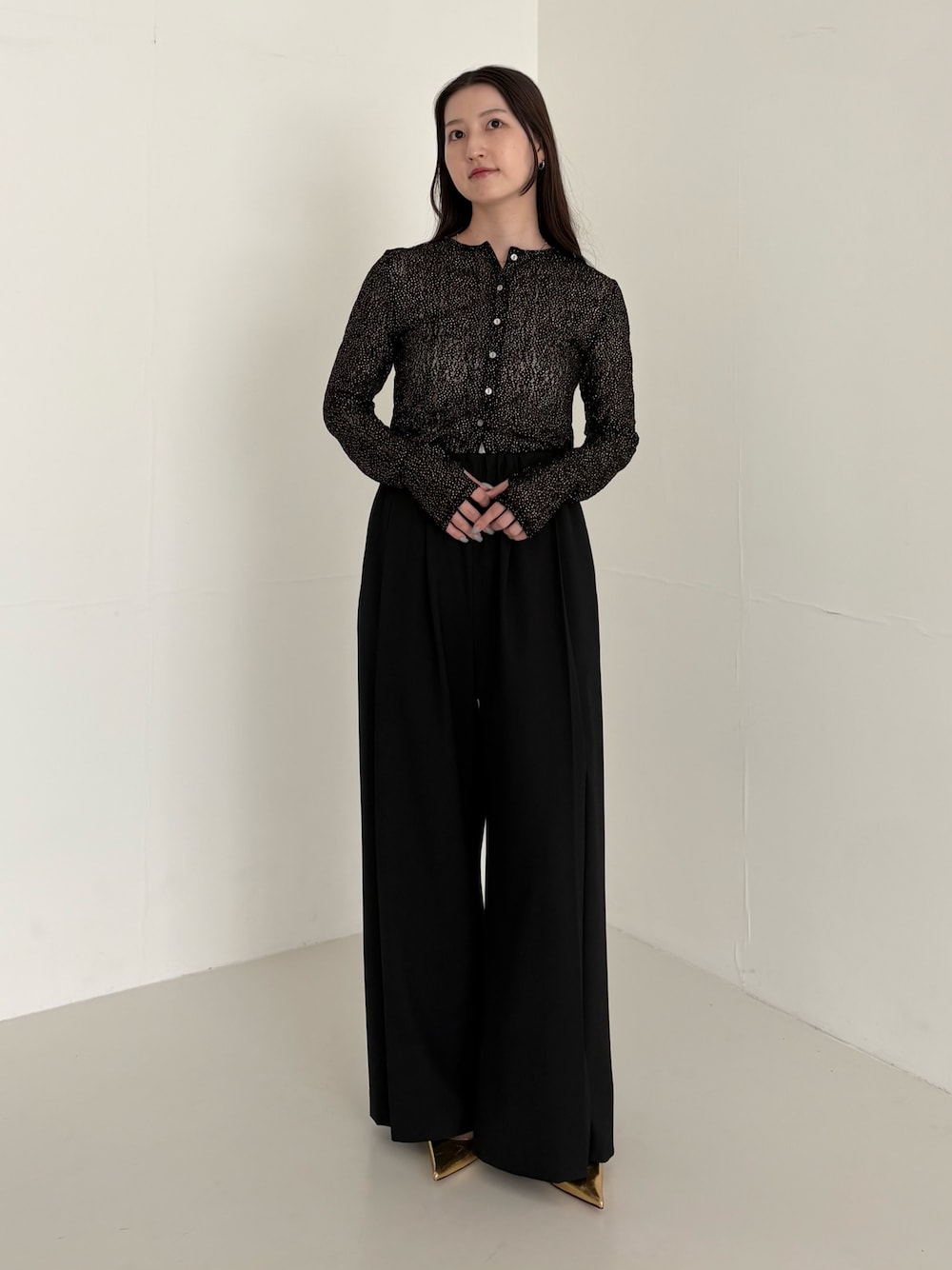 繊細なレースにあしらったラメがさりげなく輝く、華やかなカットソー。長めのお袖と身体に沿うコンパクトなシルエットが女性らしさを引き立てます。程よいシアー感が軽やかで、抜け感をプラス。釦を開けてヘルシーに、閉めてボトムにインしたりと、釦の開け具合によって雰囲気を変えられるのもポイントです。デニムやワイドパンツなどと相性が良く、合わせるだけで旬なスタイリングが完成する一着です。