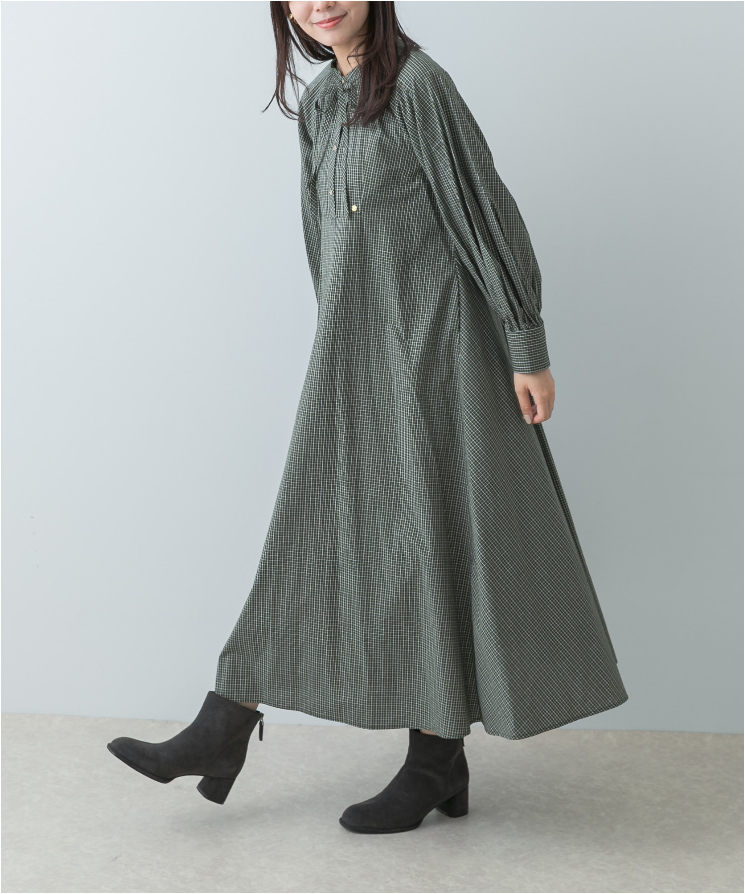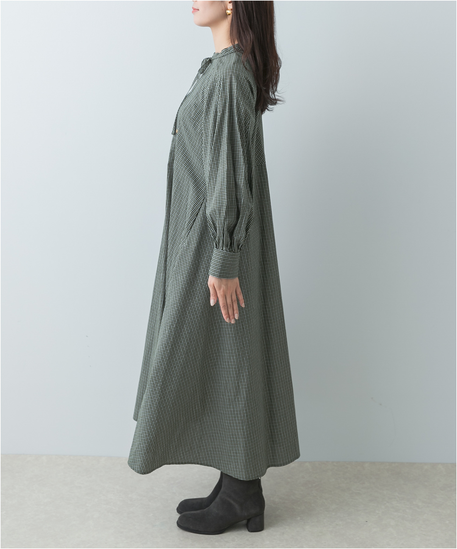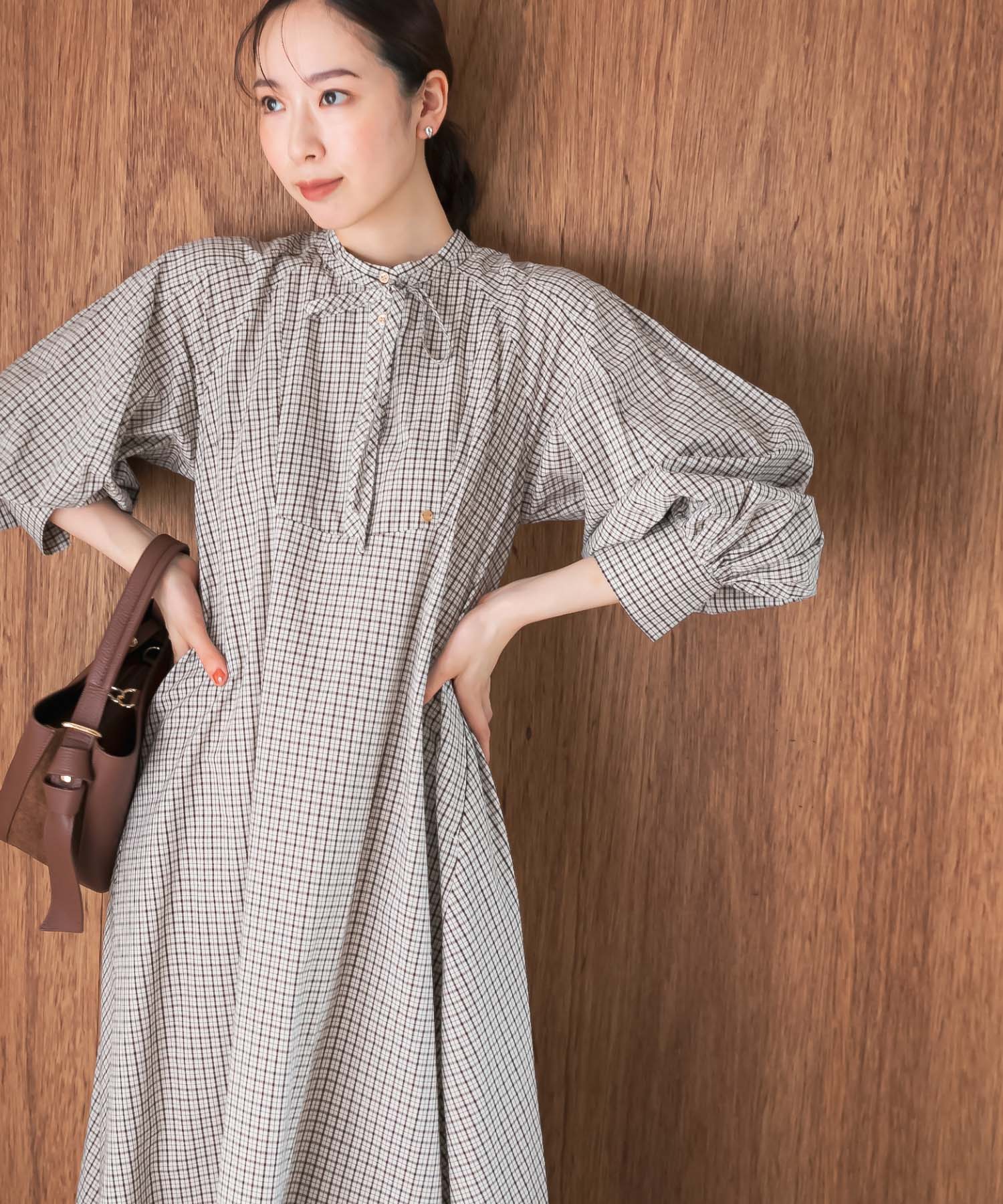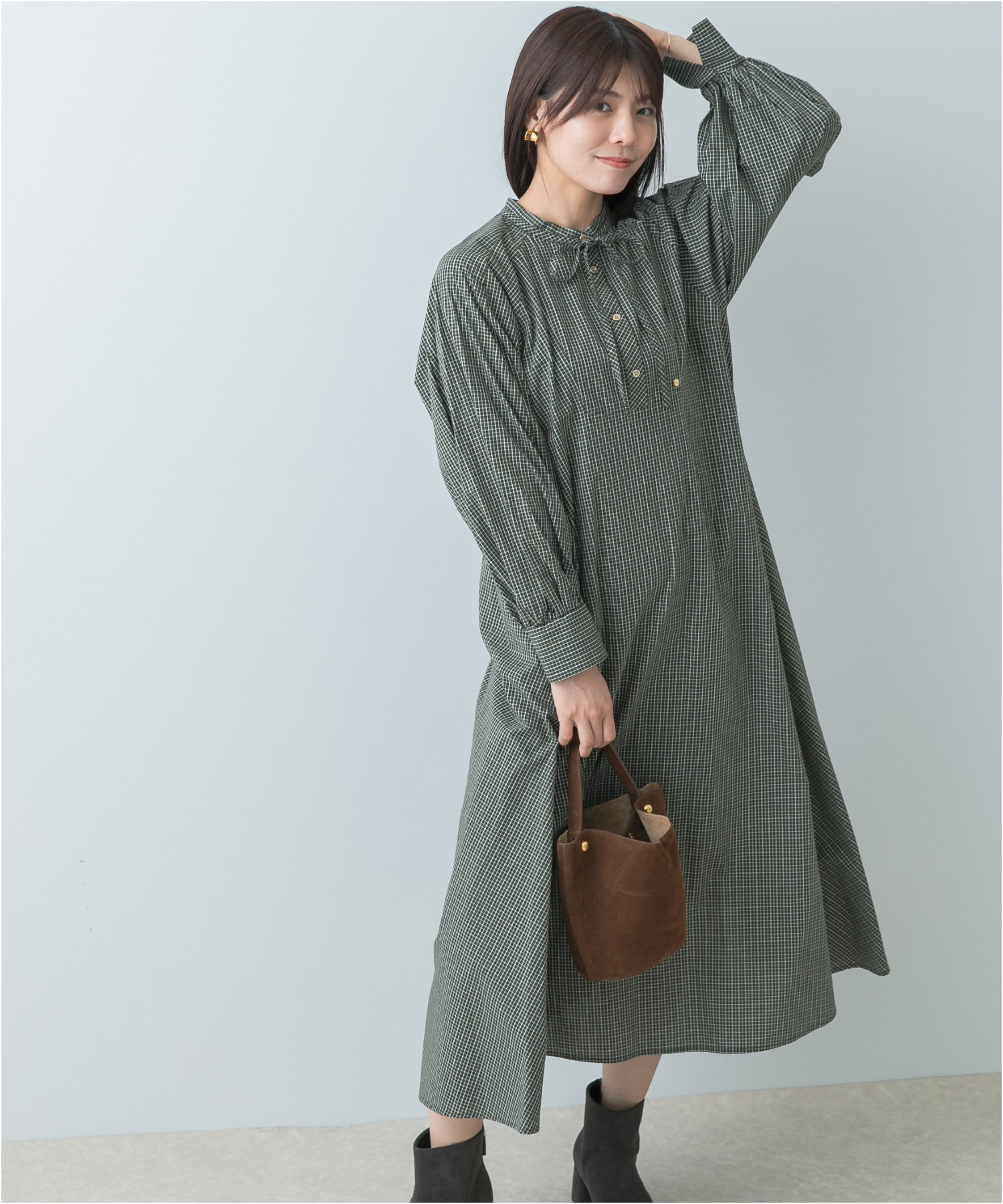 洗練されたチェック柄が印象的なワンピースは、一枚で着こなしが完成する便利なアイテム◎さらりとした肌触りの生地で、これからの季節に心地よく着用いただけます。首元はすっきりとしたバンドカラーで、上品な印象に。フロントのボタンと、胸元の控えめな切り替えがアクセントになっており、ゆったりとした身幅ながら、裾に向かって緩やかに広がるAラインシルエットが、体型を拾いにくく、リラックス感のある着心地と美しいラインを両立します。一枚でさらっと着るのはもちろん、肌寒い日にはカーディガンやジャケットを羽織るのもおすすめ◎