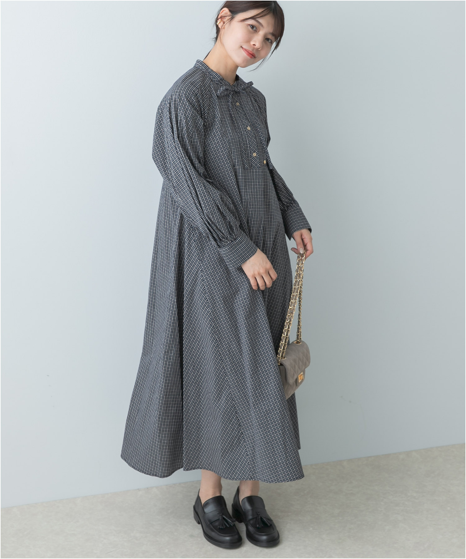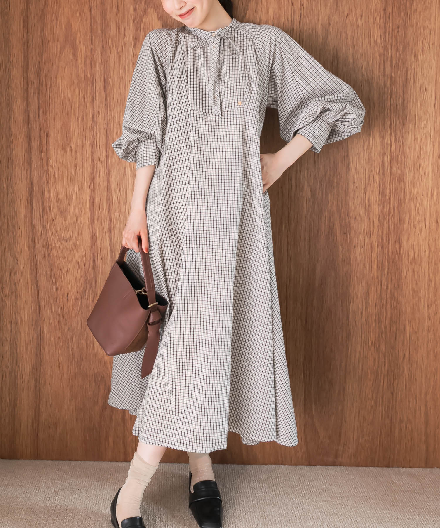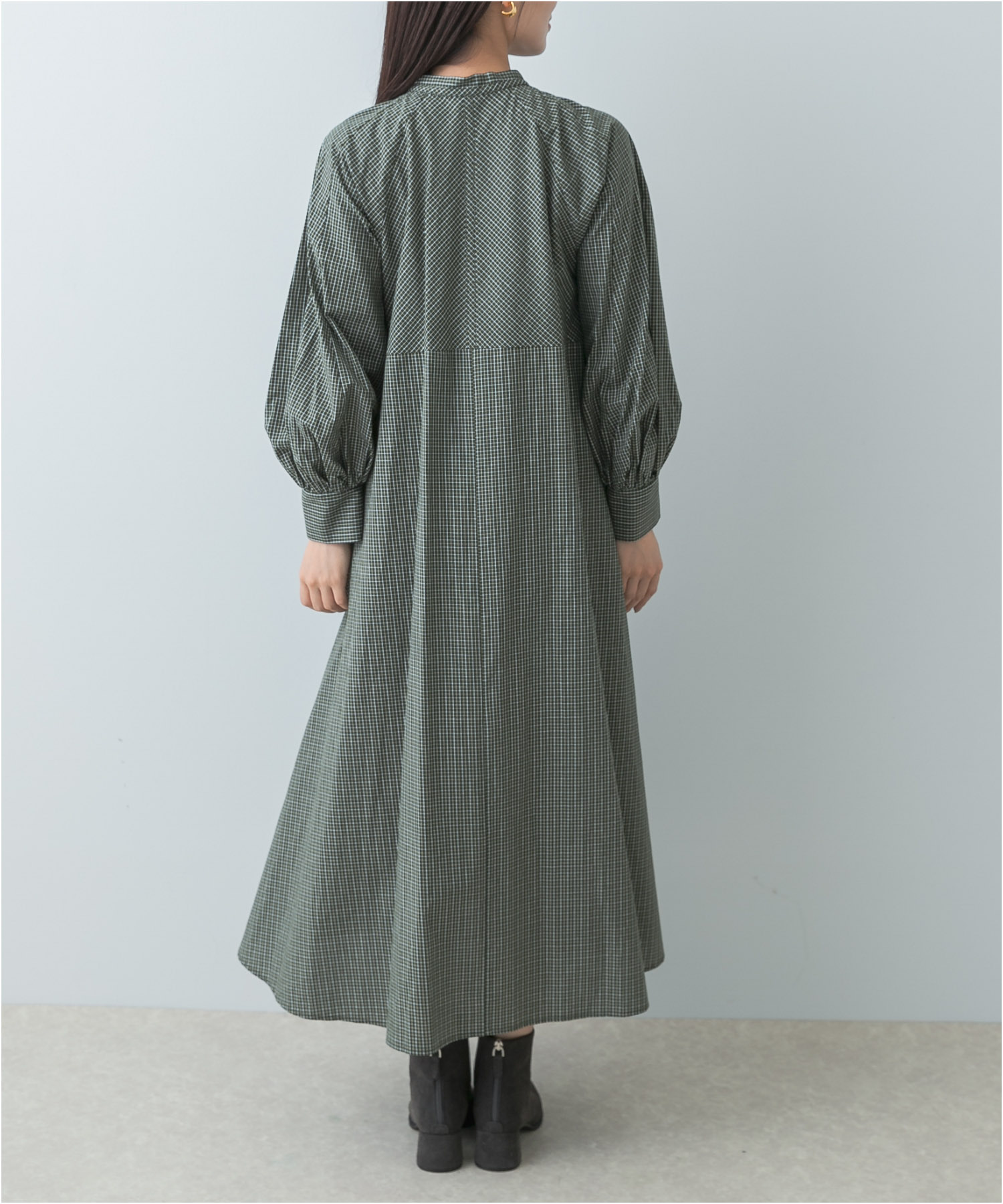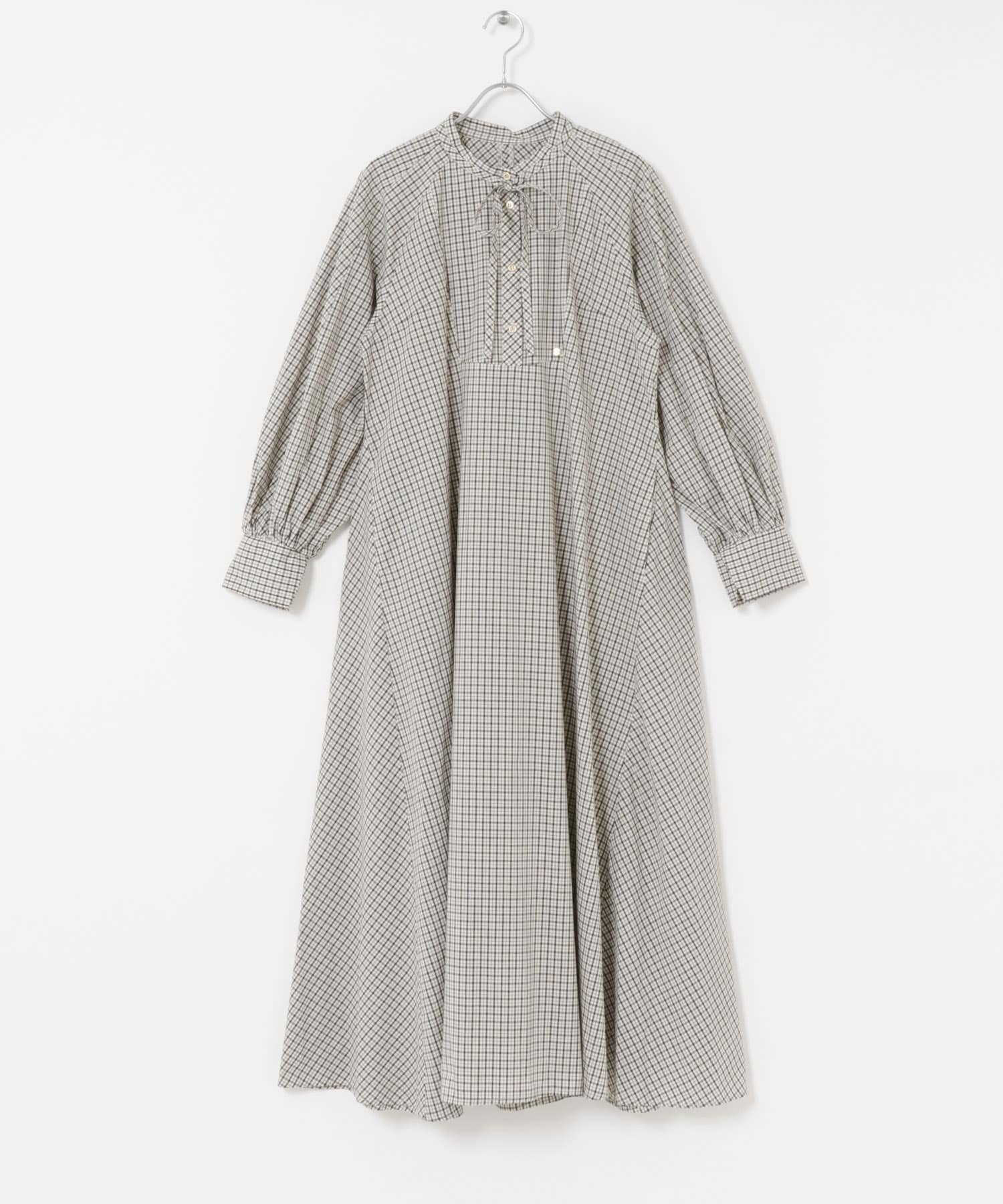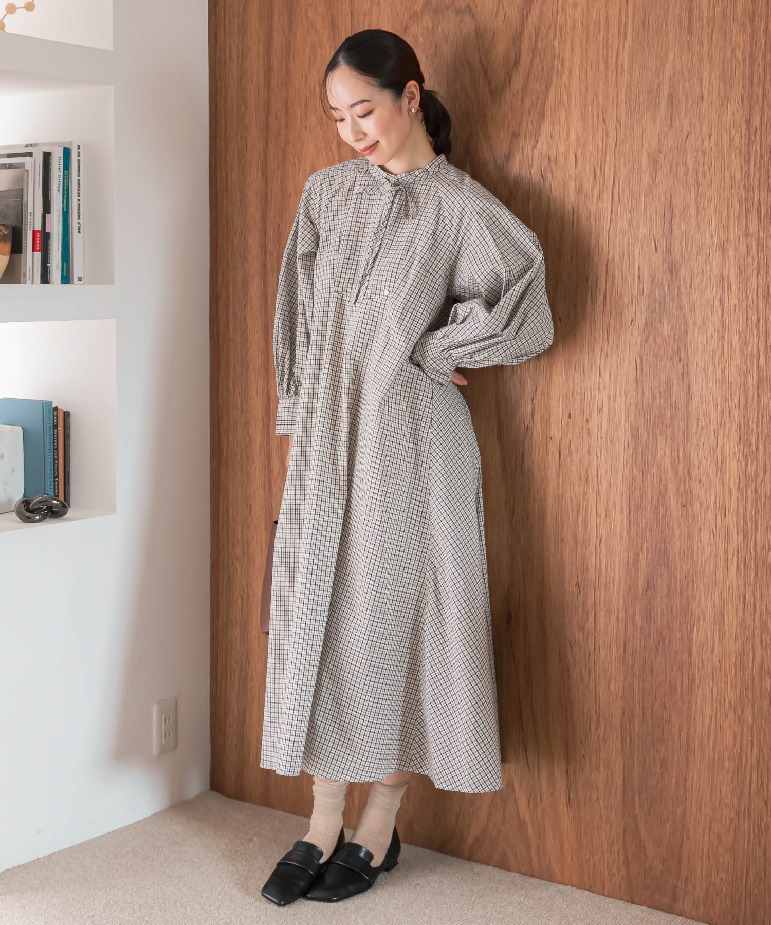 洗練されたチェック柄が印象的なワンピースは、一枚で着こなしが完成する便利なアイテム◎さらりとした肌触りの生地で、これからの季節に心地よく着用いただけます。首元はすっきりとしたバンドカラーで、上品な印象に。フロントのボタンと、胸元の控えめな切り替えがアクセントになっており、ゆったりとした身幅ながら、裾に向かって緩やかに広がるAラインシルエットが、体型を拾いにくく、リラックス感のある着心地と美しいラインを両立します。一枚でさらっと着るのはもちろん、肌寒い日にはカーディガンやジャケットを羽織るのもおすすめ◎