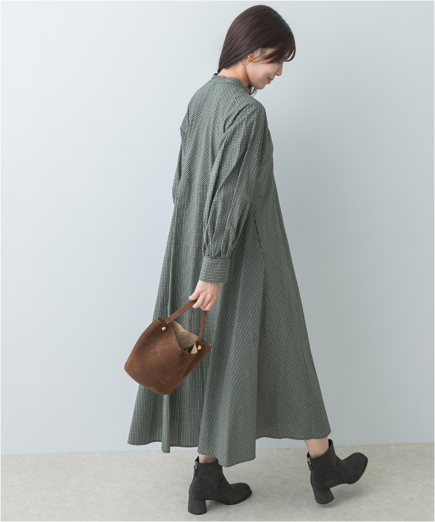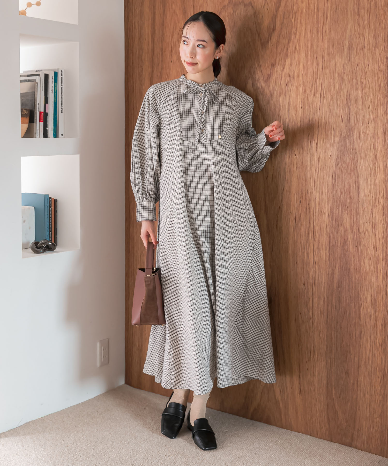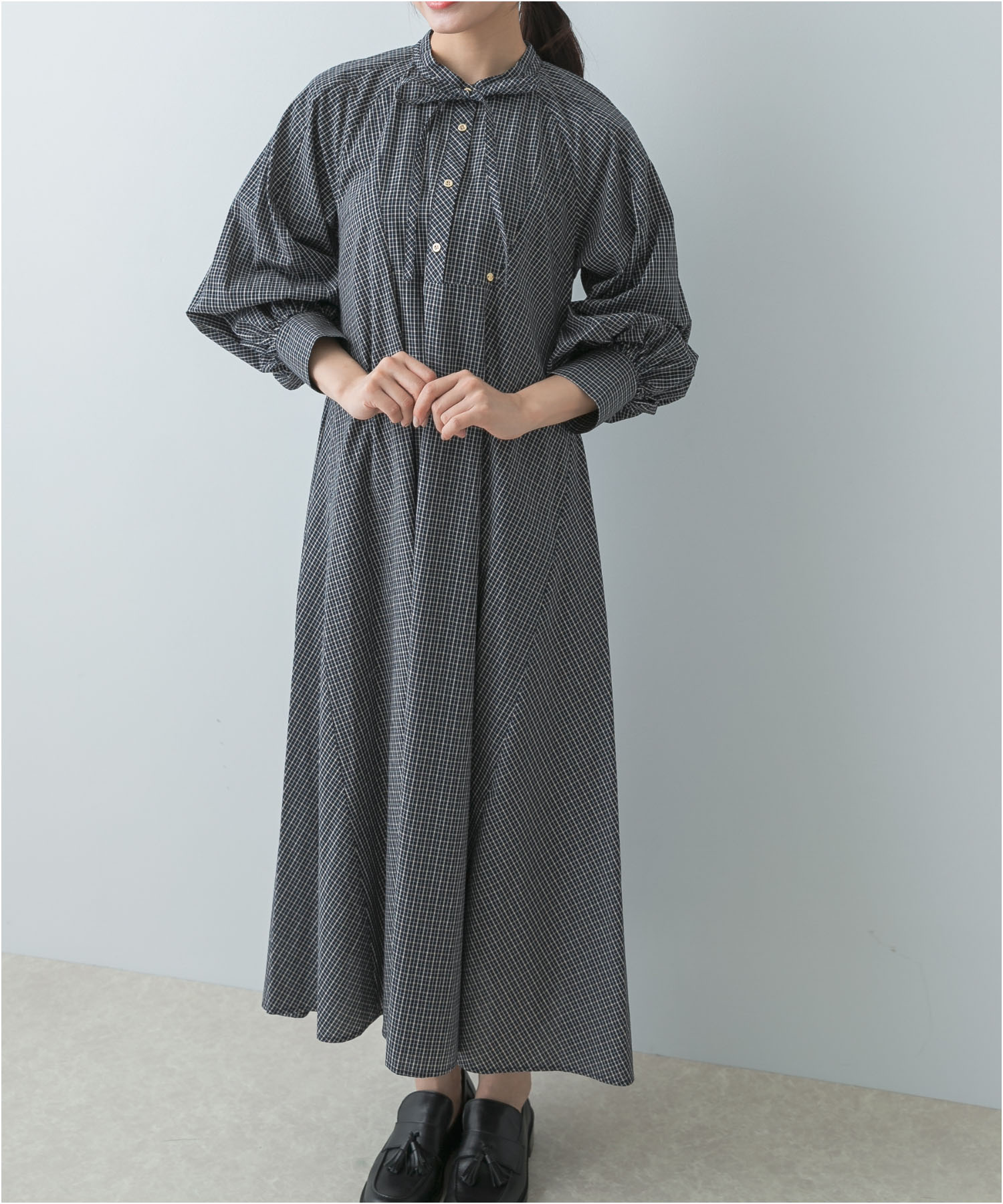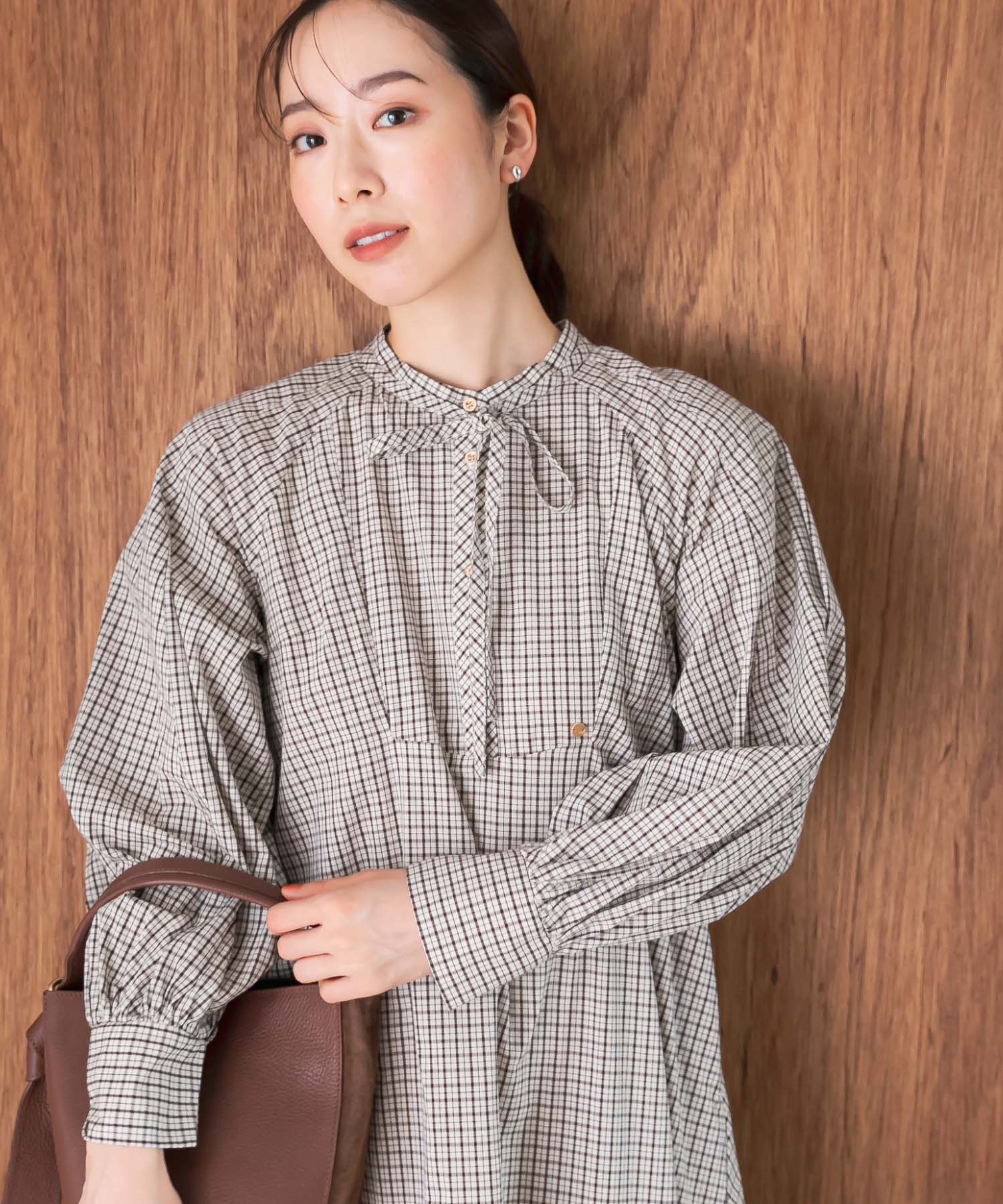 洗練されたチェック柄が印象的なワンピースは、一枚で着こなしが完成する便利なアイテム◎さらりとした肌触りの生地で、これからの季節に心地よく着用いただけます。首元はすっきりとしたバンドカラーで、上品な印象に。フロントのボタンと、胸元の控えめな切り替えがアクセントになっており、ゆったりとした身幅ながら、裾に向かって緩やかに広がるAラインシルエットが、体型を拾いにくく、リラックス感のある着心地と美しいラインを両立します。一枚でさらっと着るのはもちろん、肌寒い日にはカーディガンやジャケットを羽織るのもおすすめ◎