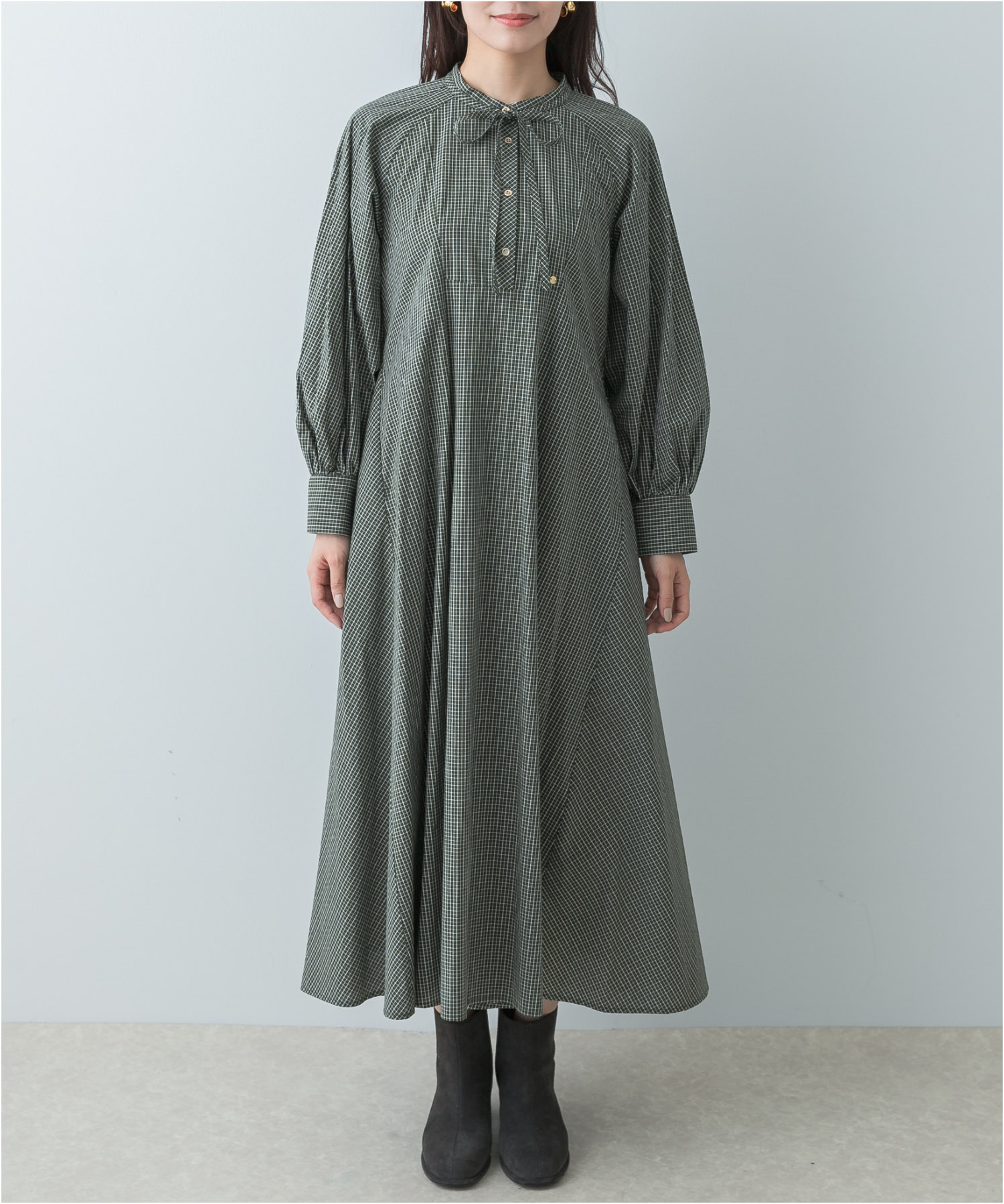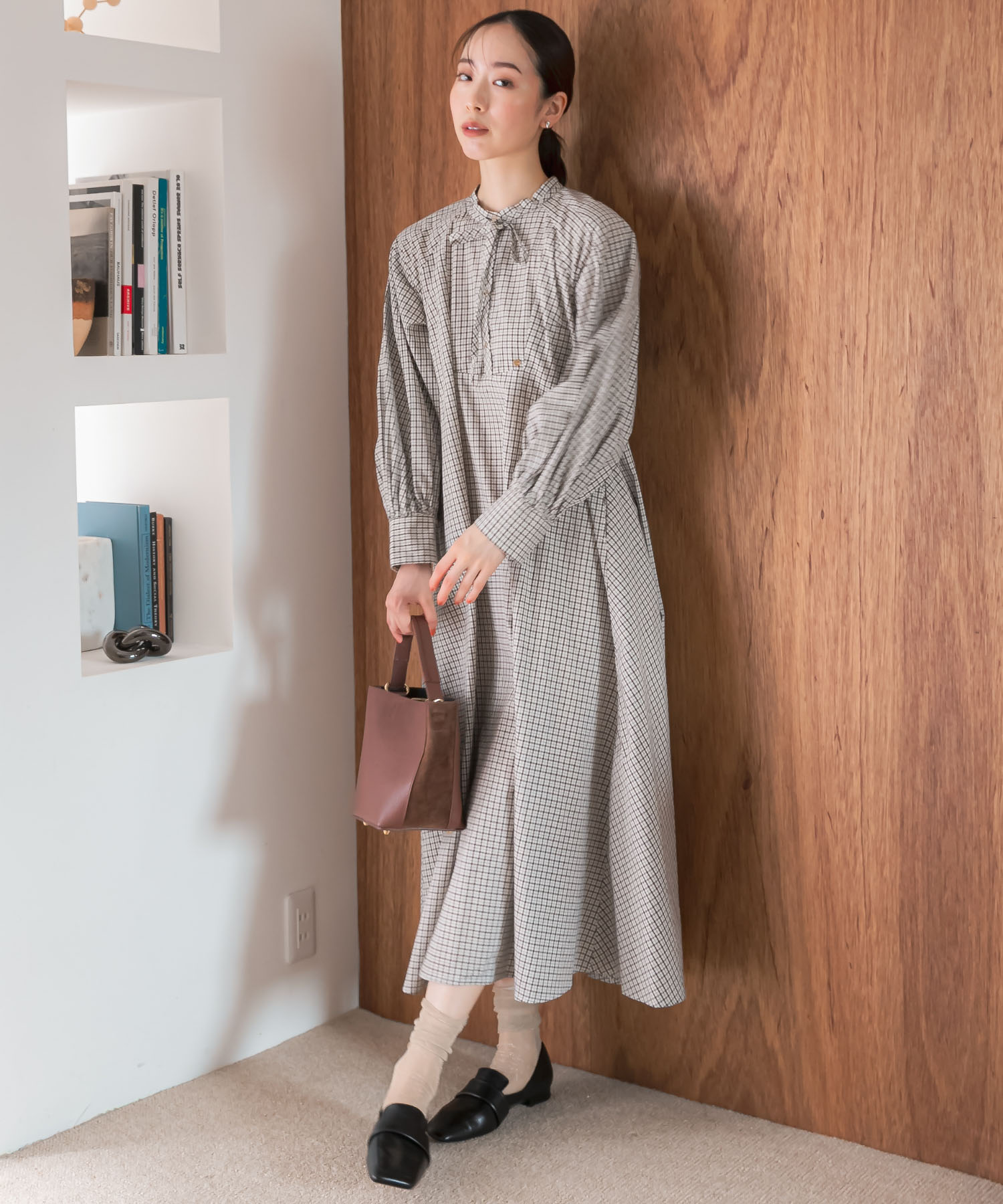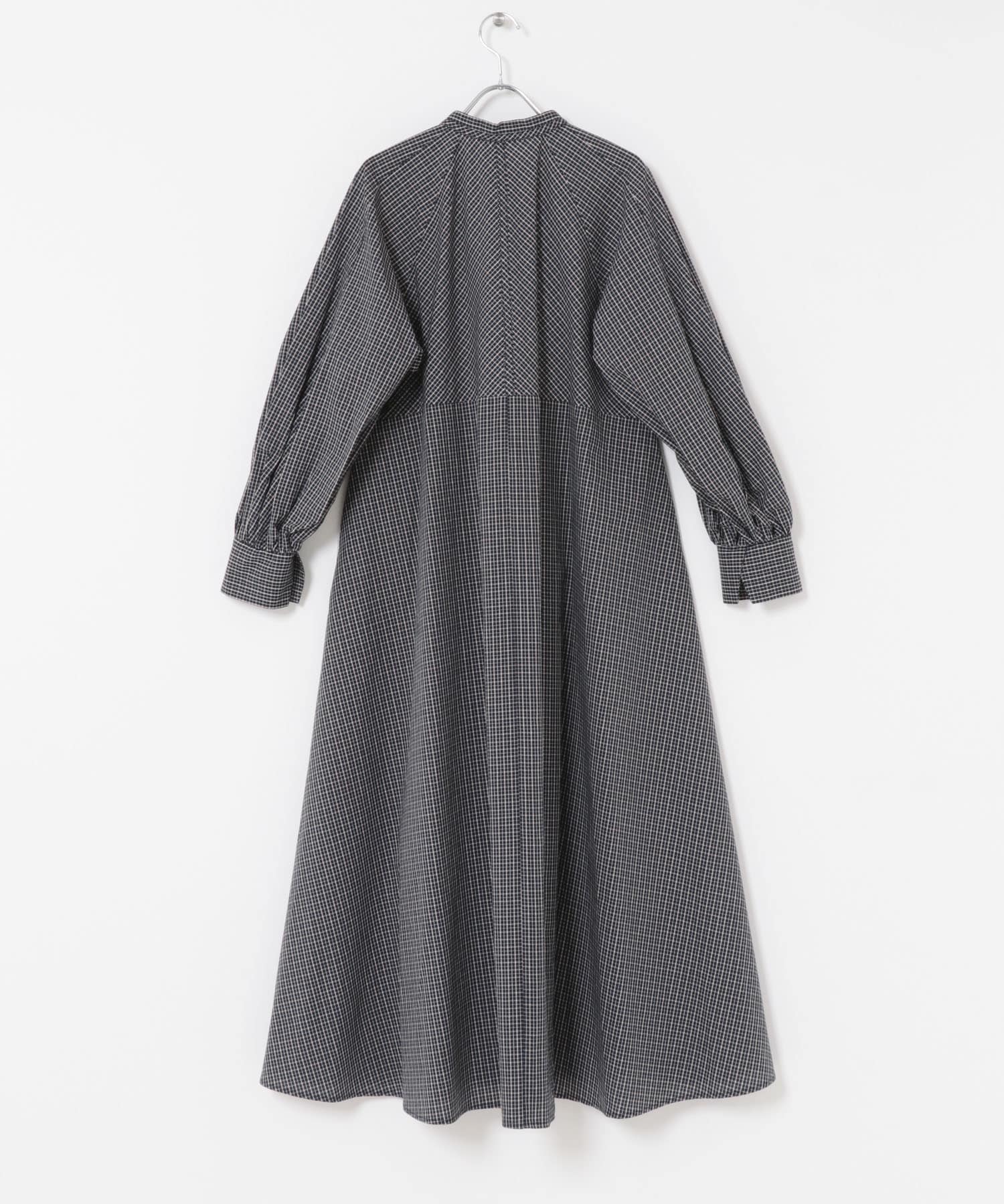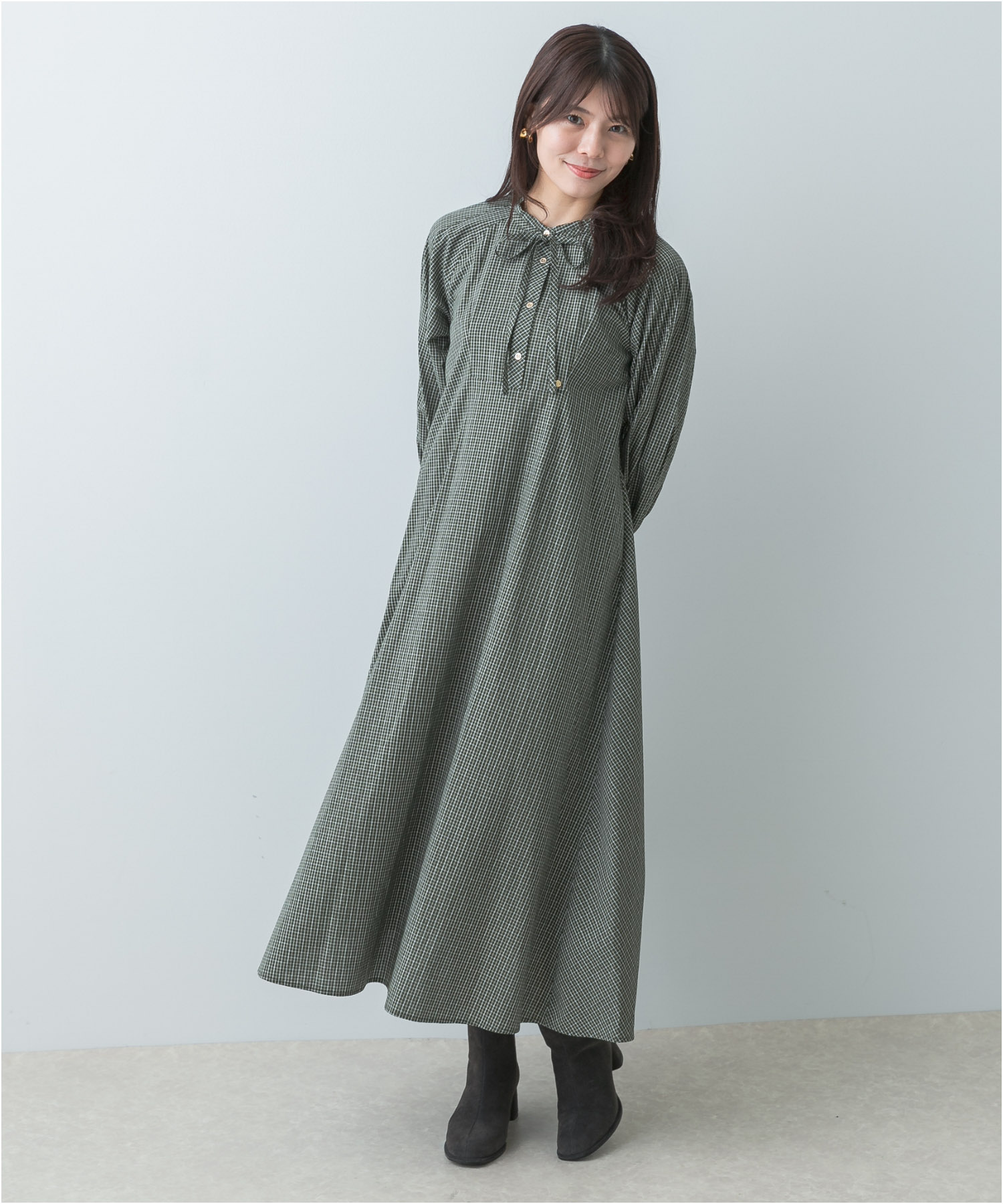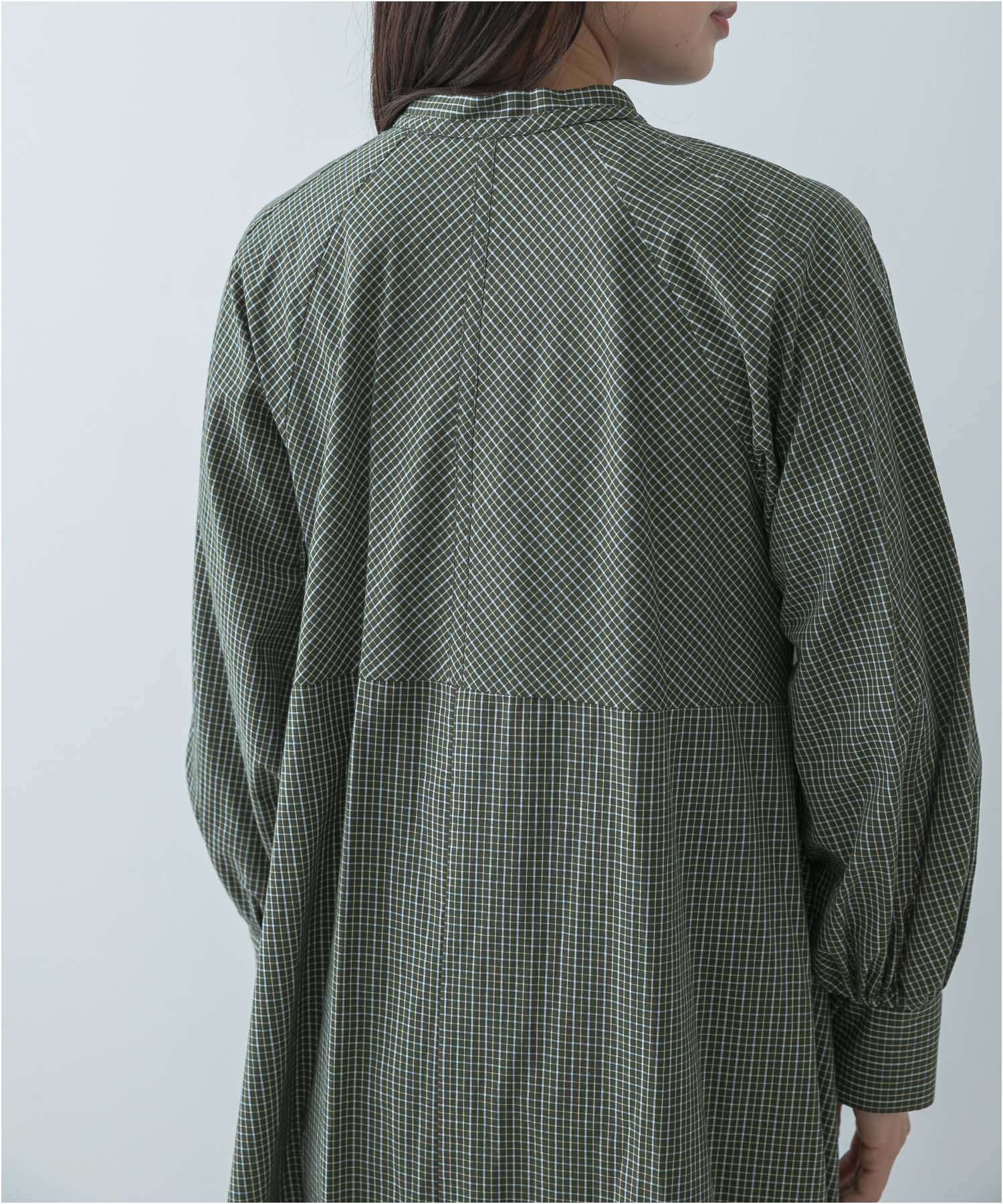 洗練されたチェック柄が印象的なワンピースは、一枚で着こなしが完成する便利なアイテム◎さらりとした肌触りの生地で、これからの季節に心地よく着用いただけます。首元はすっきりとしたバンドカラーで、上品な印象に。フロントのボタンと、胸元の控えめな切り替えがアクセントになっており、ゆったりとした身幅ながら、裾に向かって緩やかに広がるAラインシルエットが、体型を拾いにくく、リラックス感のある着心地と美しいラインを両立します。一枚でさらっと着るのはもちろん、肌寒い日にはカーディガンやジャケットを羽織るのもおすすめ◎