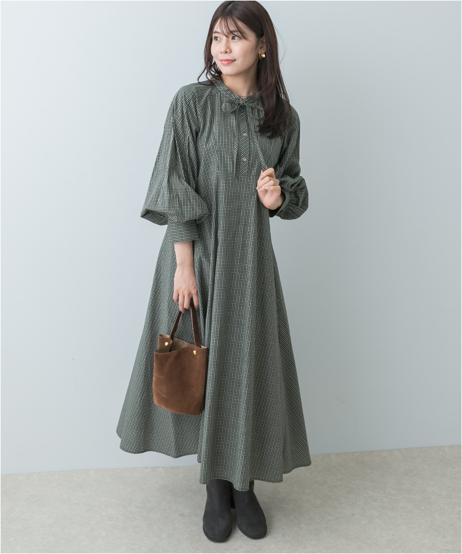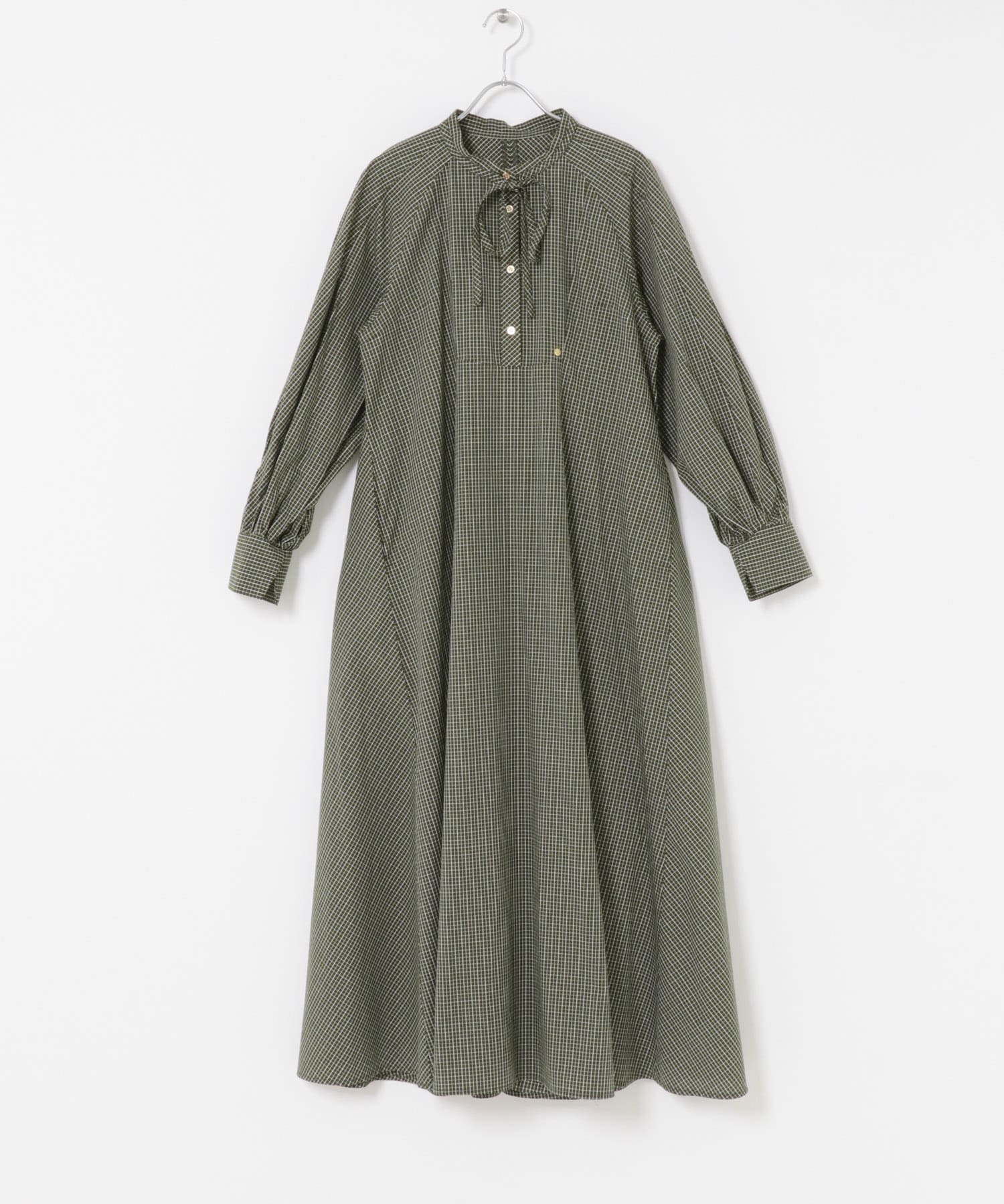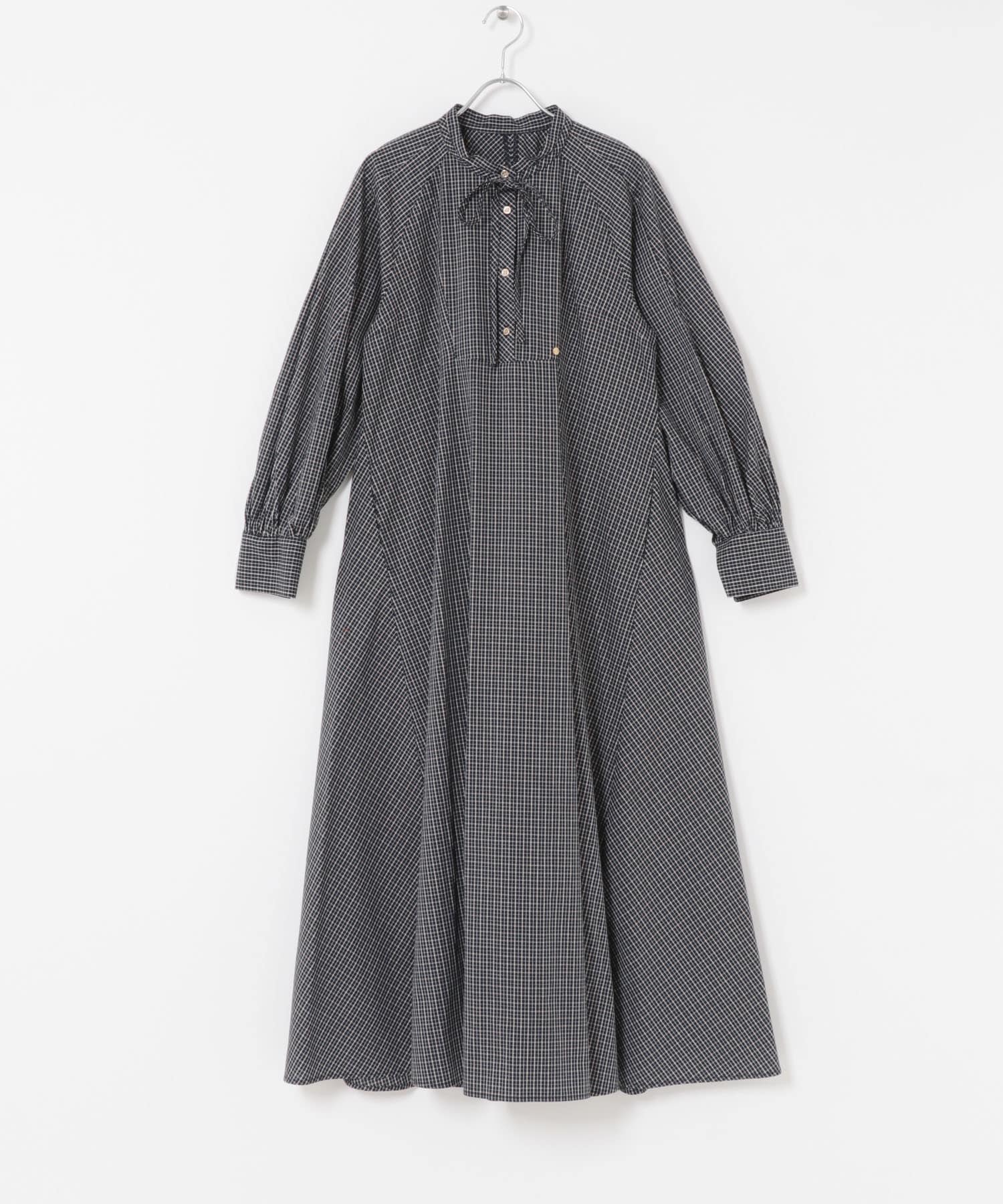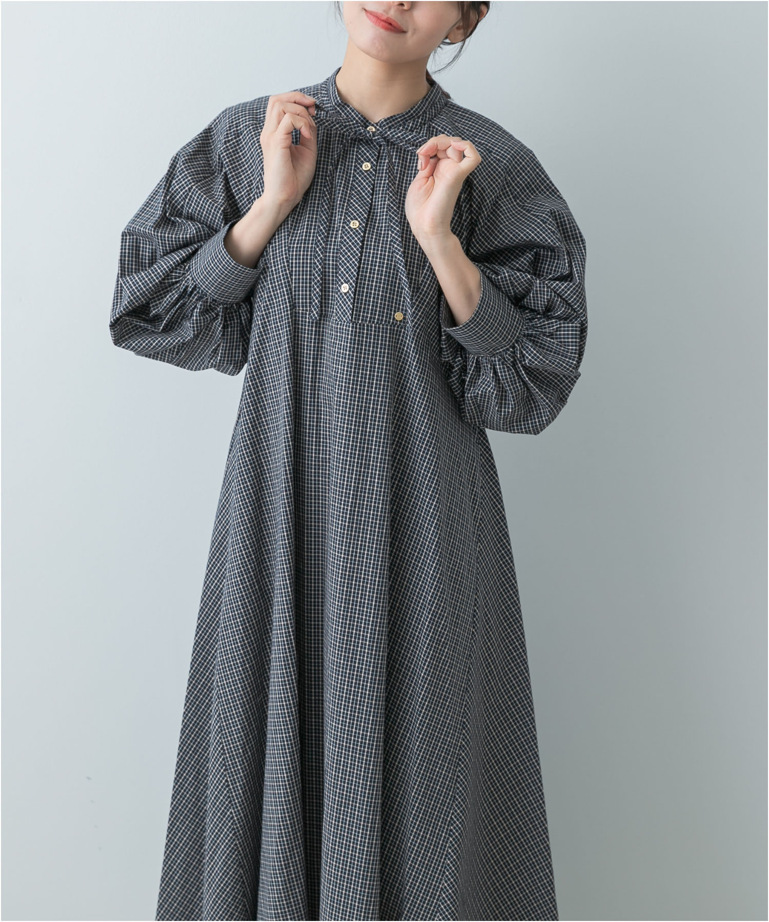洗練されたチェック柄が印象的なワンピースは、一枚で着こなしが完成する便利なアイテム◎さらりとした肌触りの生地で、これからの季節に心地よく着用いただけます。首元はすっきりとしたバンドカラーで、上品な印象に。フロントのボタンと、胸元の控えめな切り替えがアクセントになっており、ゆったりとした身幅ながら、裾に向かって緩やかに広がるAラインシルエットが、体型を拾いにくく、リラックス感のある着心地と美しいラインを両立します。一枚でさらっと着るのはもちろん、肌寒い日にはカーディガンやジャケットを羽織るのもおすすめ◎