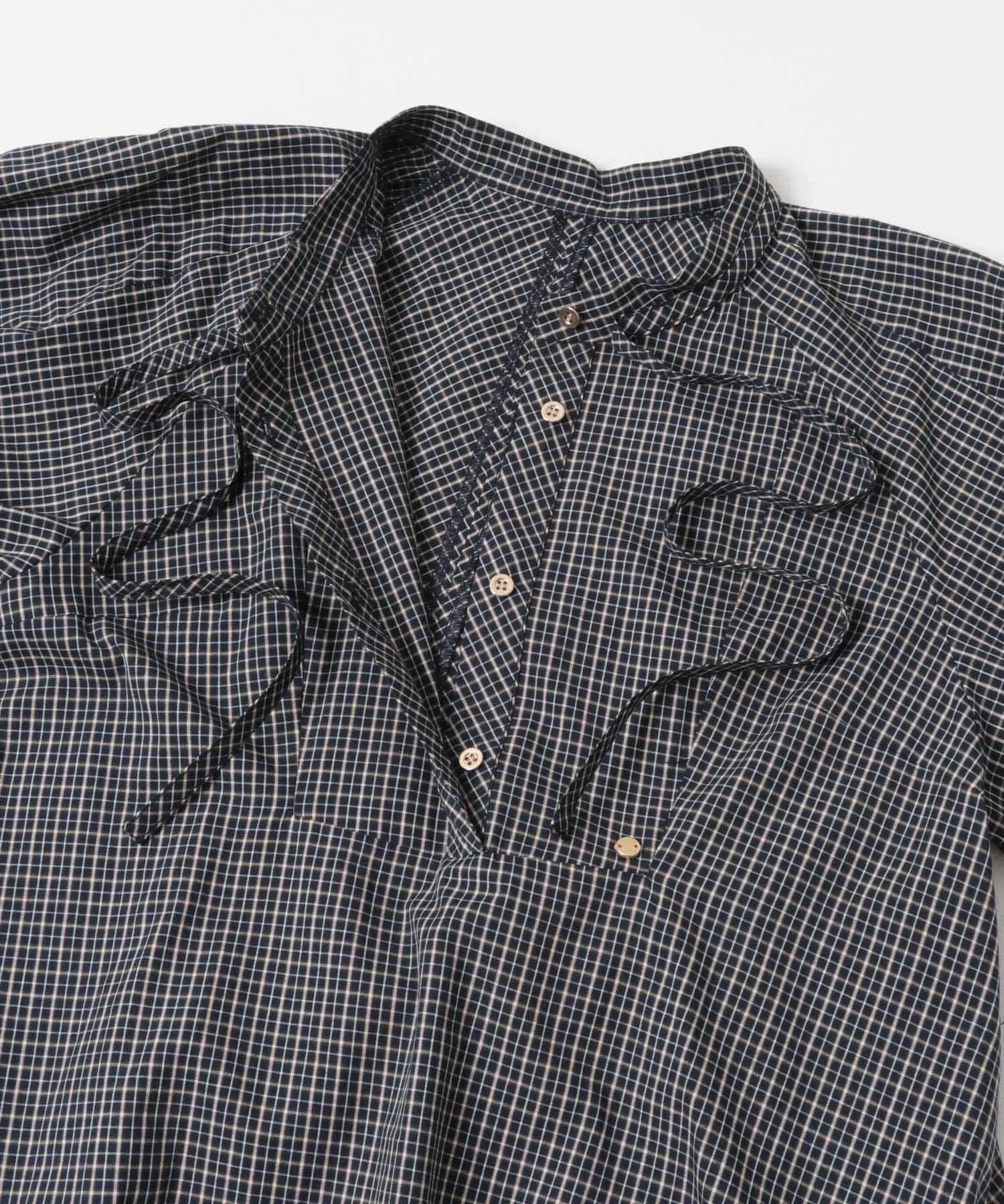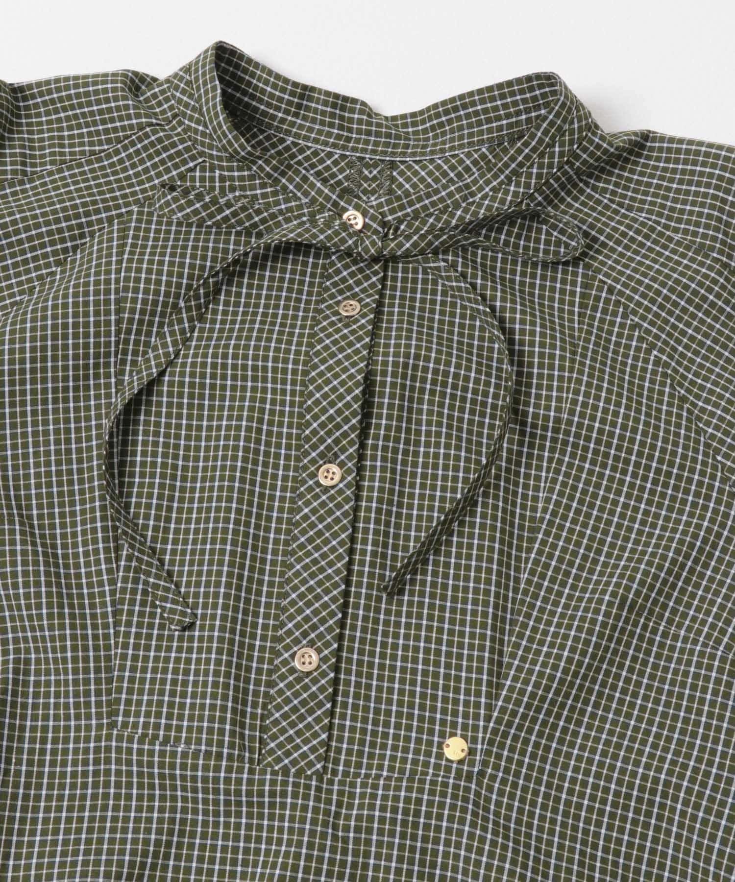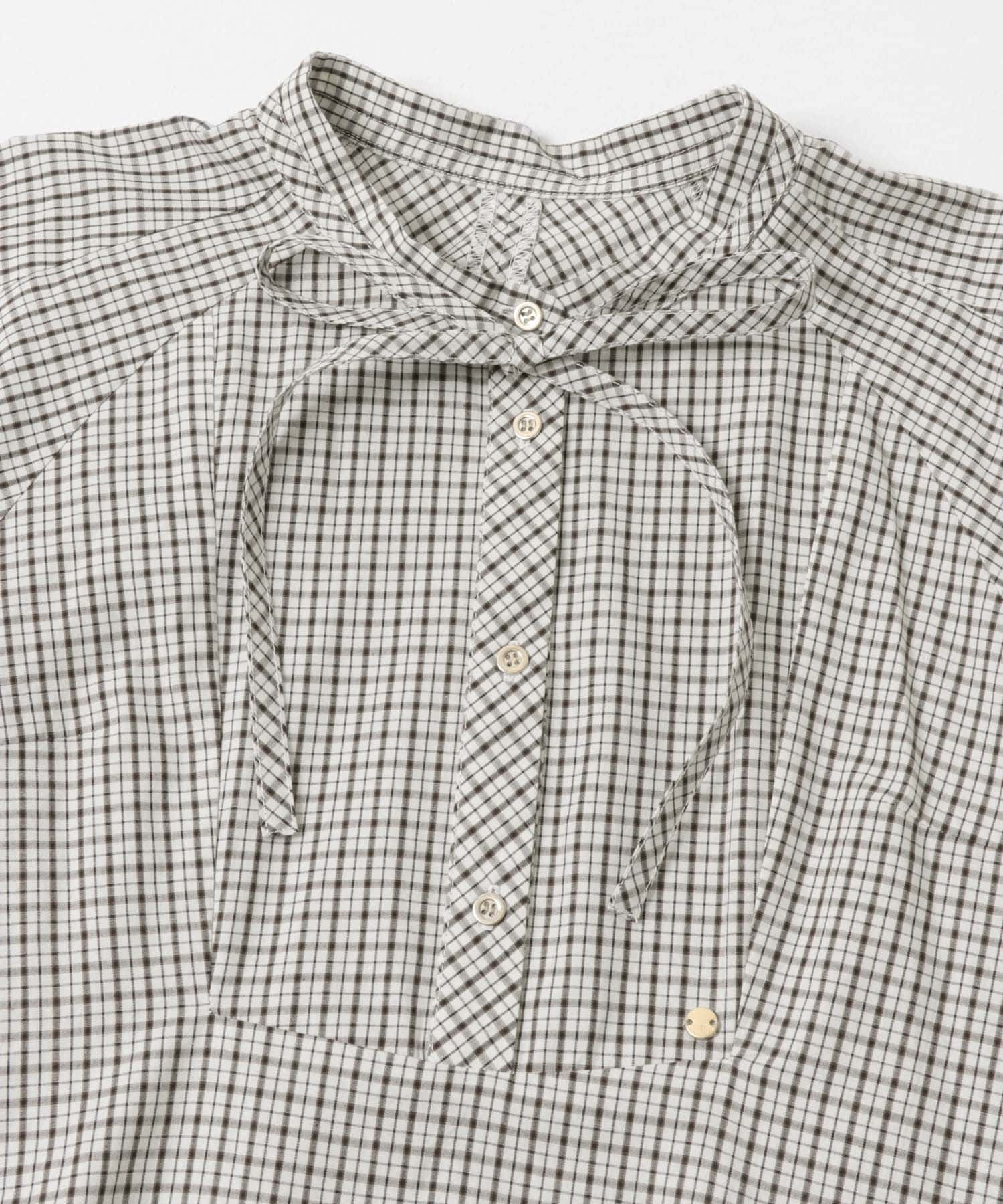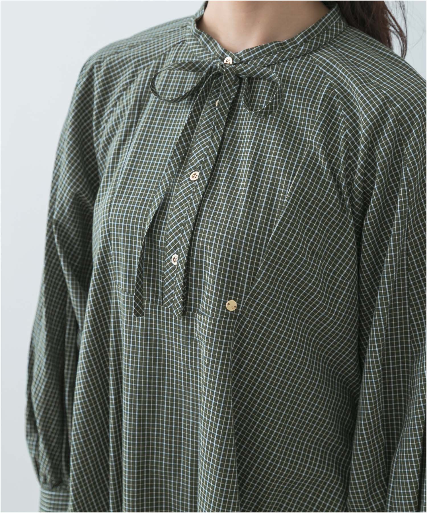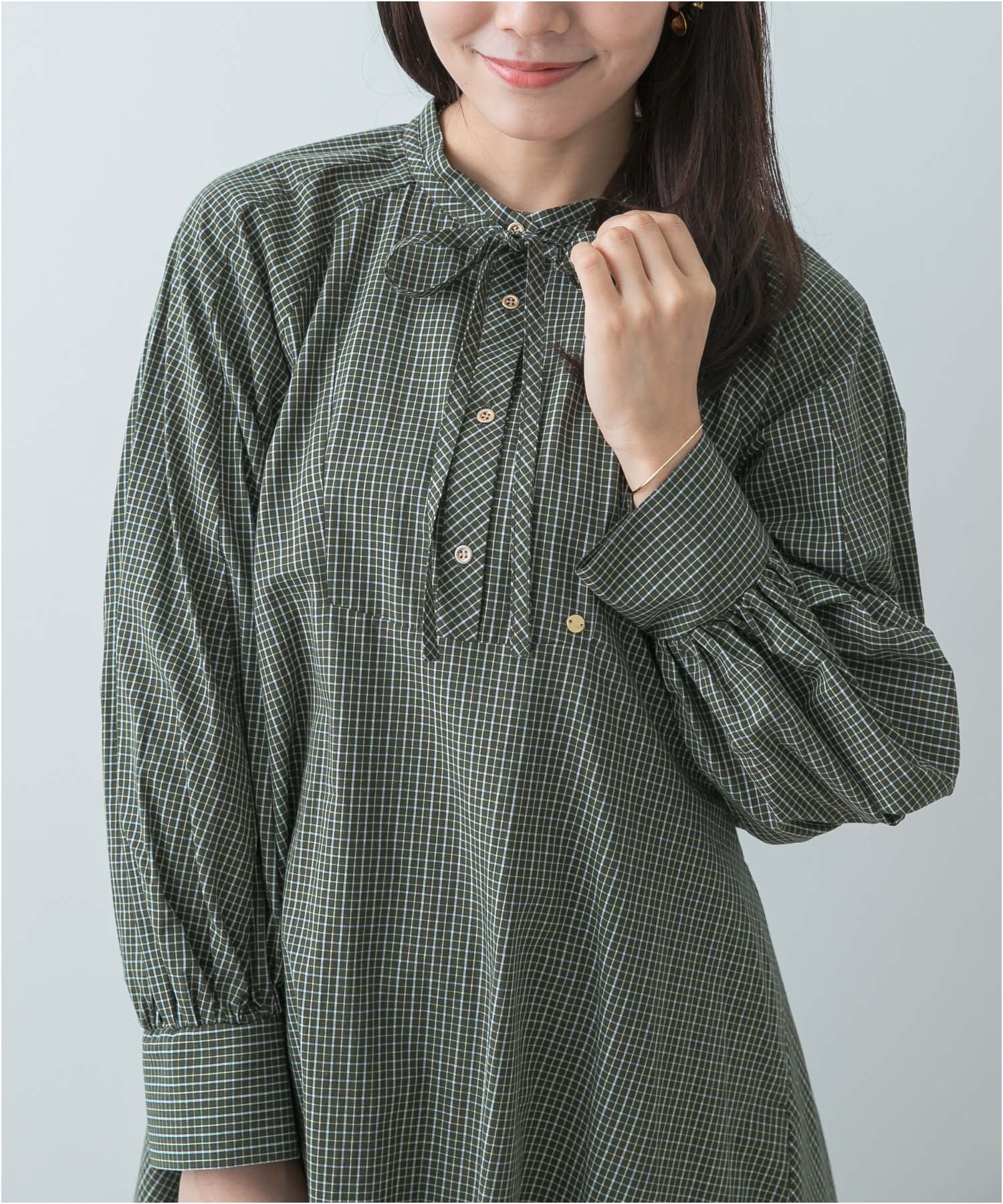 洗練されたチェック柄が印象的なワンピースは、一枚で着こなしが完成する便利なアイテム◎さらりとした肌触りの生地で、これからの季節に心地よく着用いただけます。首元はすっきりとしたバンドカラーで、上品な印象に。フロントのボタンと、胸元の控えめな切り替えがアクセントになっており、ゆったりとした身幅ながら、裾に向かって緩やかに広がるAラインシルエットが、体型を拾いにくく、リラックス感のある着心地と美しいラインを両立します。一枚でさらっと着るのはもちろん、肌寒い日にはカーディガンやジャケットを羽織るのもおすすめ◎