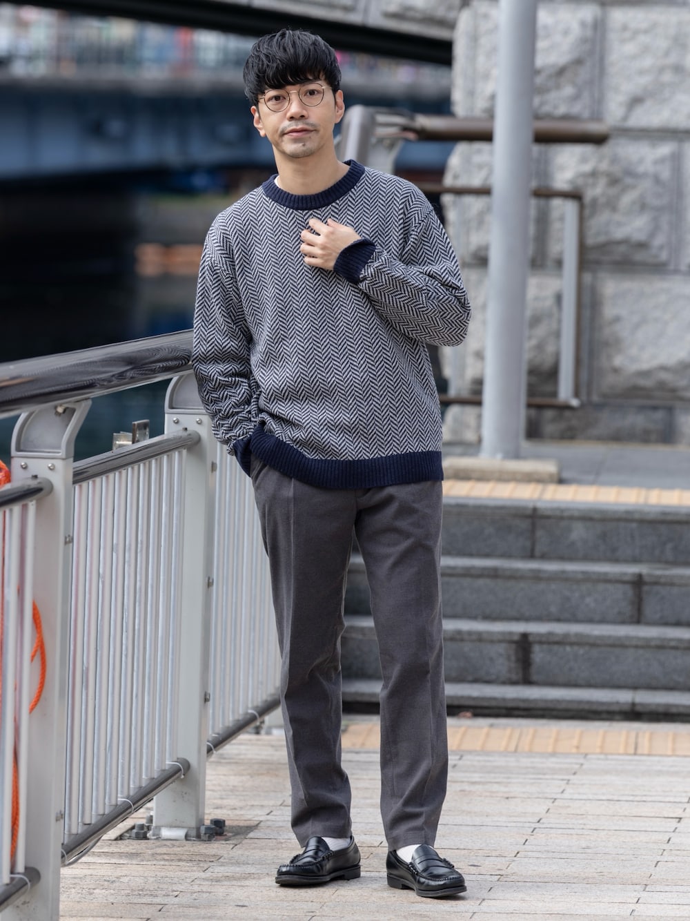 クラシカルかつキャッチーなヘリンボーンの総柄が特徴的なプルオーバーニットが今シーズンも登場。