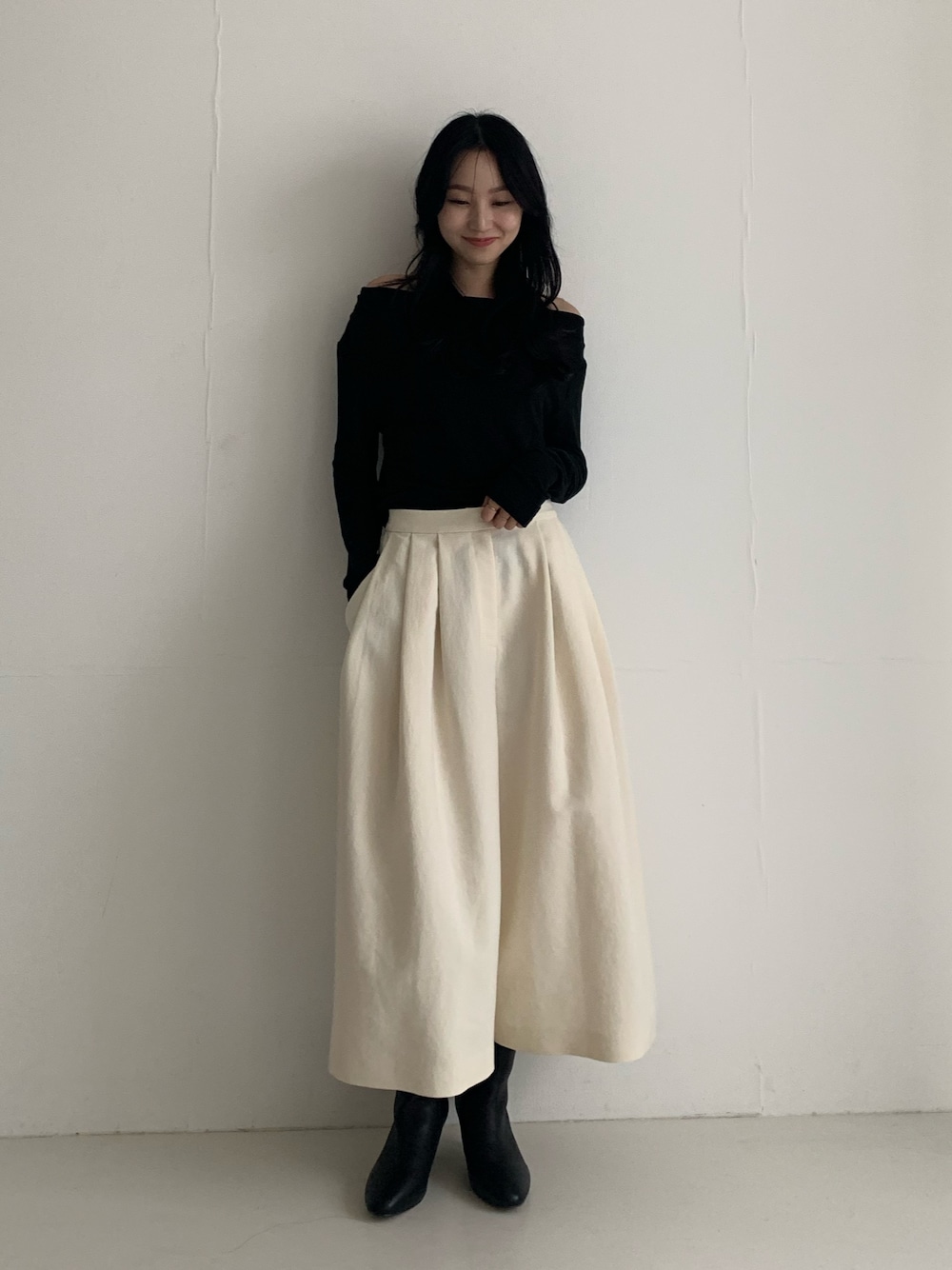 大人の洒落感コーデを叶えるタックキュロットパンツ。天然タッチの高密度な二重織り素材を使用。キレイ過ぎないニュアンスのある表情感がお勧めの素材となっている。ハリのある生地感を生かし、大きなタックで立体的な丸みのあるフォルムにこだわりました。後ろゴム仕様となりリラクシーな着心地も魅力。一見スカートにも見えるシルエットで、パンツの苦手な方でも挑戦しやすく、合わせるトップスによってカジュアルにもキレイ目にも着こなせます。