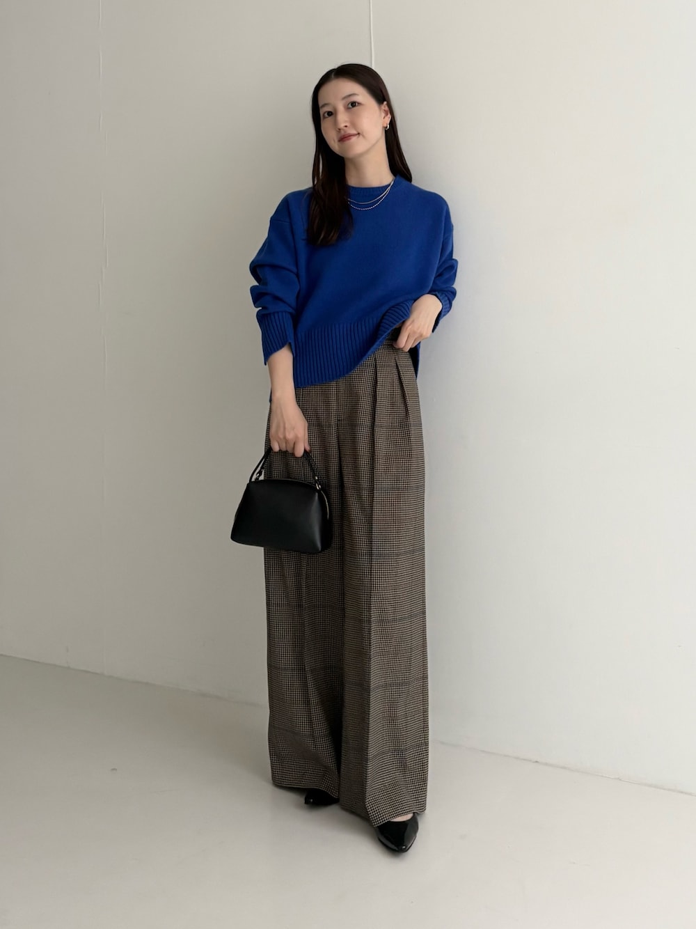 ブラウンチェックがクラシカルな印象のワイドスラックス。ハイウエストデザインとフロントに施されたタックが脚長効果を叶えます。ウエスト周りはすっきりとしており、トップスをインしても綺麗なシルエットに。程よく落ち感のある素材感で、すとんと落ちるワイドシルエットが美しく体型をカバー。オフィススタイルから綺麗めカジュアルまでON/OFF問わず活躍する一本です。同素材のチェックテーラードジャケット(品番:RAA7-27S704)とセットアップとしての着用もお勧めです。