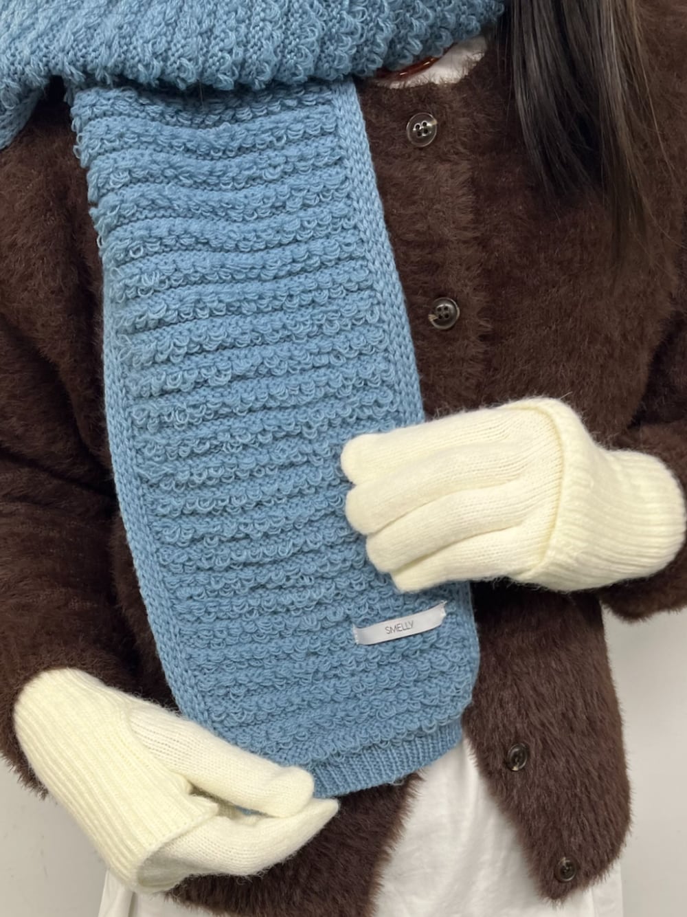 ぽこぽことした立体的な編み地が、表情豊かで愛らしいニットマフラー。