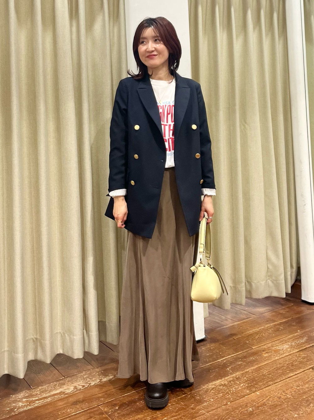 ゆったりと裾を出して着る場合は、ビスチェなどをプラスすると、トレンド感のある着こなしが完成します。