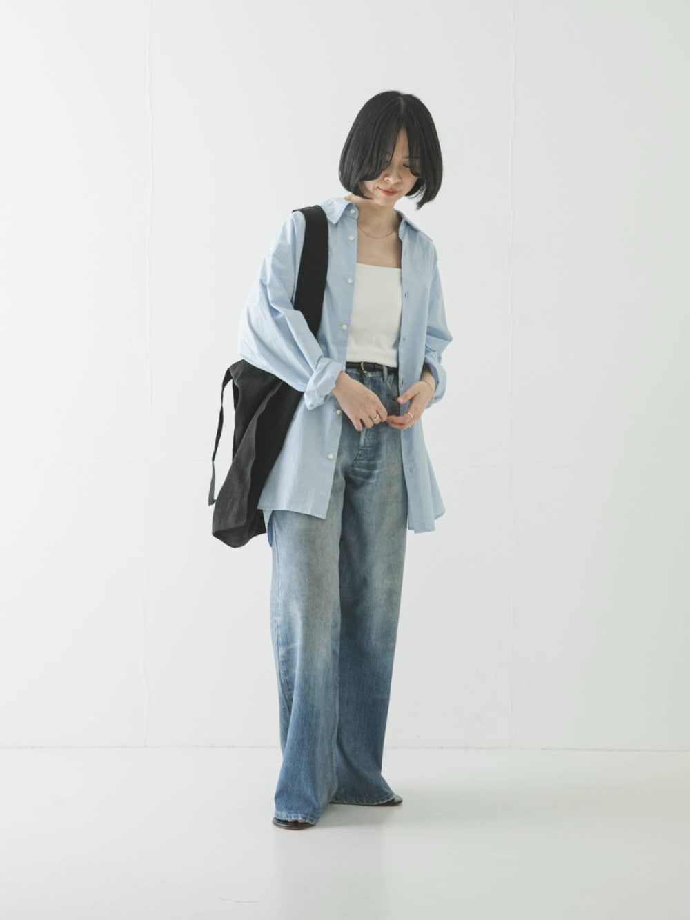 大きめの衿が顔まわりをすっきりとした印象に見せ、ゆったりとしたオーバーシルエットと長めの着丈が、体のラインを拾わずリラックスした着こなしが魅力。