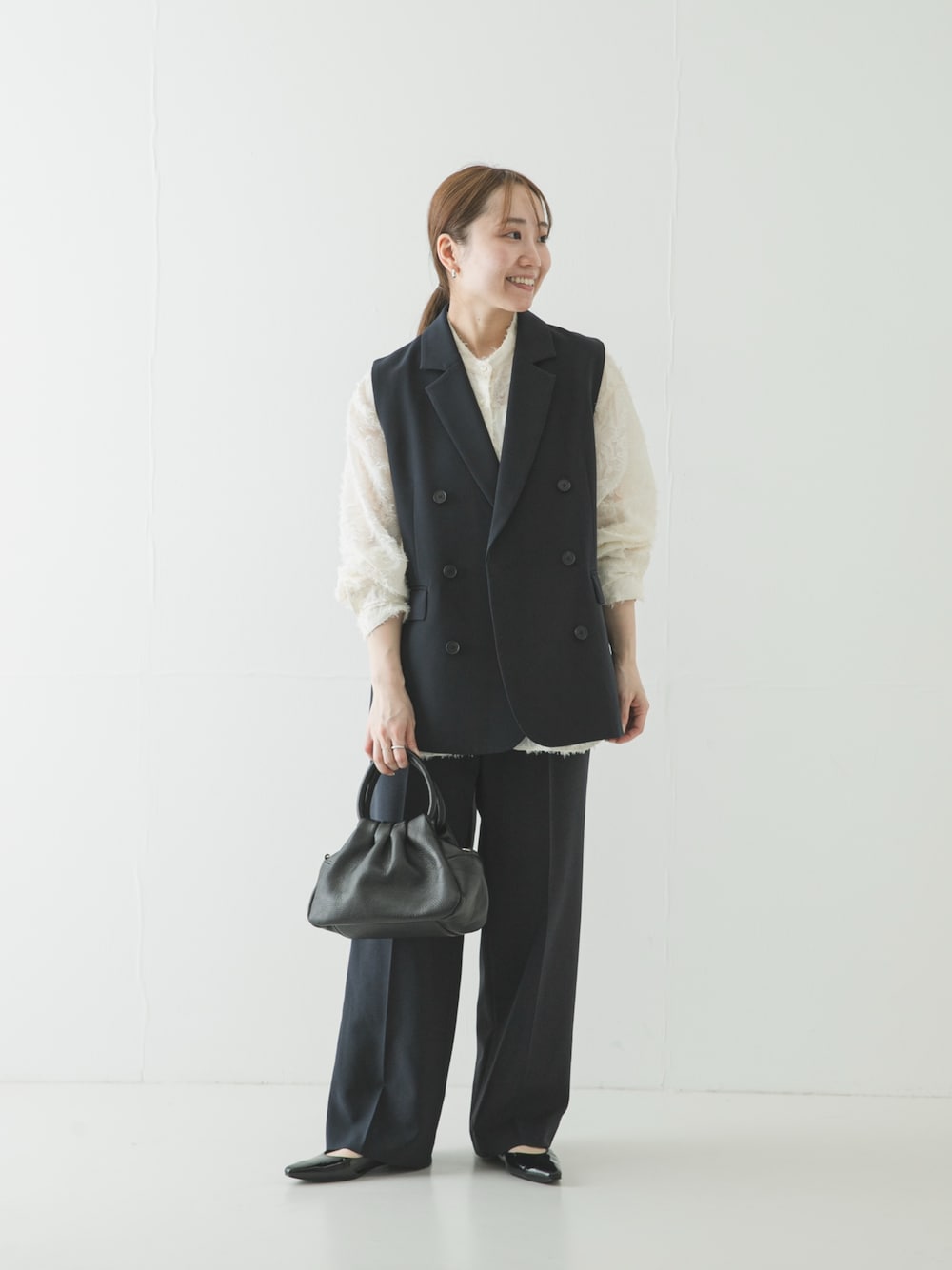 ブラウスに同素材のノーカラージャケットを合わせた、まとまりのあるセットアップでの着用がおすすめです。もちろん、シンプルなニットやカジュアルなトップスとも好相性で、幅広い着回しが可能です。