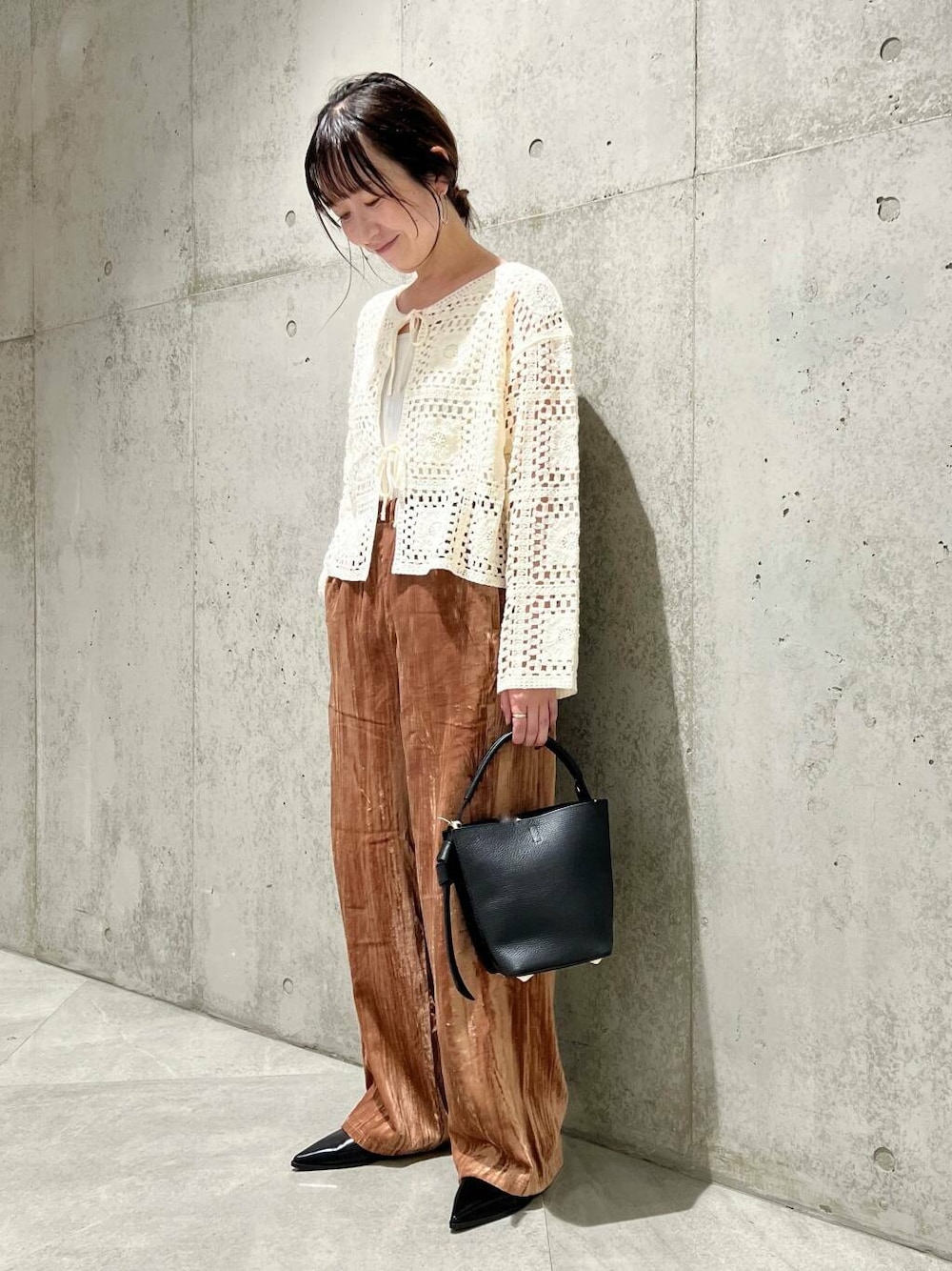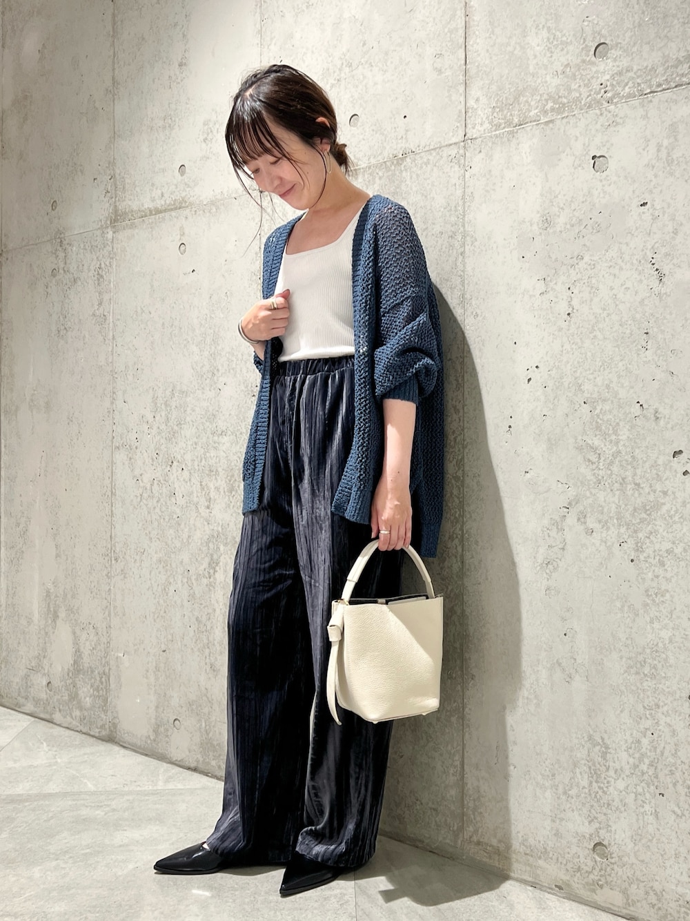 落ち感のあるすっきりとしたストレートシルエットに、表面感のある素材がシンプルなアイテム合わせでも表情のあるスタイリングを完成させます。
