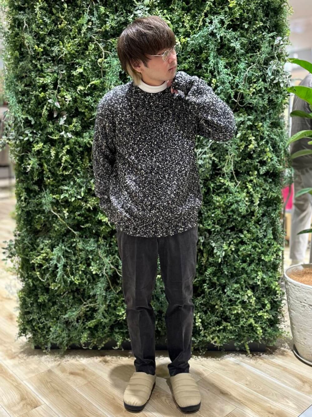 異なる色のスラブ糸を撚り合わせて作られたミックスカラーニット。 節感のある独特の表情が魅力で、カシミヤのような柔らかい風合いが特徴です。 ジャストルーズシルエットで適度なゆとりがあり、リラックスした着心地を実現。 カジュアルながらも高級感があり、豊かな色合いと質感がコーディネートのアクセントとして活躍します。