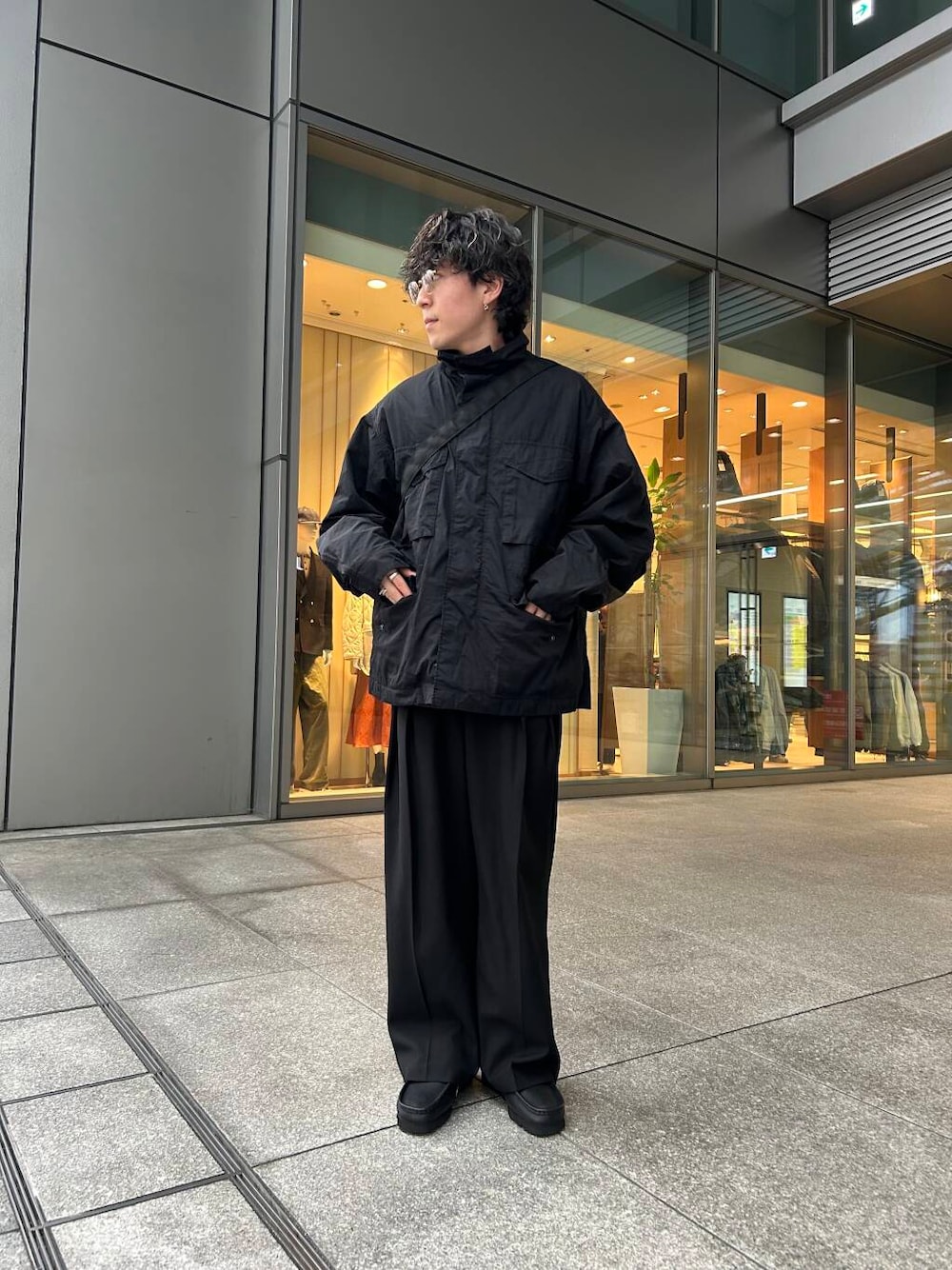 ・スラックスを合わせたややフォーマルな着こなしも可能