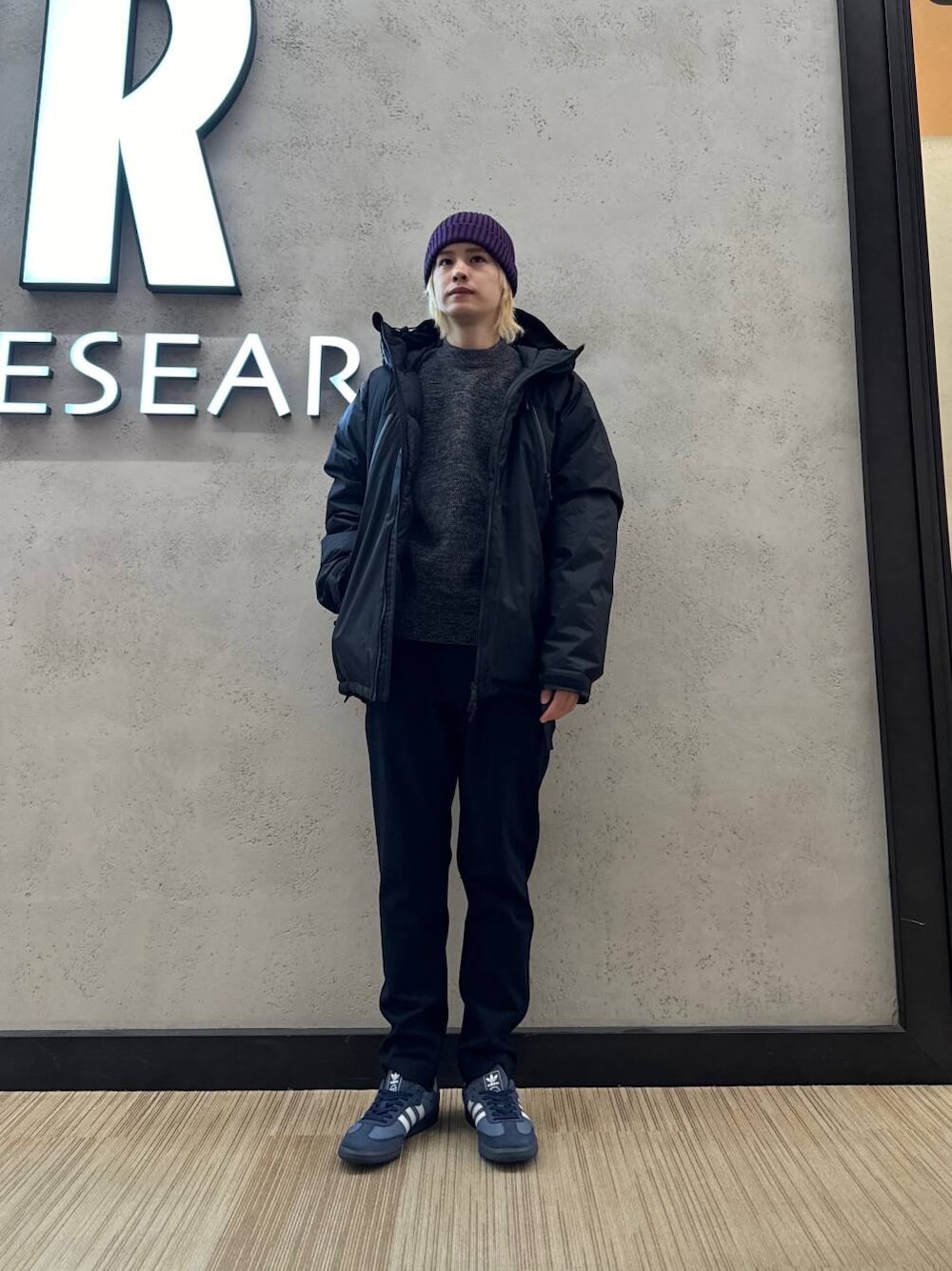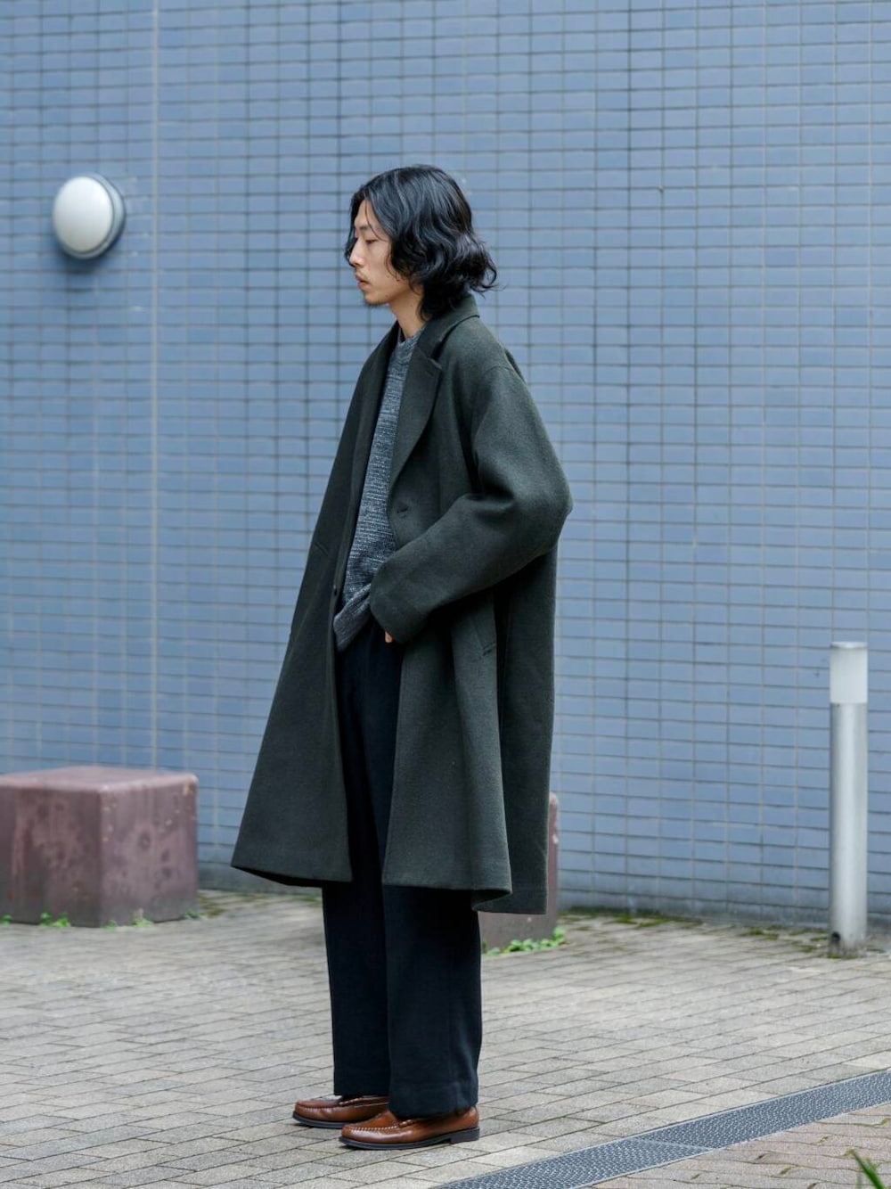 ・スラックスを合わせたややフォーマルな着こなしも可能