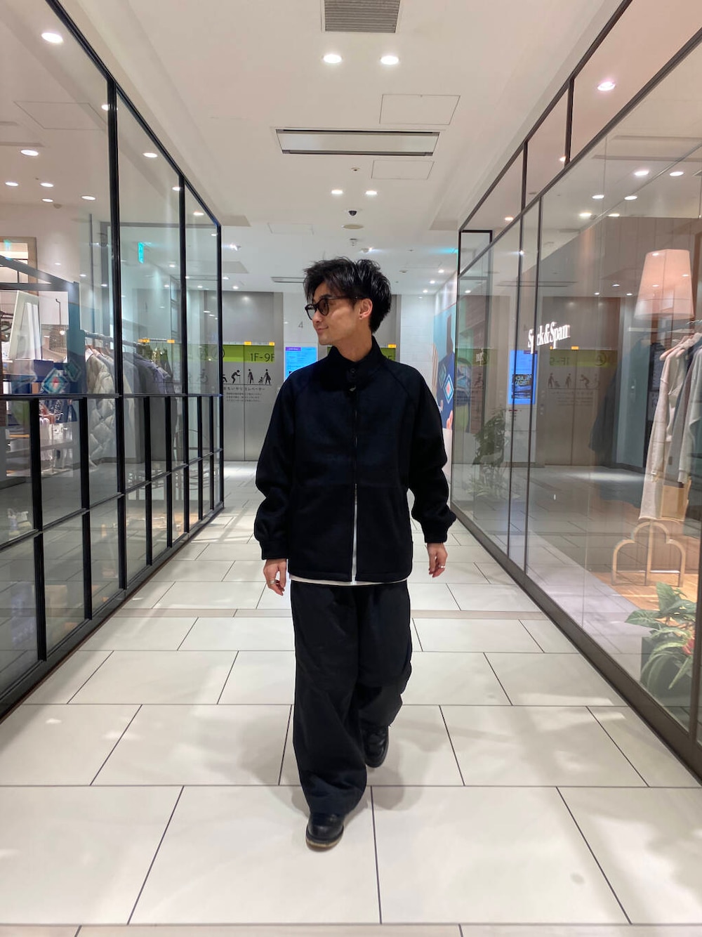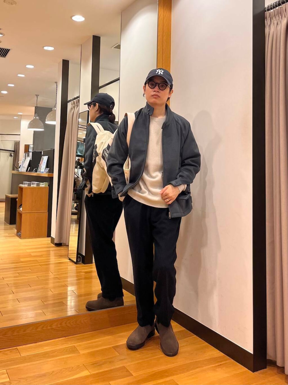 ・スウェットやニット、カーディガンをレイヤードし、気温に合わせたスタイル