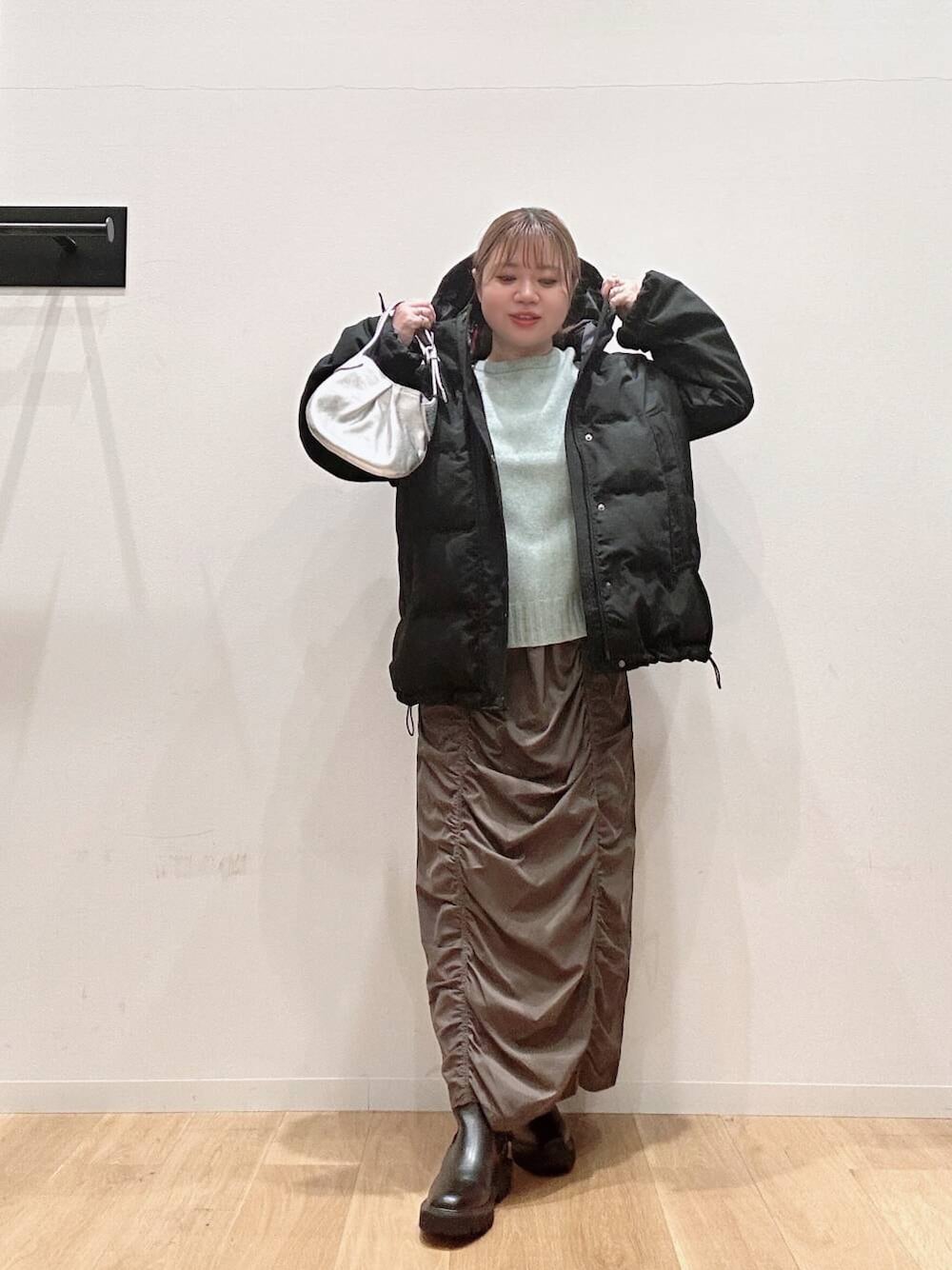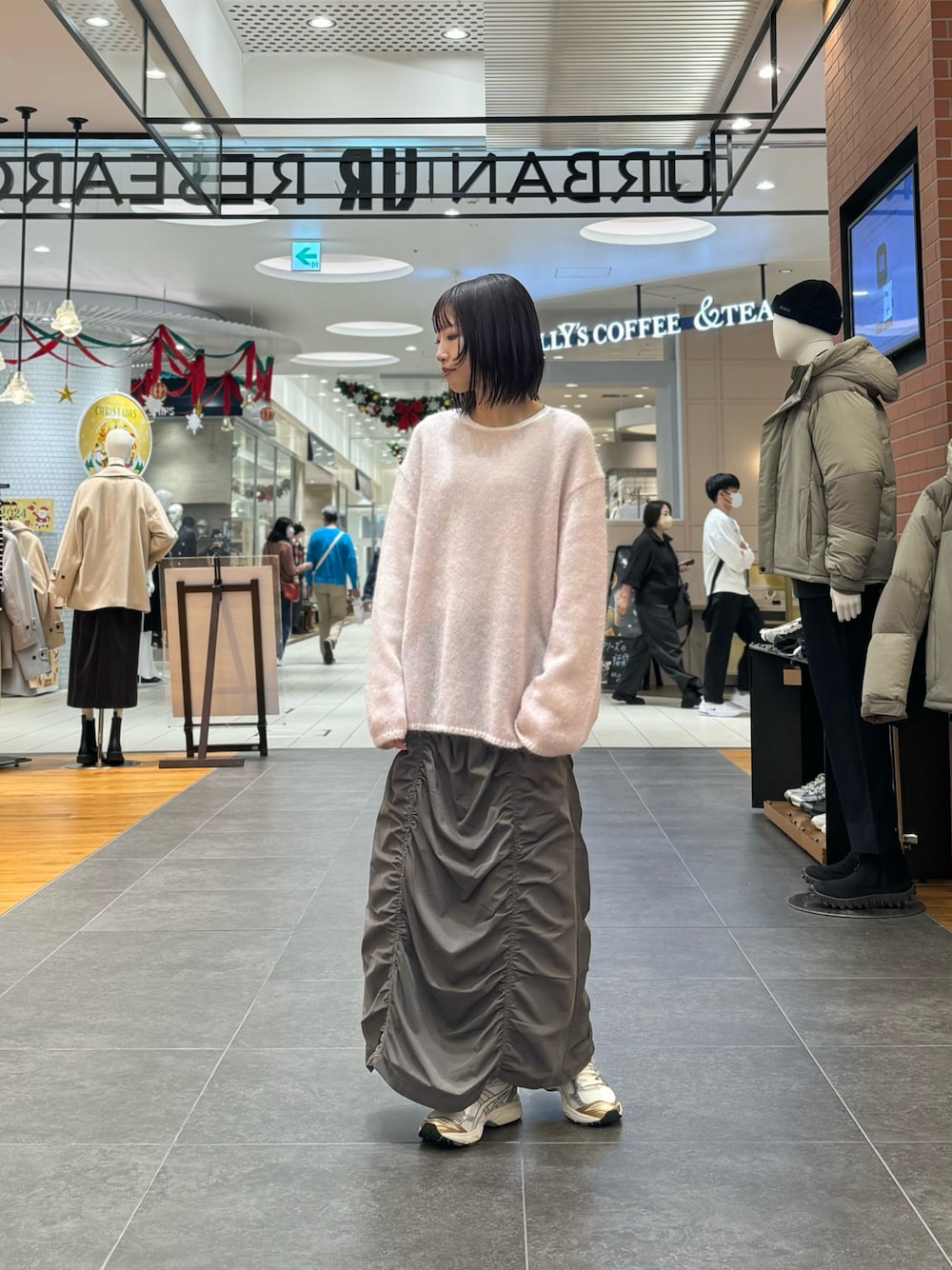 ローゲージのニットやボリュームのあるトップスを合わせるとカジュアルな抜け感のあるスタイリングに。