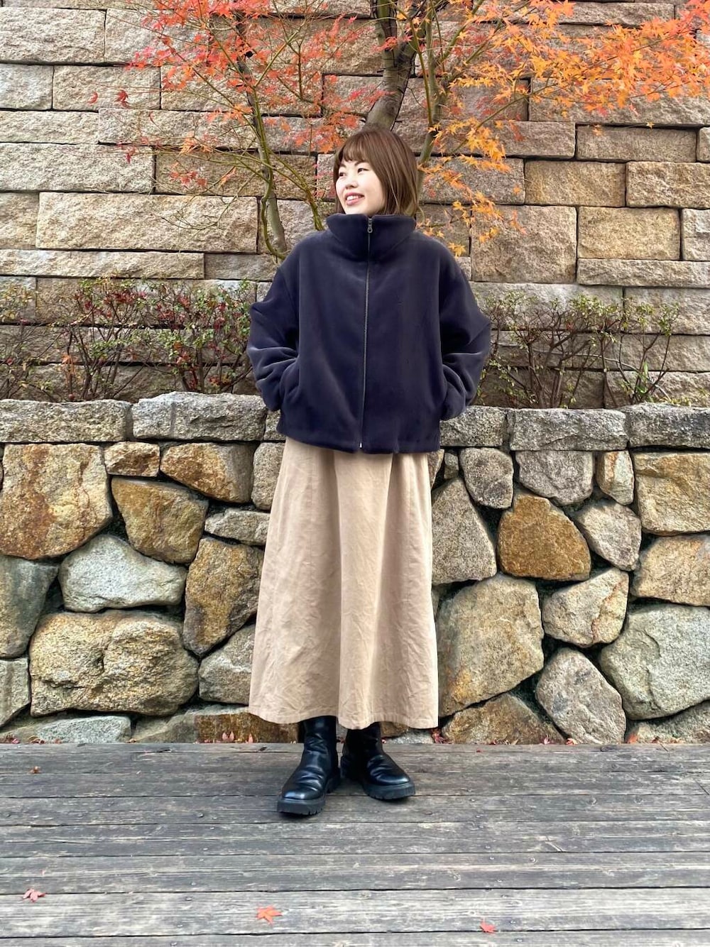 【サイズ感】フリーサイズですが、足首がすっきりでる長さでした。腕回りや身幅は程よくゆとりがあり、冬は厚めのニットも着込めそうです◎