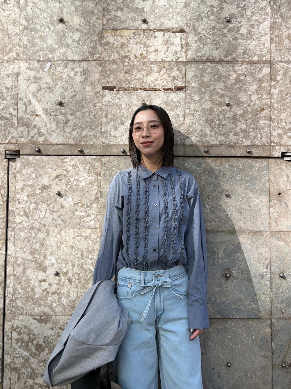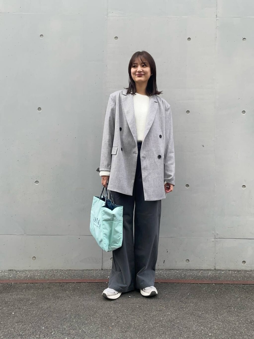 ルーズなシルエットと袖ぐりに余裕があるため、寒い時期にはニットなども着込めるサイズ感です。肩部分には極薄のパッドを入れており、肩が張らずにすっきりとした印象に。