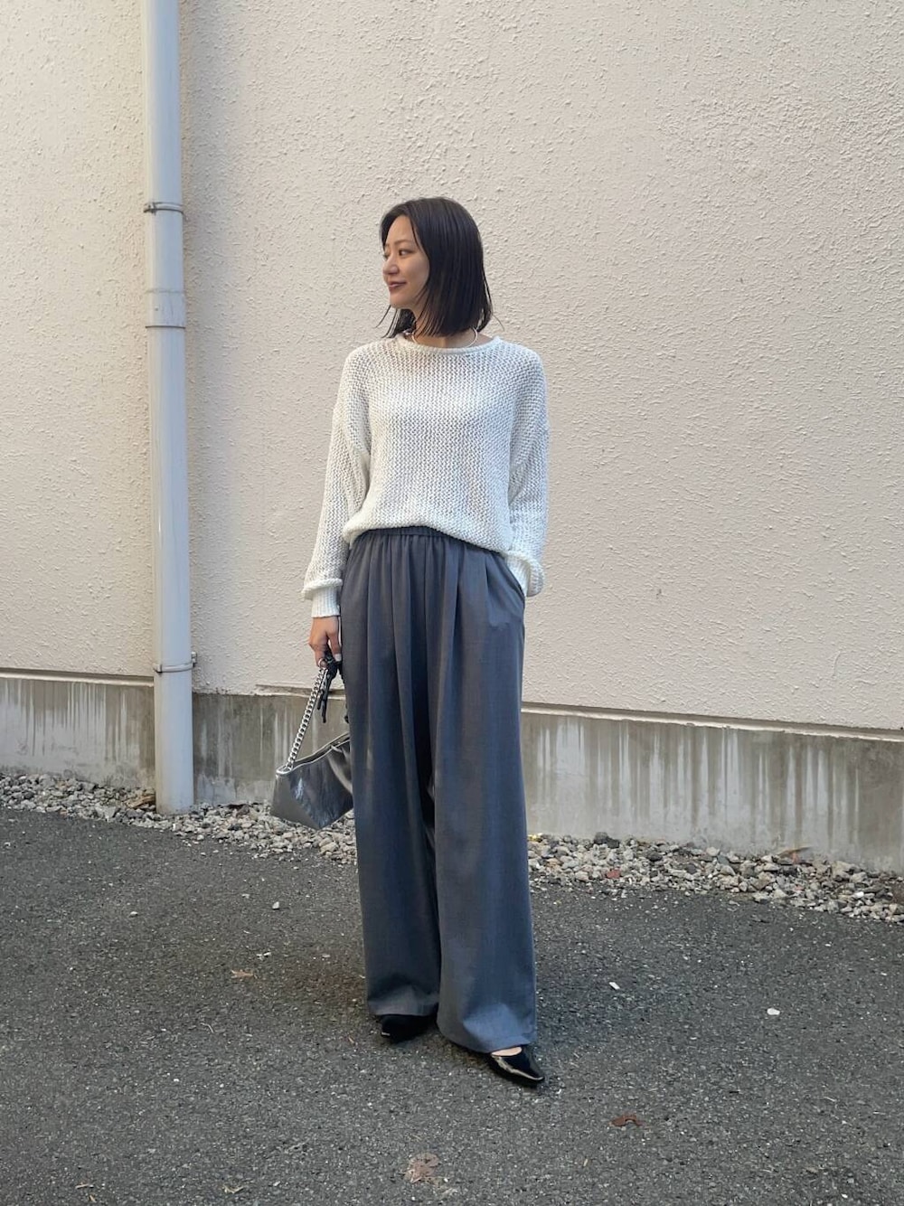 裾に少し伸縮性を持たせてウエストで留まるデザインにすることで、スラックスやボリュームスカートなど、どんなボトムスともバランスよく合わせられます。