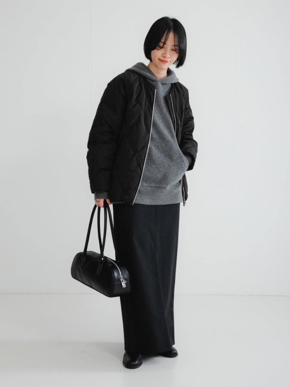 ダイヤ柄のキルトステッチが特徴的な一着。ダウン特有のカジュアルさや着ぶくれ感が苦手な方にもおすすめです。光沢を抑えたマットな素材感が、きれいめな着こなしにも馴染みます。