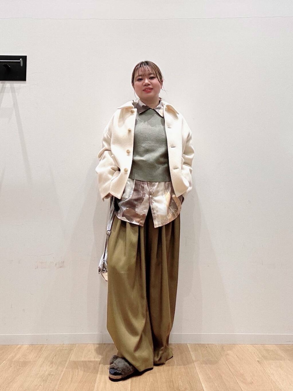 シーズンムード高まるテディベアのようなモコモコ感あふれるボアと、ゴールドの大きめのバックルが存在感のある足元を演出します。