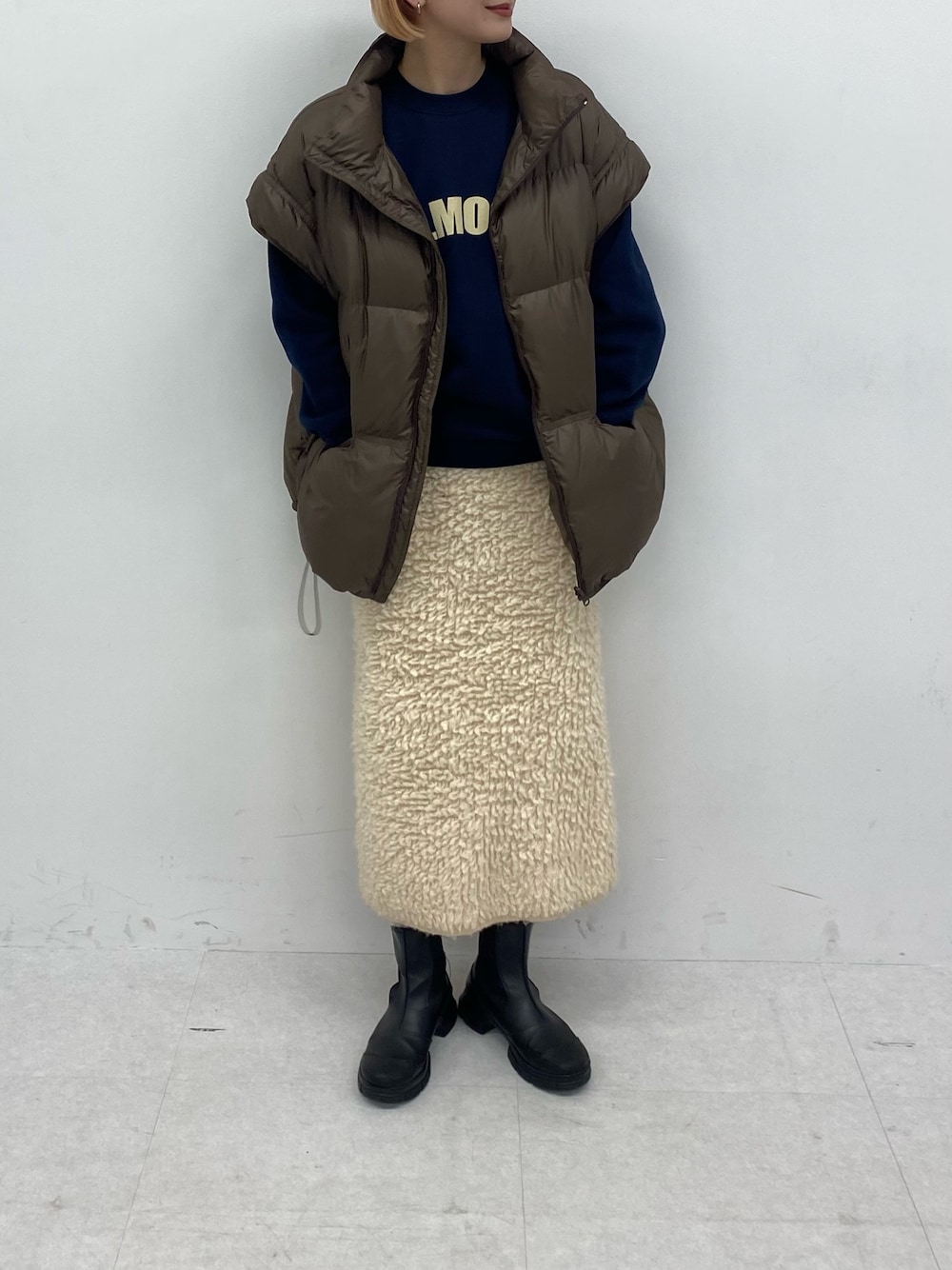 ふんわりループ編みが描く立体感で、冬の装いを優しく包み込むニットスカート