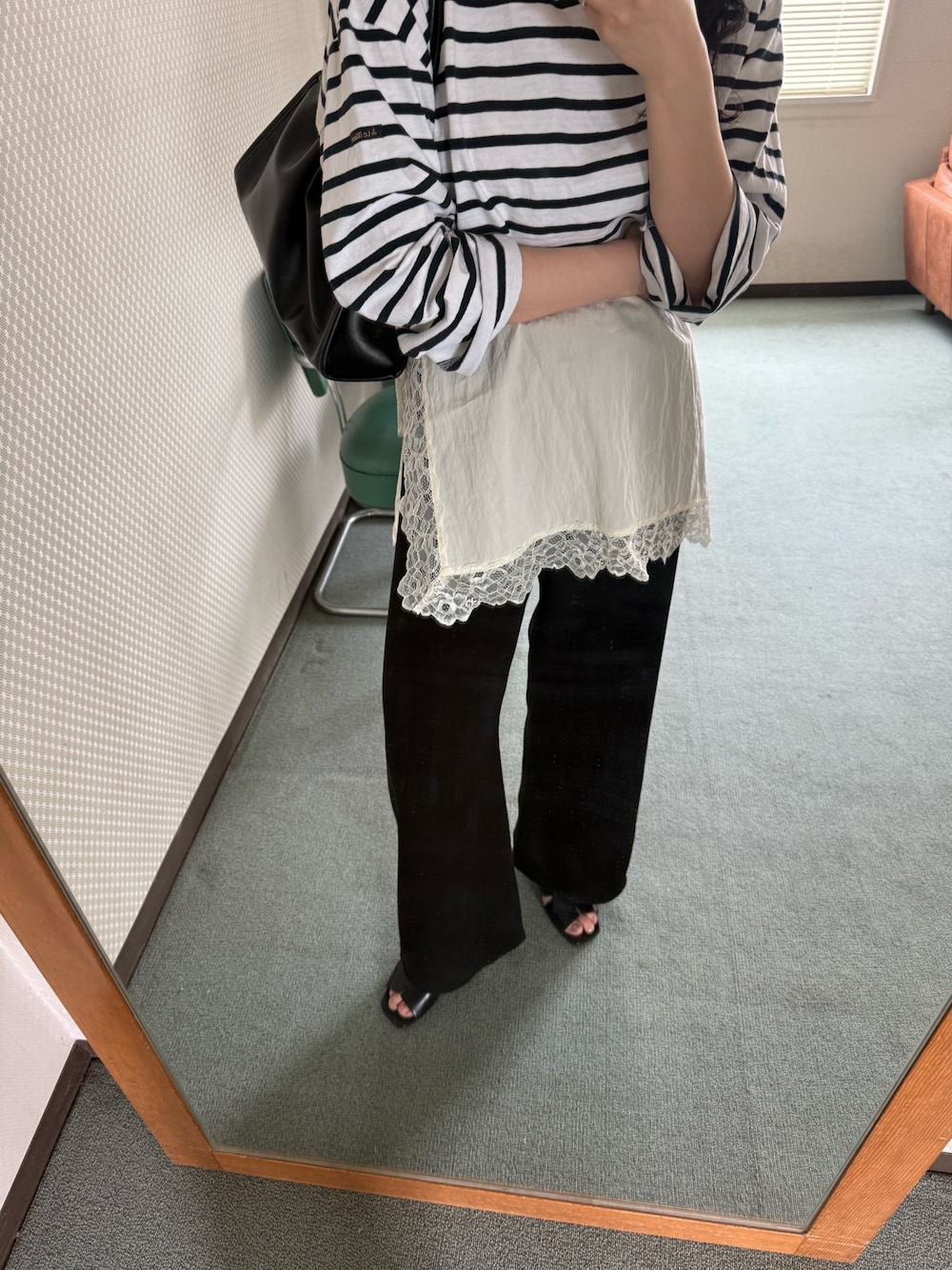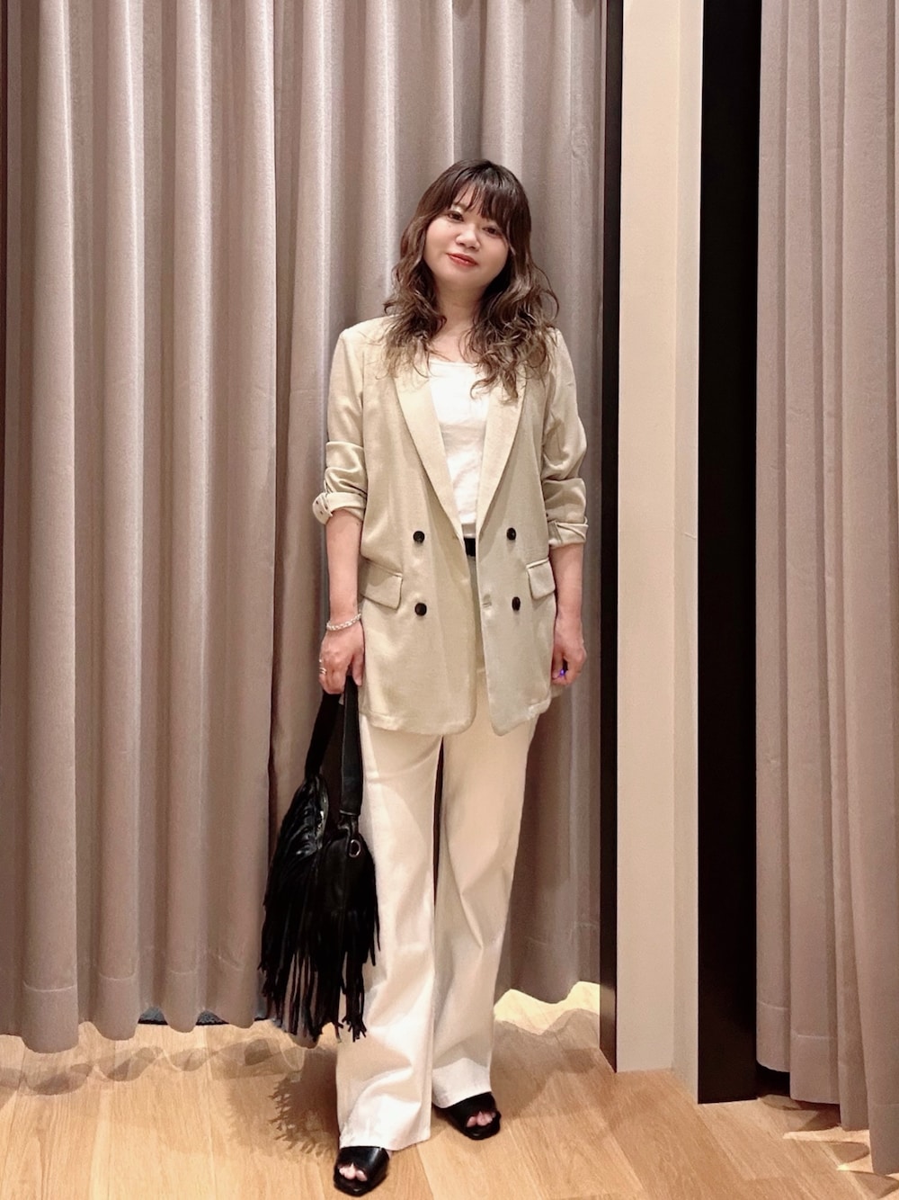 きれいめなスラックスを合わせれば、落ち着いた雰囲気のスタイルが完成します。 マキシ丈のワンピースと合わせて、リラックス感のある大人な装いにまとめるのもおすすめです。