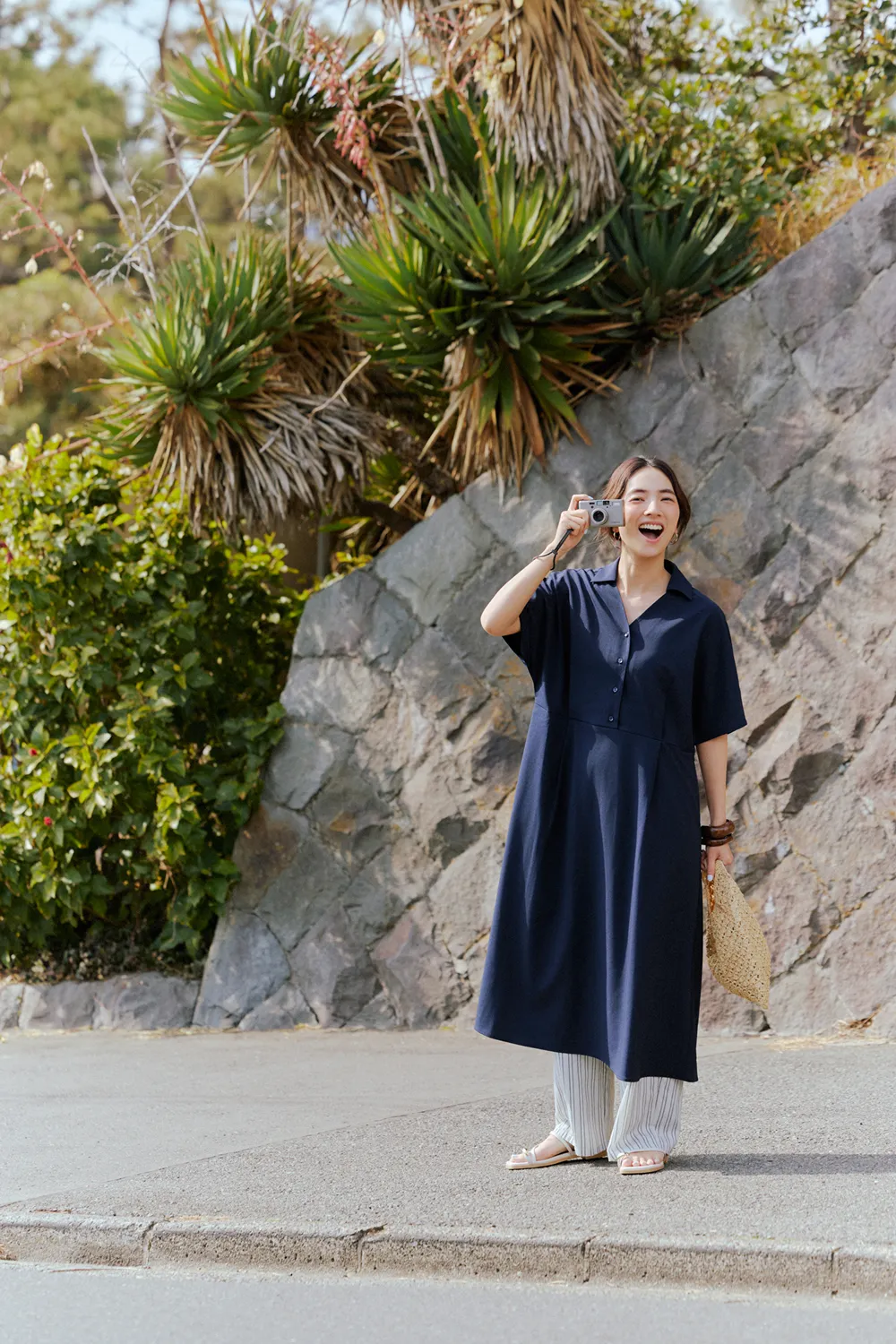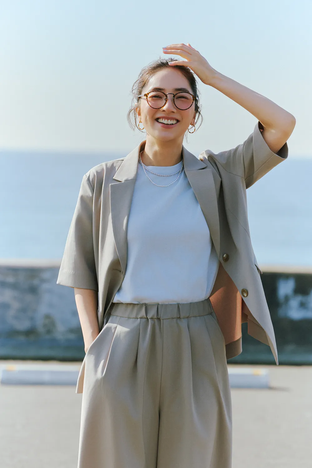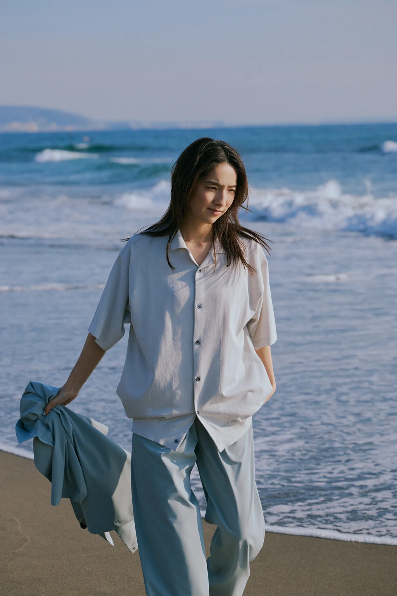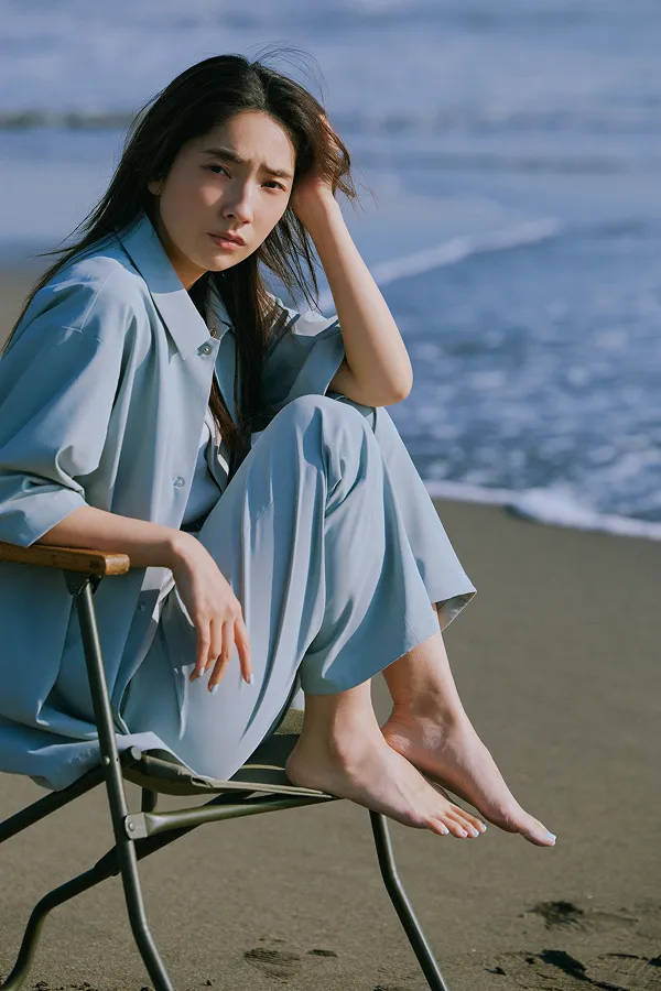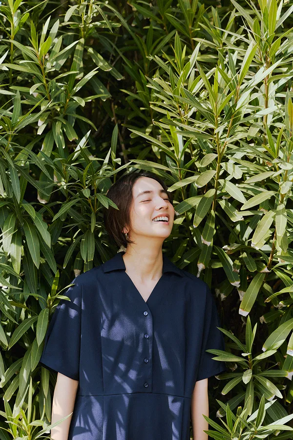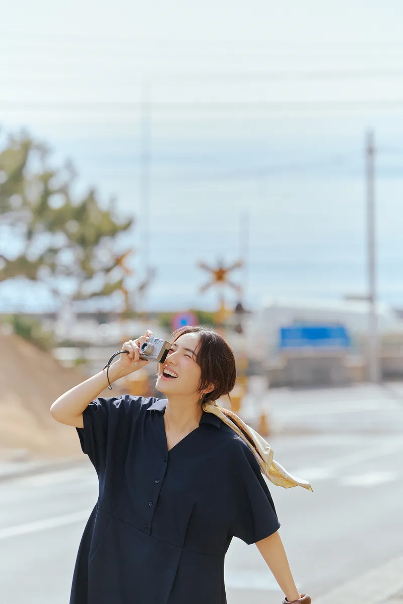 仁村さん:ネイビーのワンピースを着て撮影している時が一番ノリノリだった気がします。スカーフを巻いて、ヘアスタイルも可愛かった。それを着て、海に行きたいですね。UR TECHと海の相性は◎じゃないですか。さっきメンズの服を着て砂浜で撮影したんですが、砂がまとわりつかないというか、パパパってやったらすぐにサラサラになるんです。あとは、カメラを持って犬を連れて行きたいです。犬は毛むくじゃらなので砂だらけになりそうですけどね。犬用のUR TECHが開発されたらいいのに!