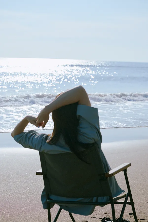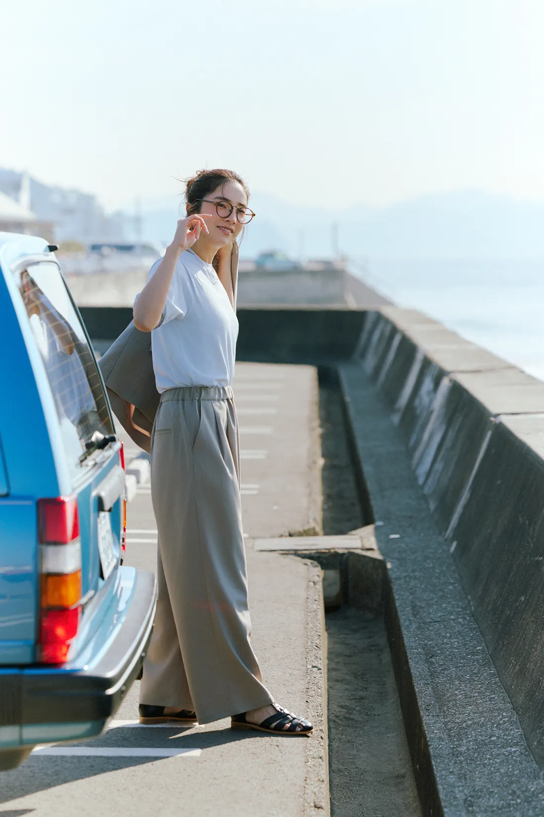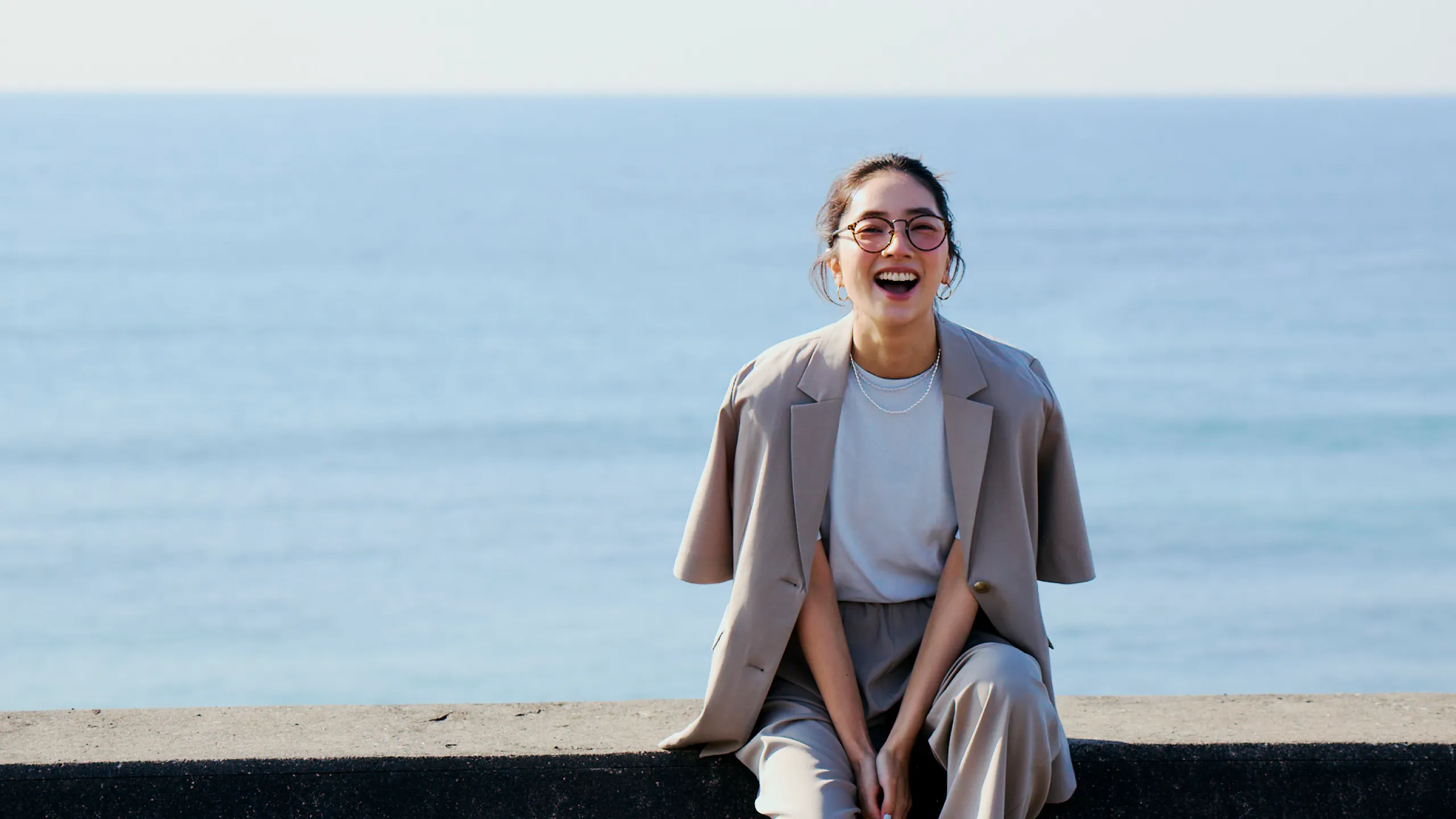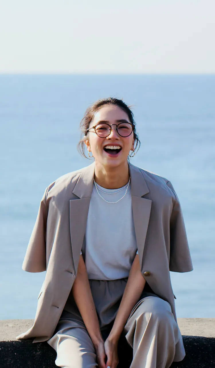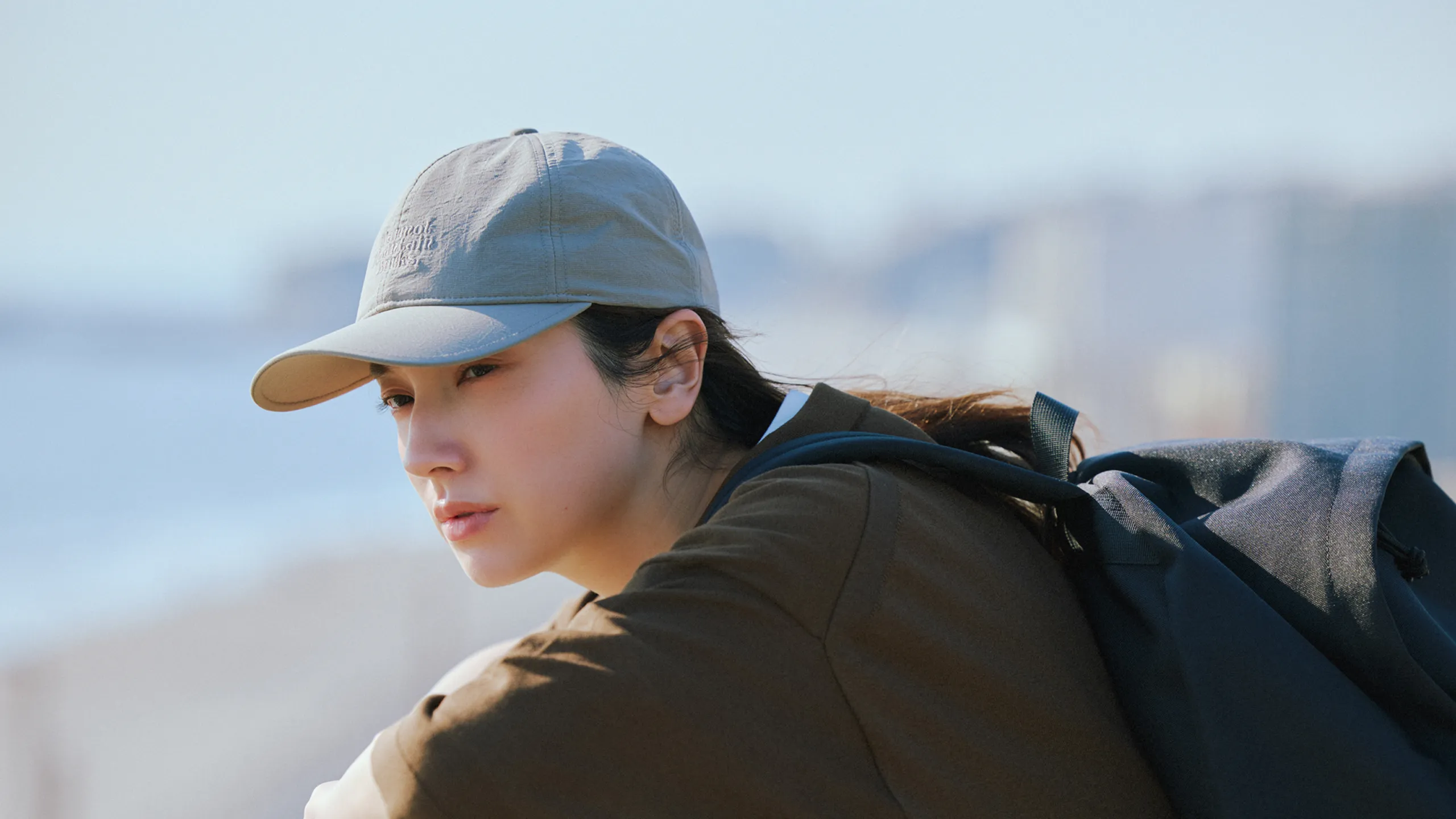 仁村さん:ネイビーのワンピースを着て撮影している時が一番ノリノリだった気がします。スカーフを巻いて、ヘアスタイルも可愛かった。それを着て、海に行きたいですね。UR TECHと海の相性は◎じゃないですか。さっきメンズの服を着て砂浜で撮影したんですが、砂がまとわりつかないというか、パパパってやったらすぐにサラサラになるんです。あとは、カメラを持って犬を連れて行きたいです。犬は毛むくじゃらなので砂だらけになりそうですけどね。犬用のUR TECHが開発されたらいいのに!