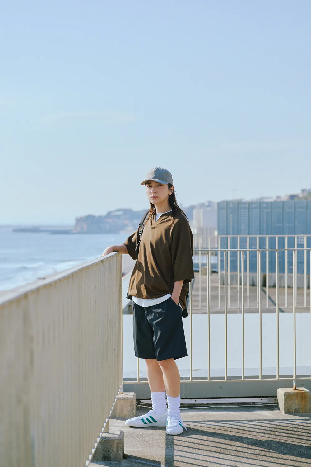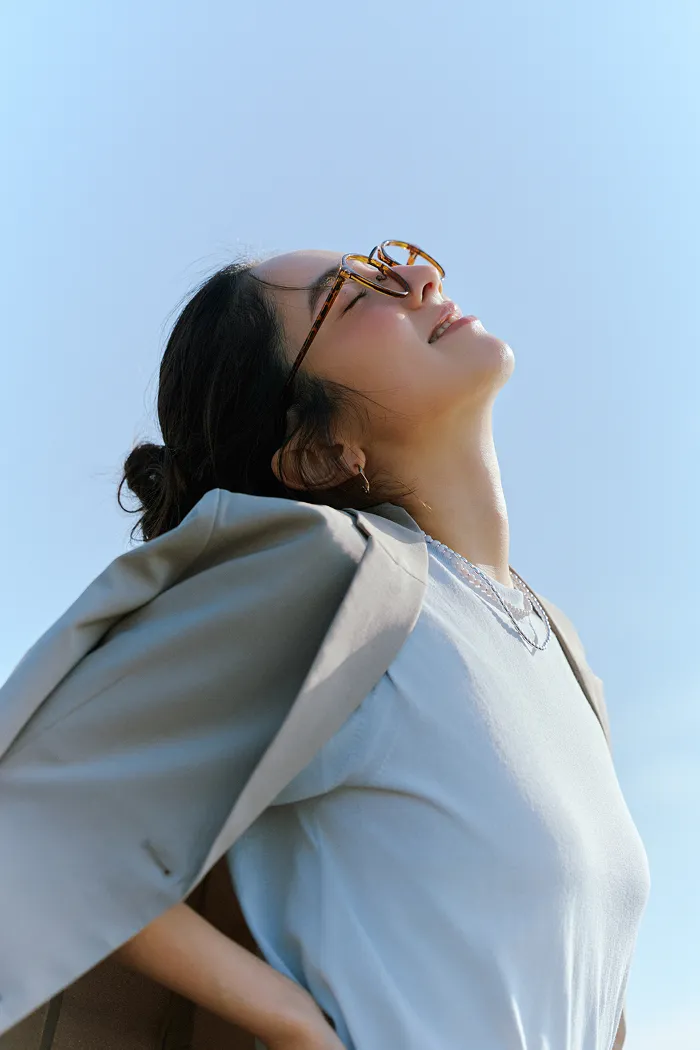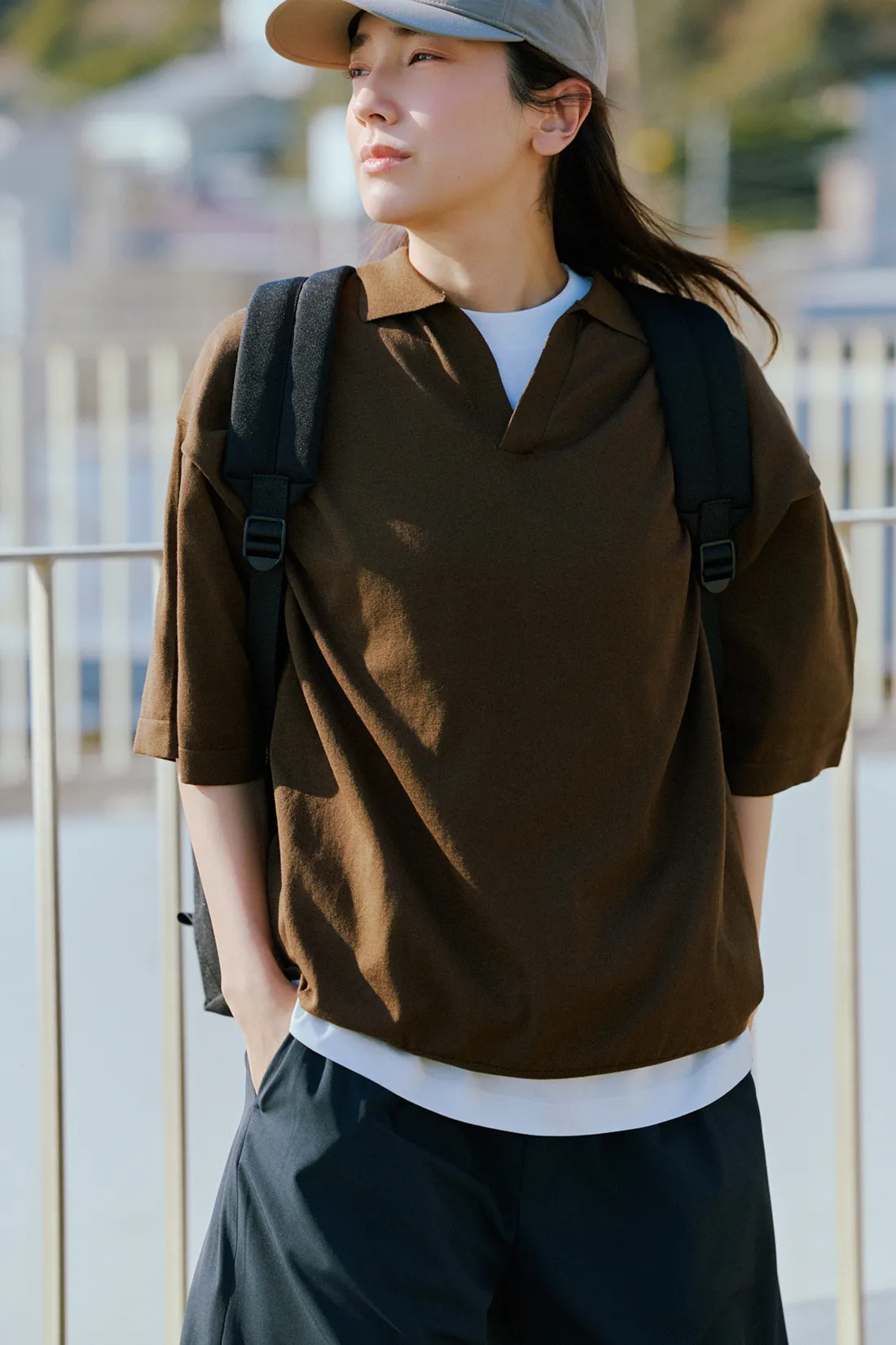 「完声」シリーズのドルマンスリーブシャツを羽織ってカフェに立ち寄り。ドライなタッチで、UVカットや速乾機能付きの素材が夏の羽織りに嬉しい。体型カバーしてくれるゆったりしたドルマンシルエット。