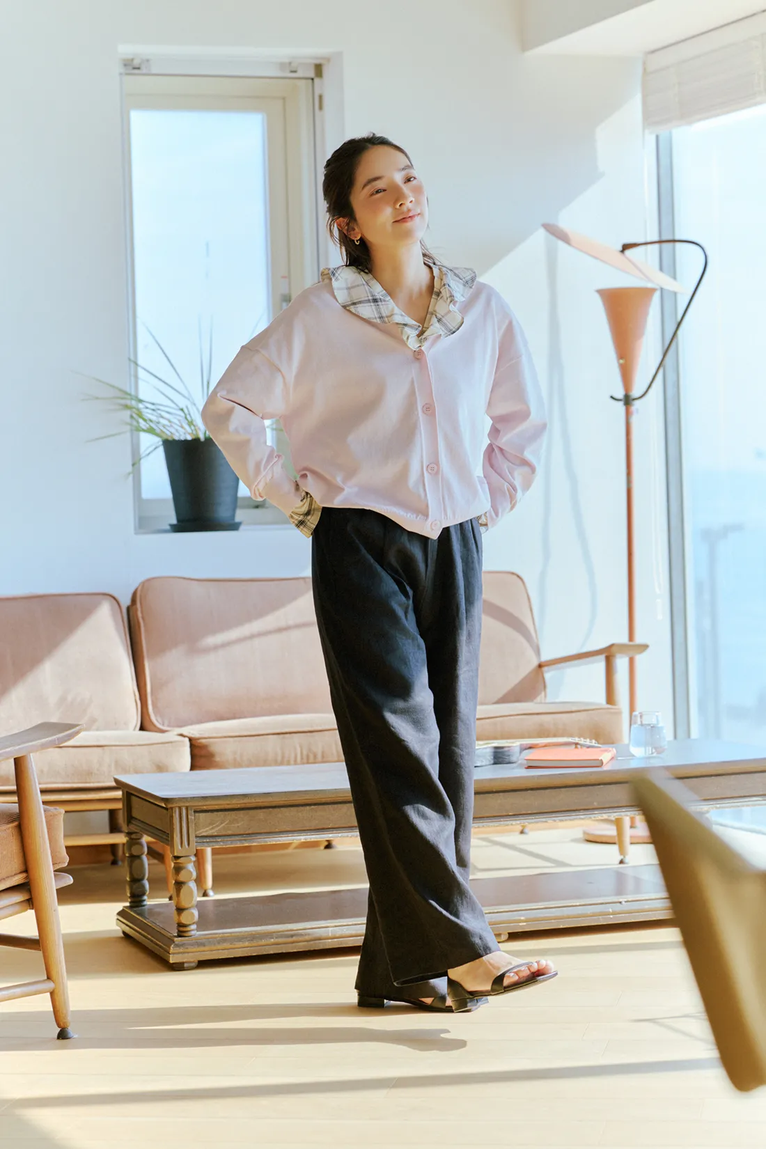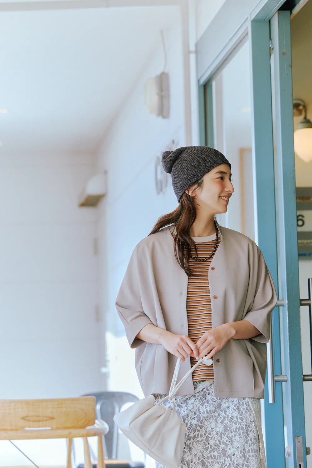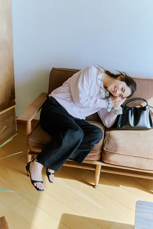 友人宅を訪れる日には、「サマシェア」の新素材・ニットのカーディガンにフェミニンなブラウスを重ねてコーディネート。シンプルなVネックデザインだから、インナーを選ばないのが魅力。夏の日除けに最適な一着です。
