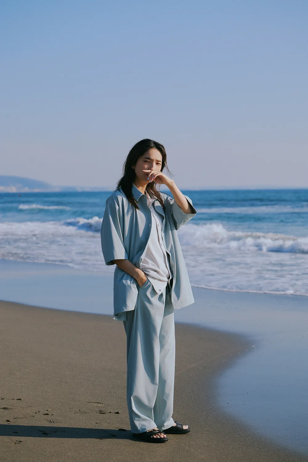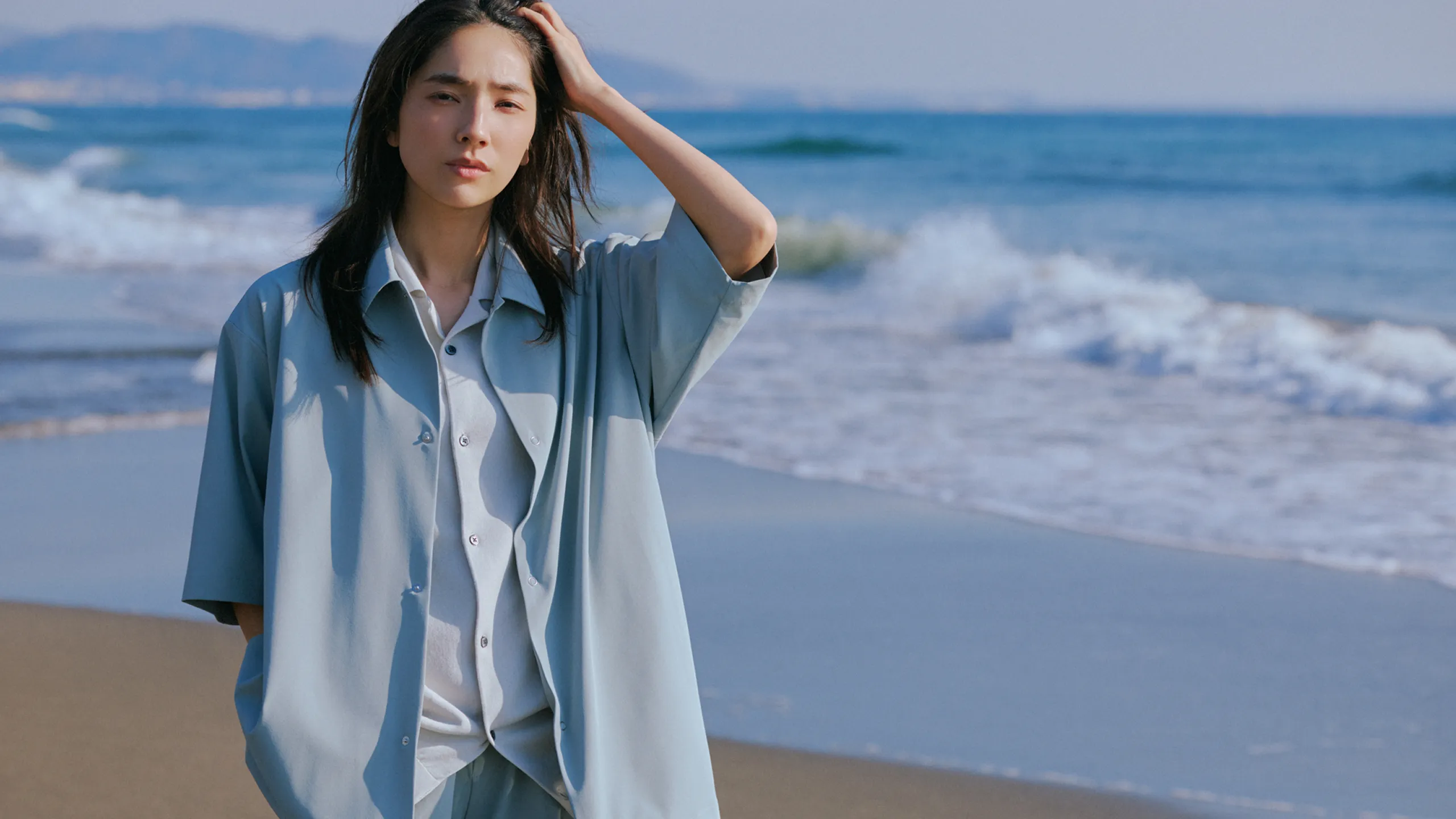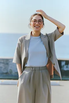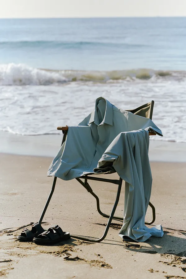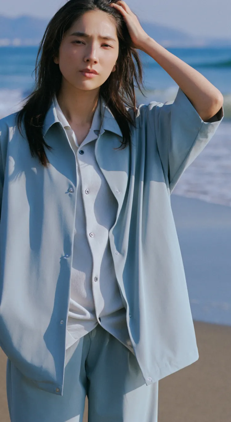 メンズの「サマシェア」シリーズにも新作が続々登場。シャツとイージートラウザーをセットアップで着用し、インナーにはニットカーディガンをチョイス。海辺などのアウトドアシーンでも気兼ねない機能が心強い。