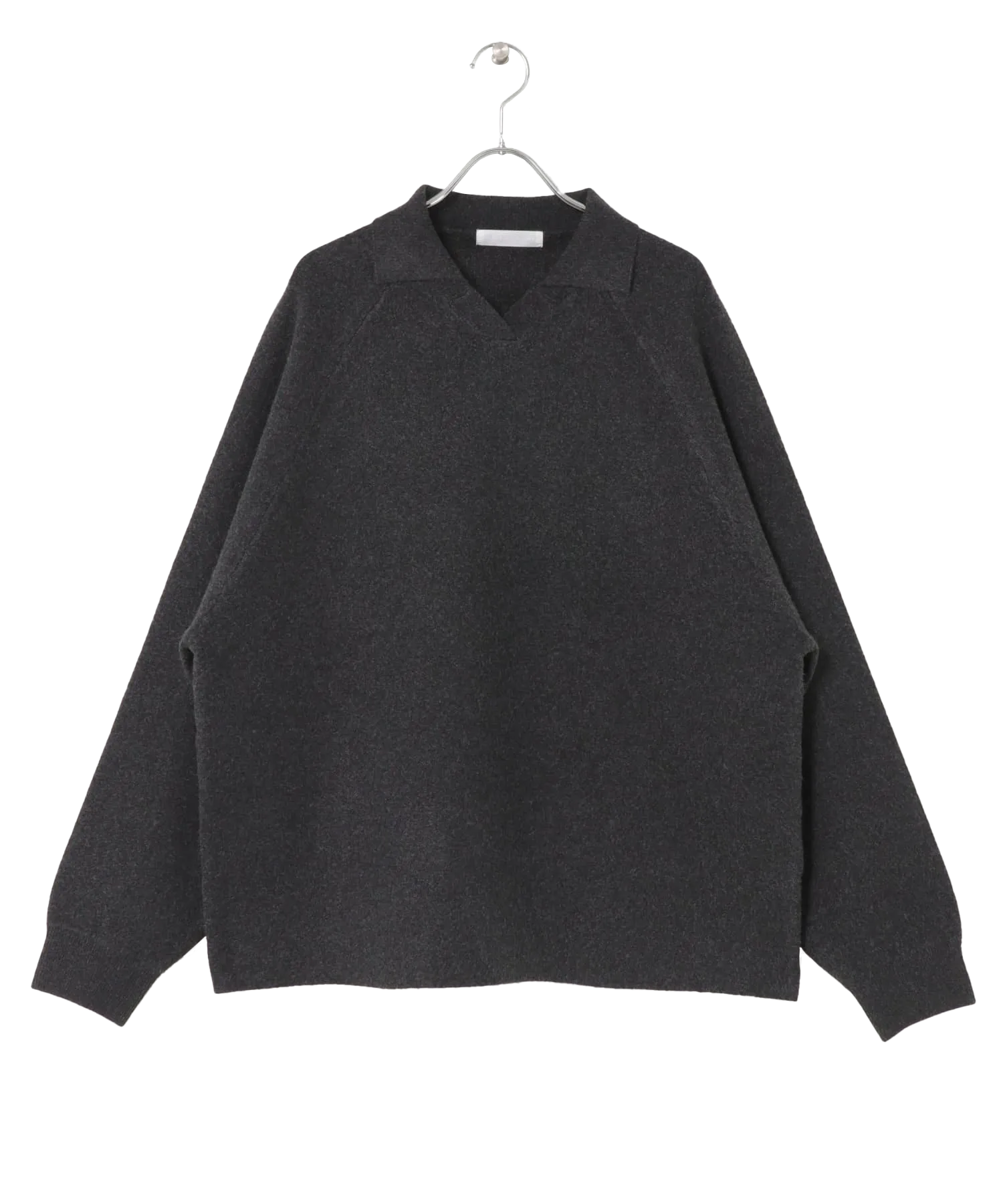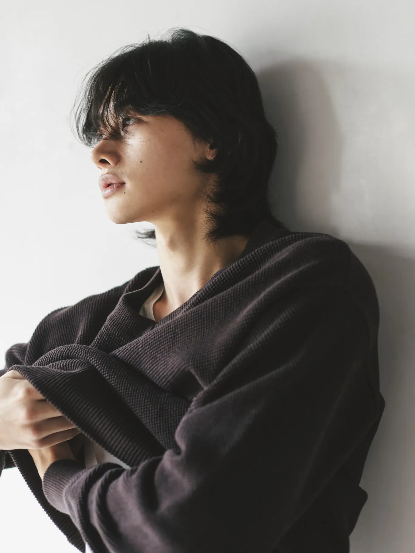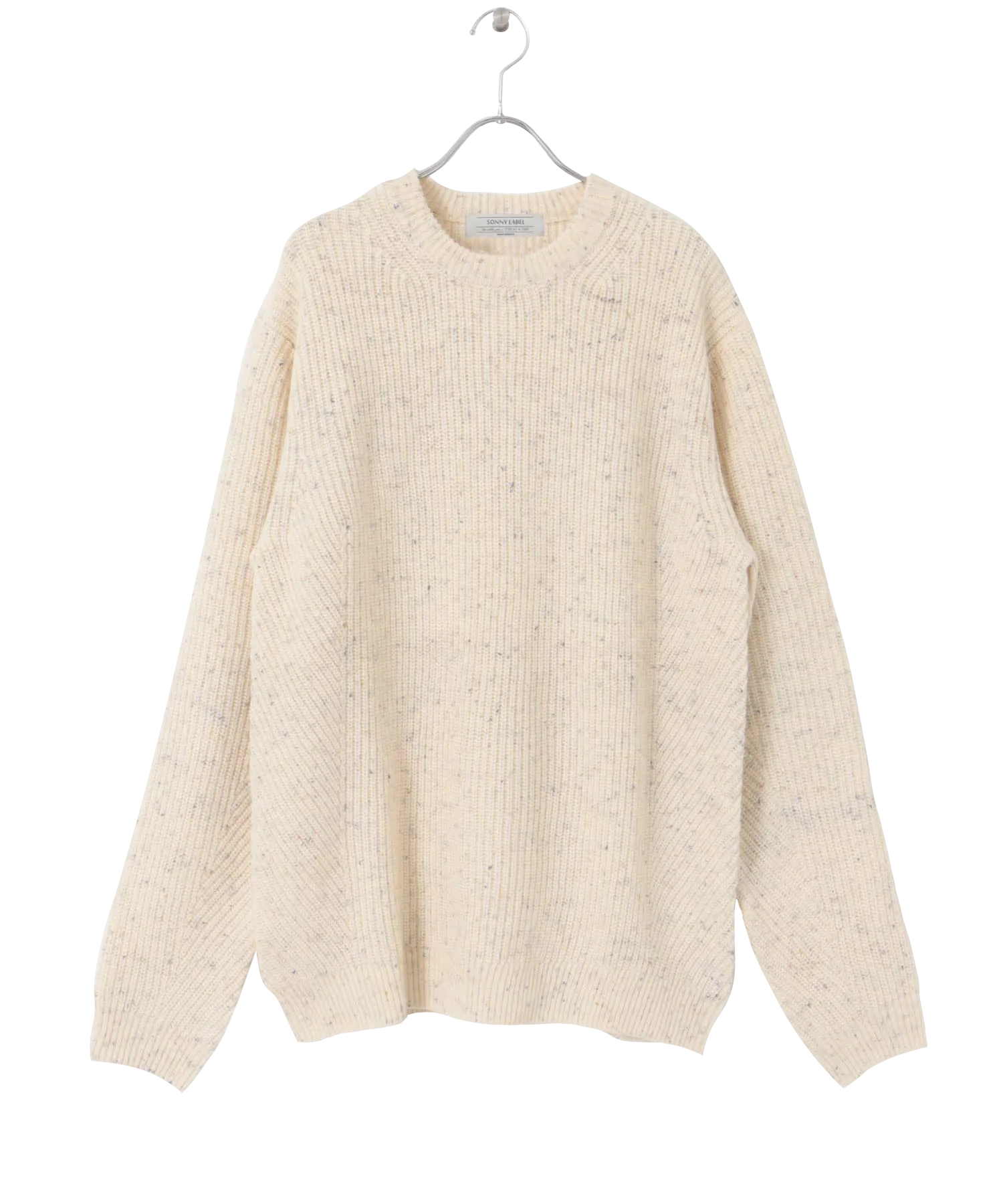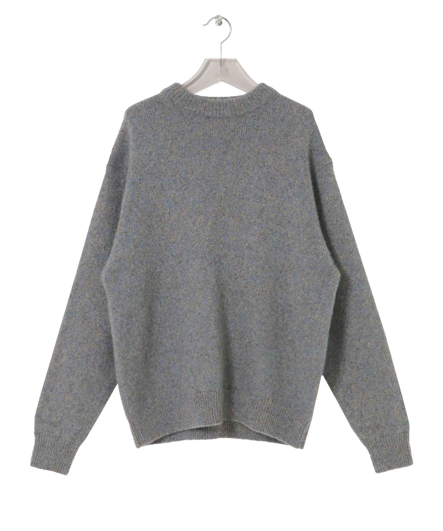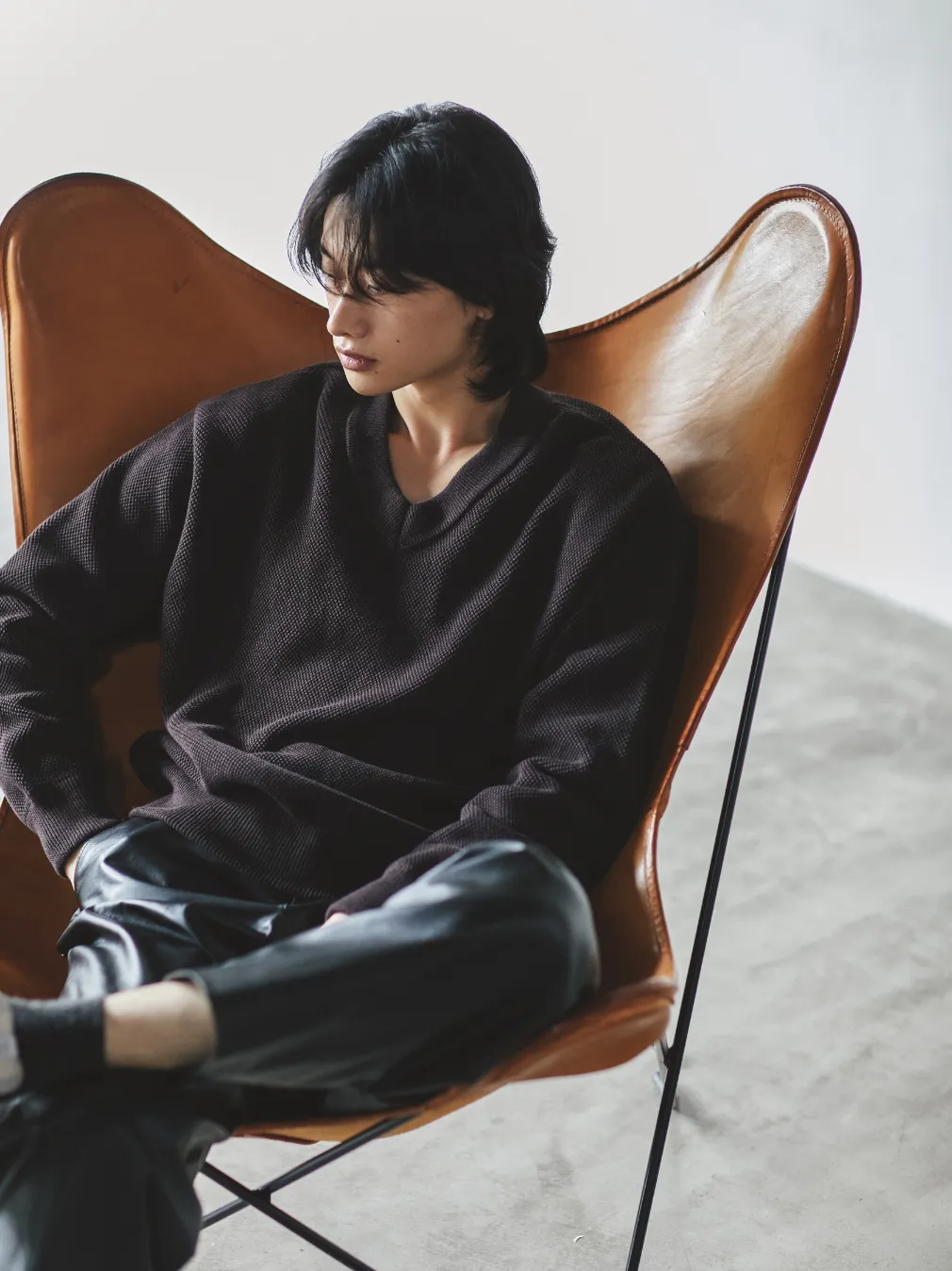 crepusculeに別注した特別感のあるニット。インラインにはない型と色をゼロから採用し、3色の撚り杢生地で独特の風合いに仕上げました。ネックラインを浅めに設定することで、上品さと着回しの良さを両立しています。