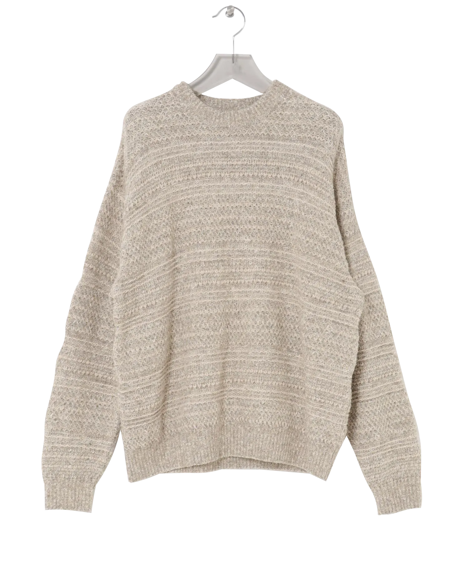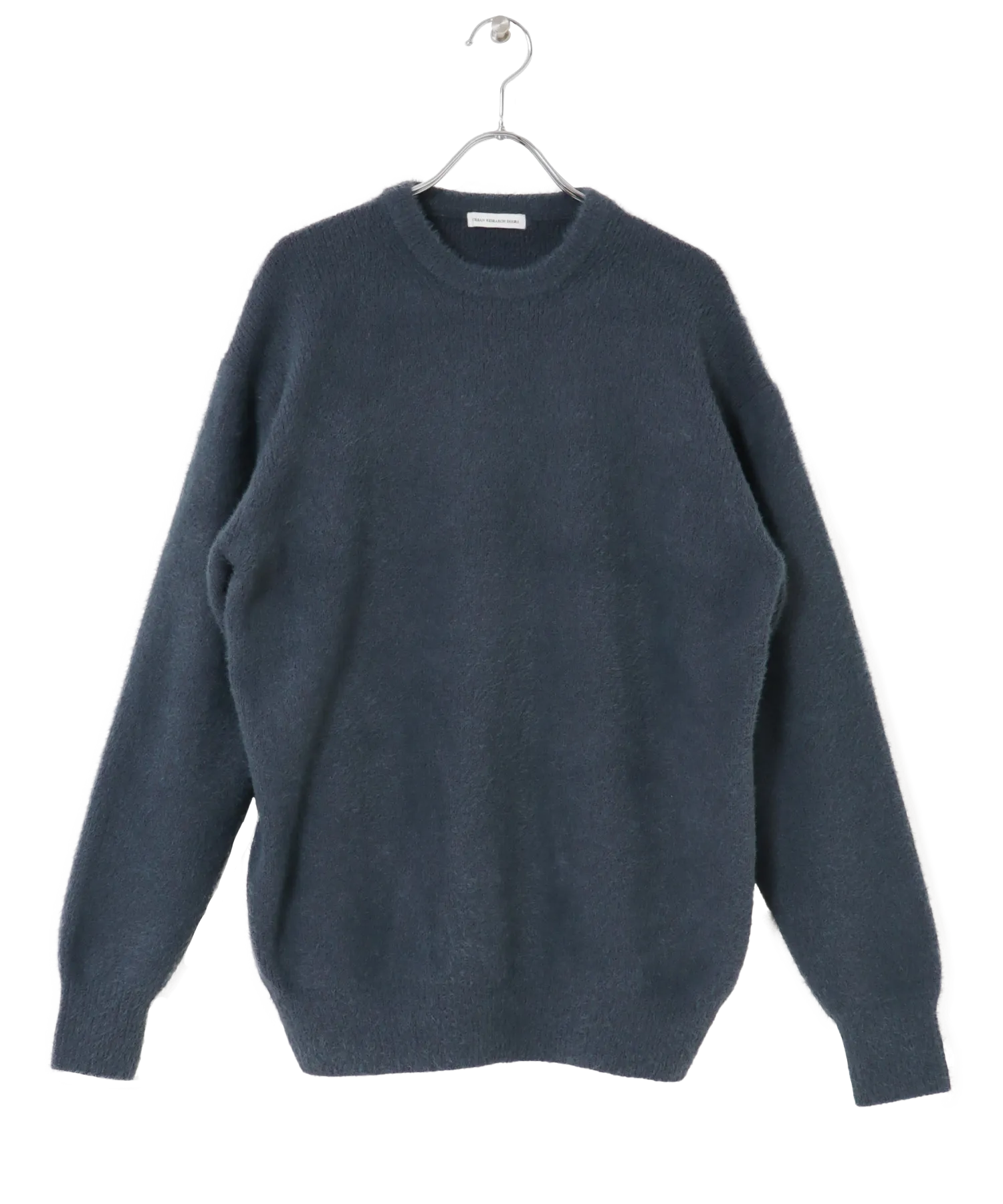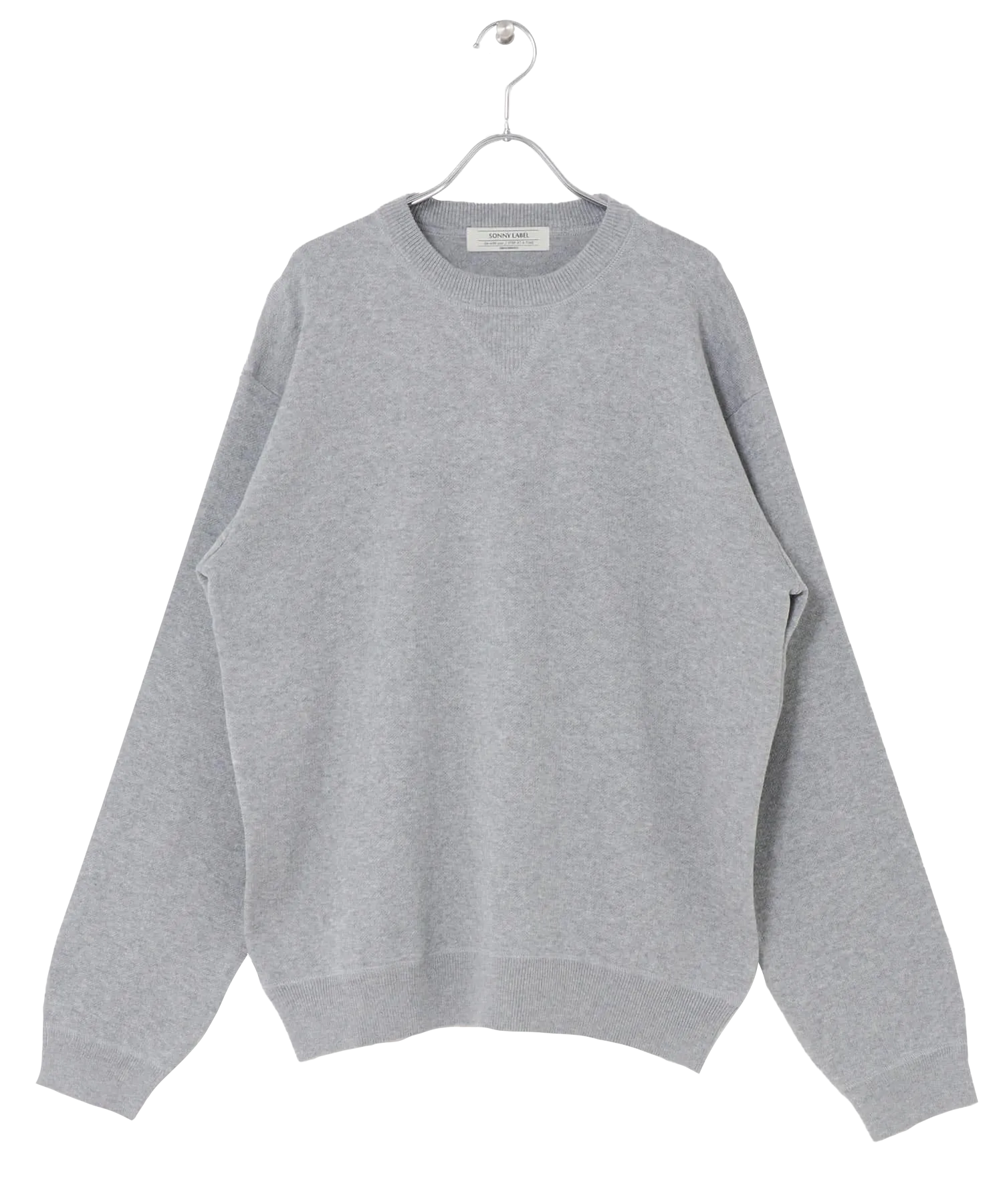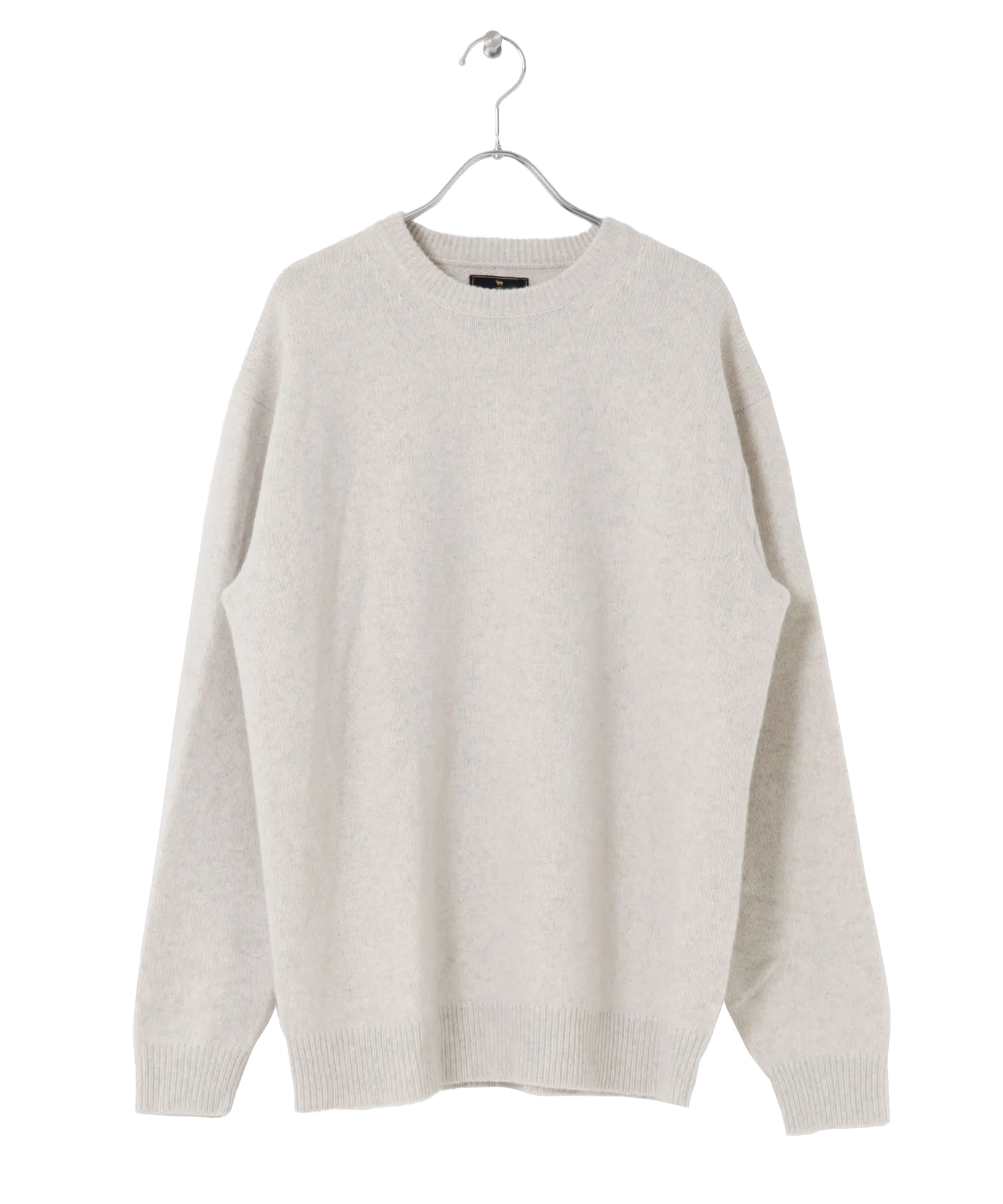 crepusculeに別注した特別感のあるニット。インラインにはない型と色をゼロから採用し、3色の撚り杢生地で独特の風合いに仕上げました。ネックラインを浅めに設定することで、上品さと着回しの良さを両立しています。